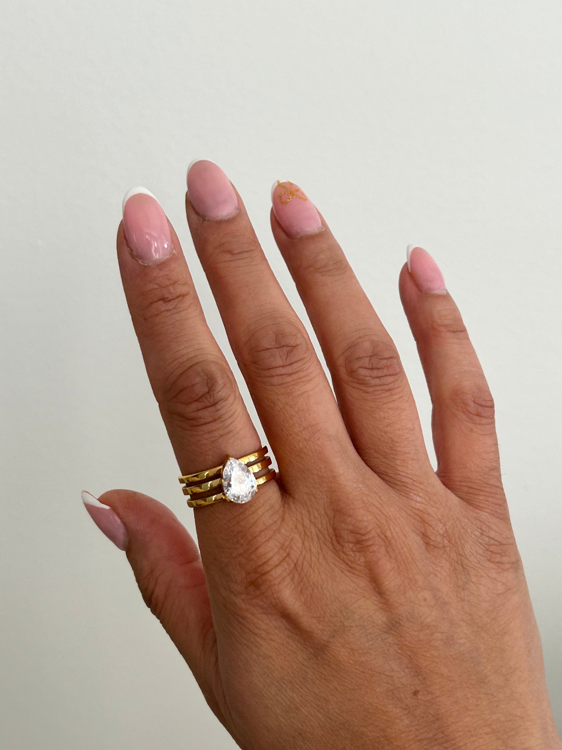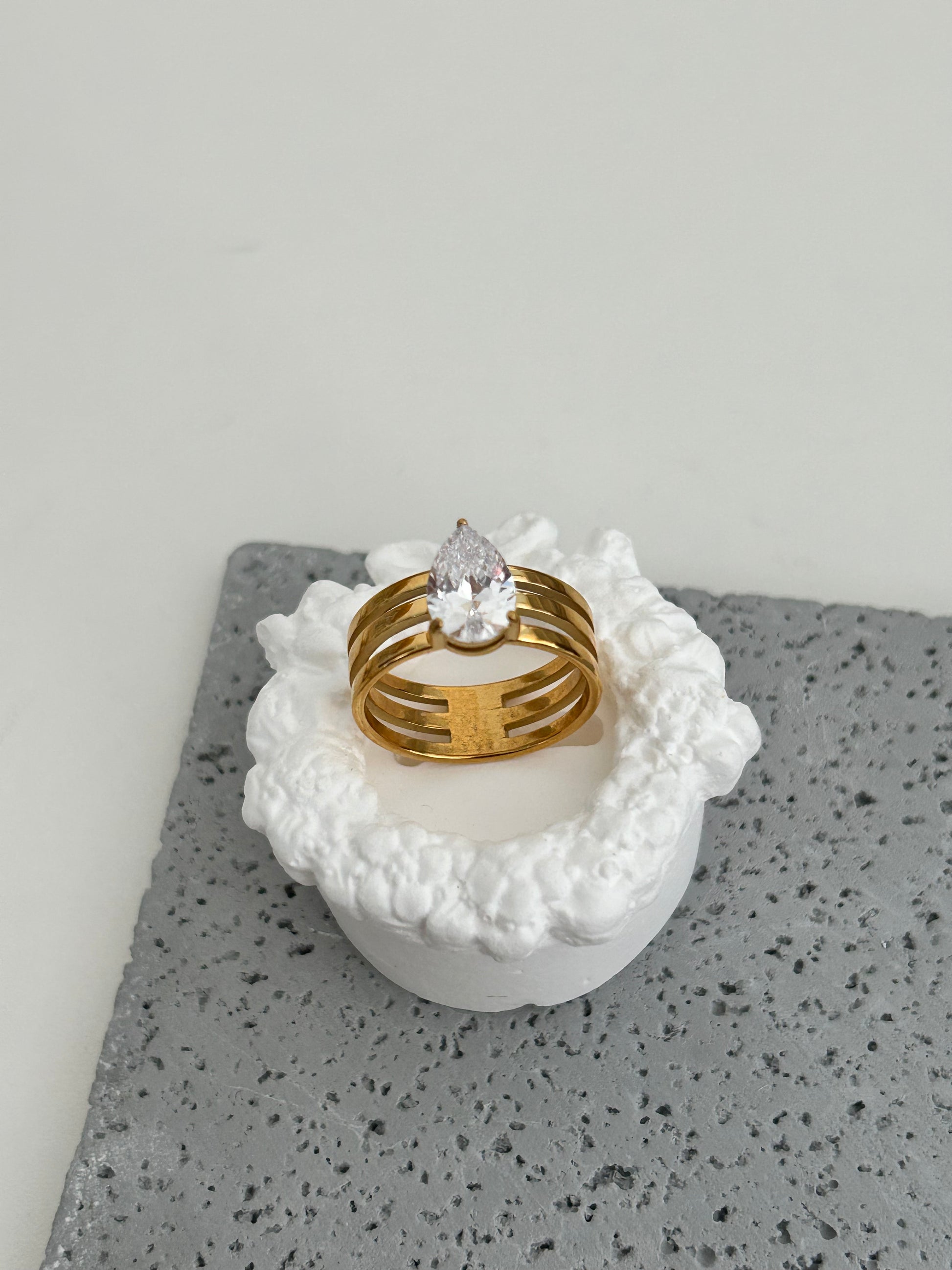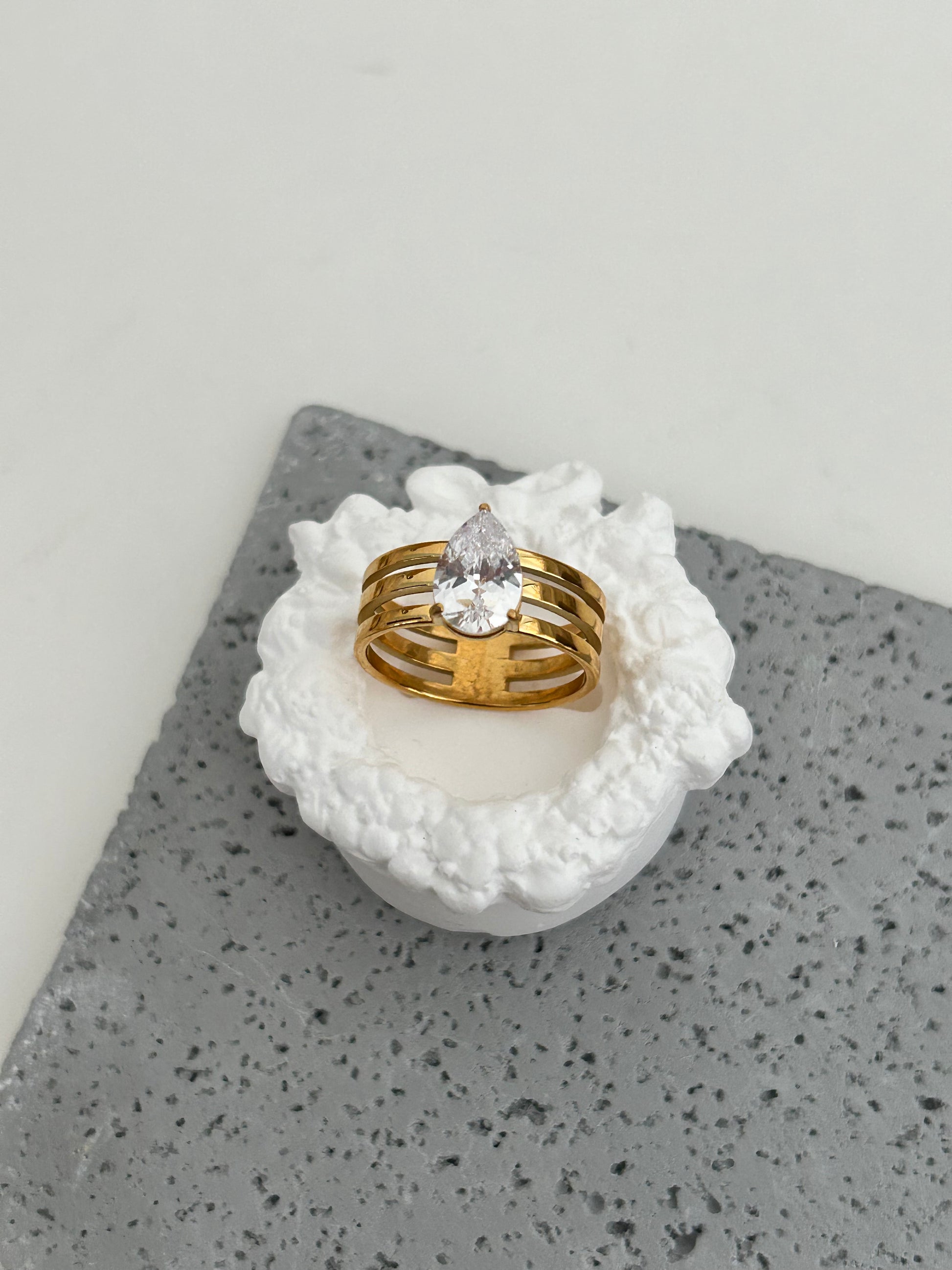 The Jayla ring is a celebration of strength and elegance. Featuring a captivating pear-cut crystal—reminiscent of a single, luminous teardrop—this piece rests atop a bold multi-band base crafted from stainless steel and plated in radiant 18K gold.