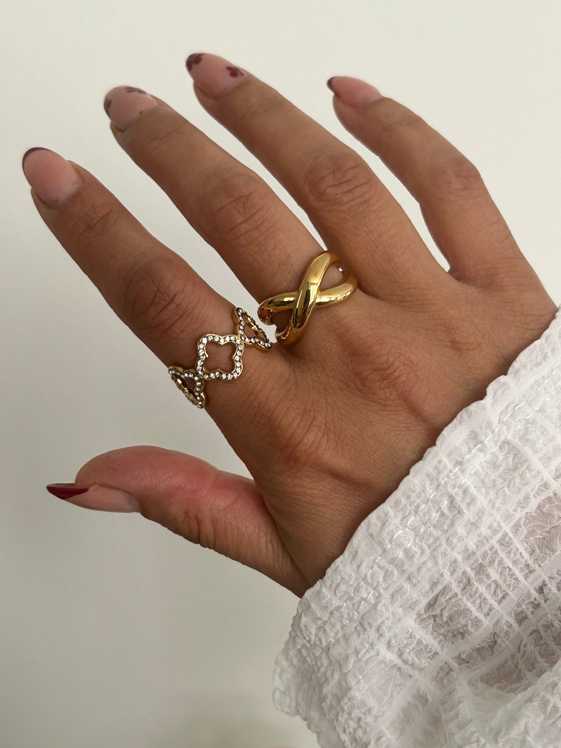 Introducing the Manal ring, an Adjustable Gold sparkle Clover Ring and a versatile addition to your jewelry collection. Crafted with adjustable gold, this ring offers a perfect fit for every finger. With its elegant sparkling stone clover design and versatility, this ring is perfect for any occasion. Elevate your style with the Manal ring.
