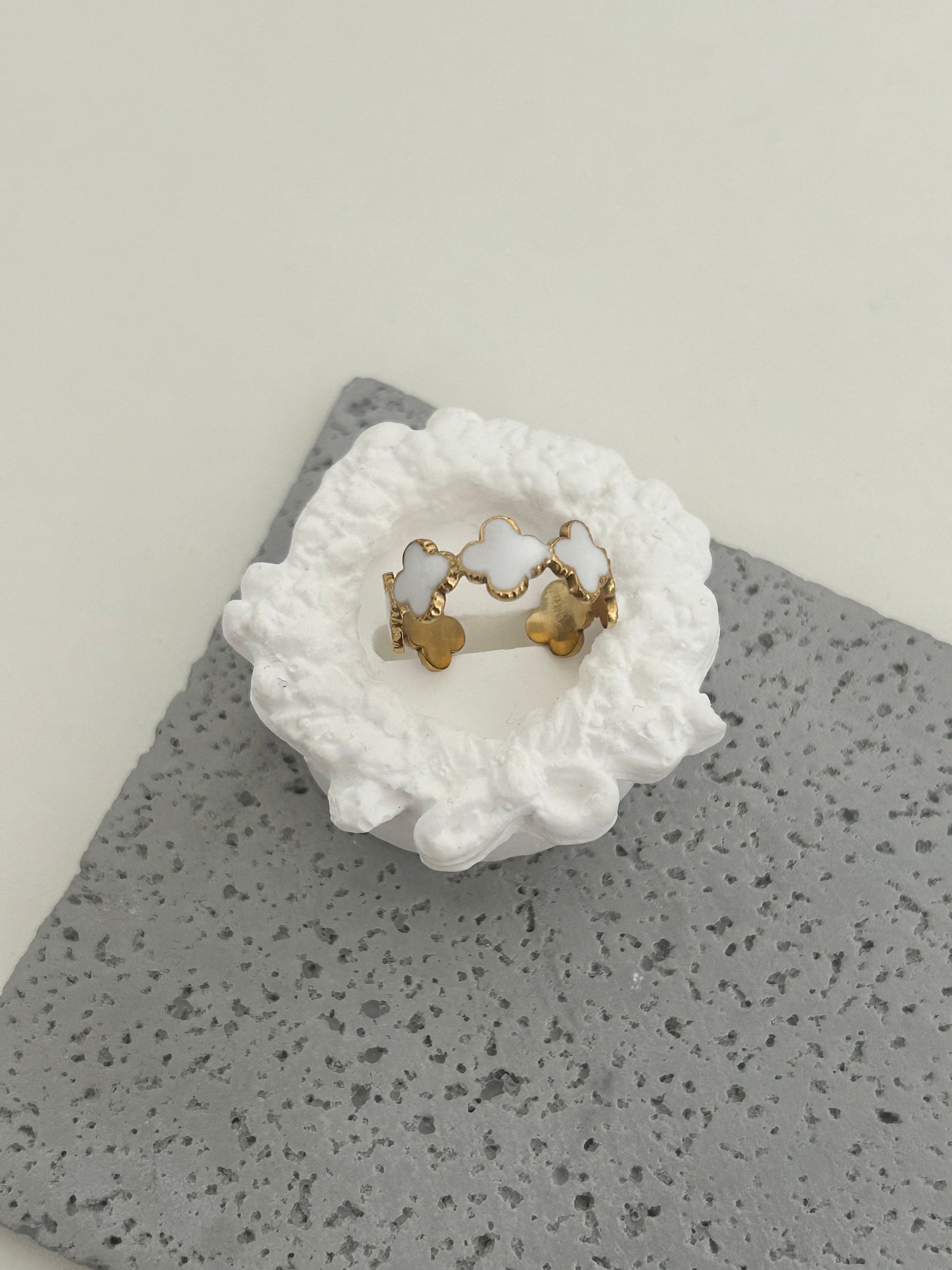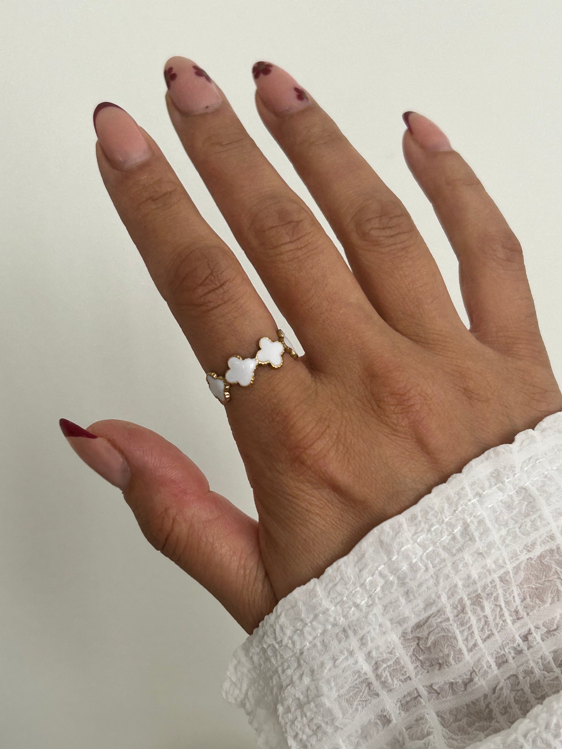 Introducing the Nova ring, an Adjustable Gold Ring and a versatile addition to your jewelry collection. Crafted with adjustable gold, this ring offers a perfect fit for every finger. With its elegant white enamel clover design and versatility, this ring is perfect for any occasion. Elevate your style with the Nova ring.