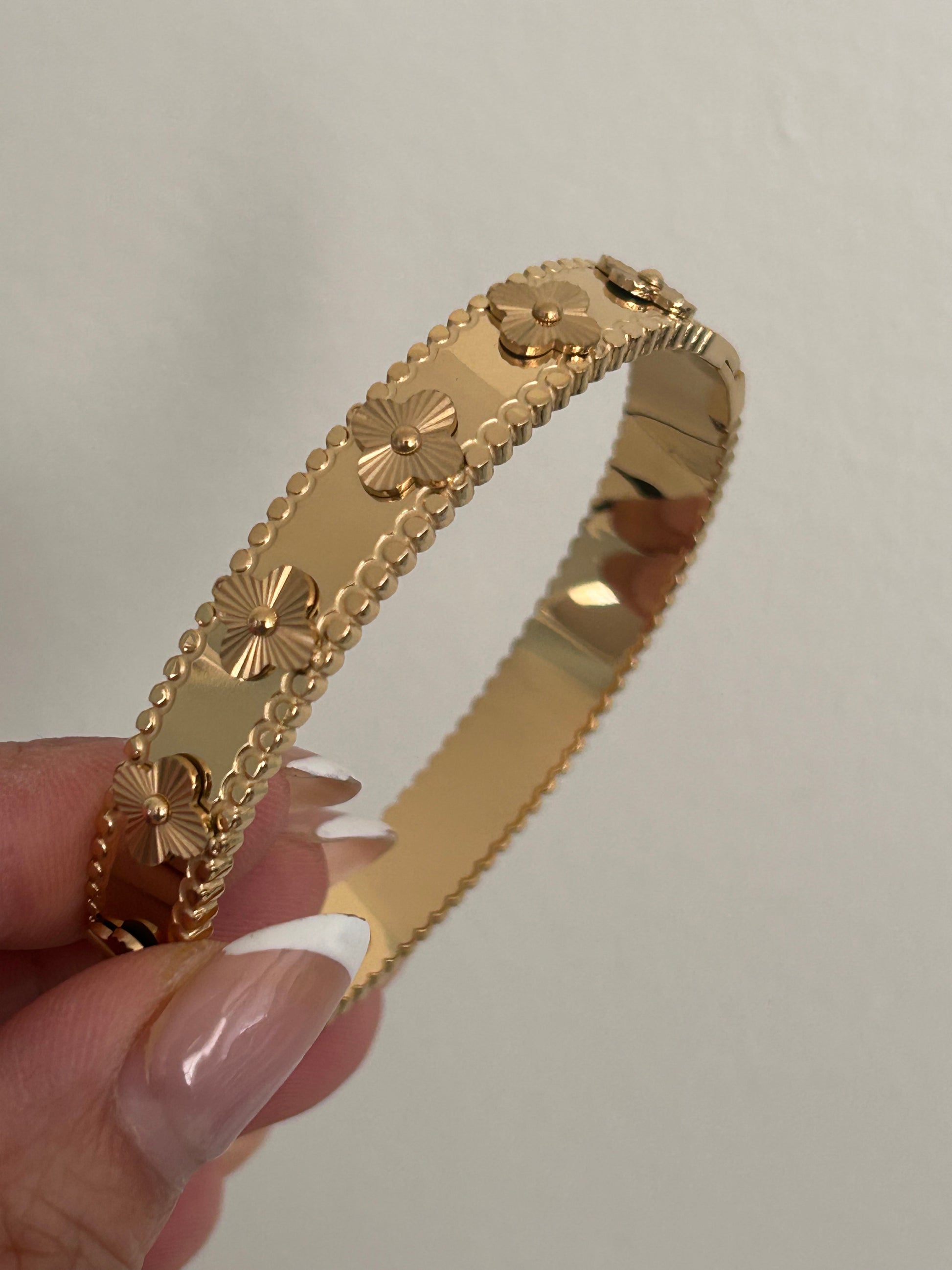 Add an element of luck and glamour to your wardrobe with our Kareema Gold Flower Bangle. The gold flower design will catch the eye and make a bold statement. Perfect for those who like to take risks and stand out from the crowd!