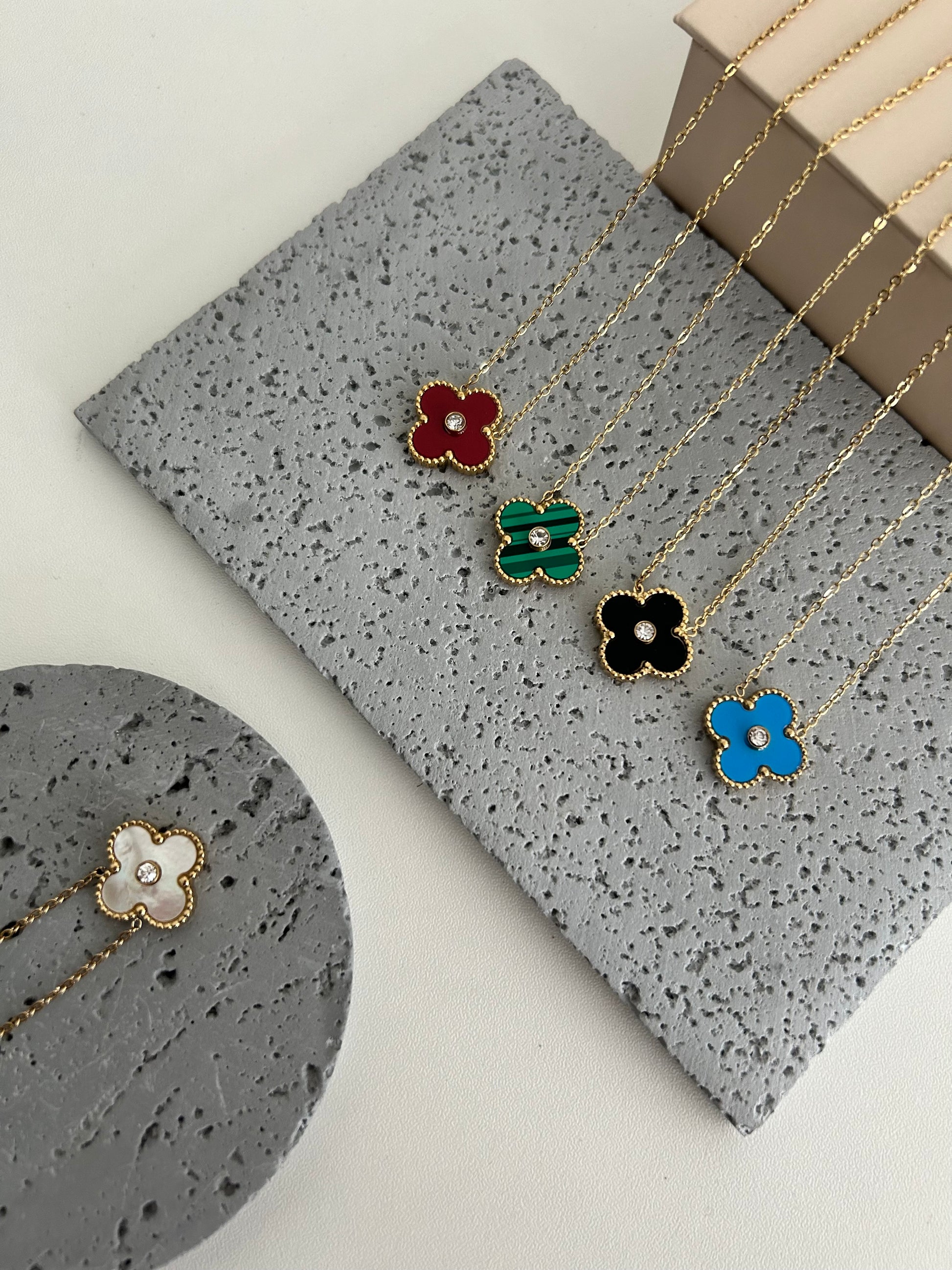 Check out Ameera, our awesome Four Leaf Clover Necklace with a crystal! Inspired by the lucky clover, it is a symbol of good vibes and style. Made with durable stainless steel and coated in fancy 18K gold, this necklace is built to last.
