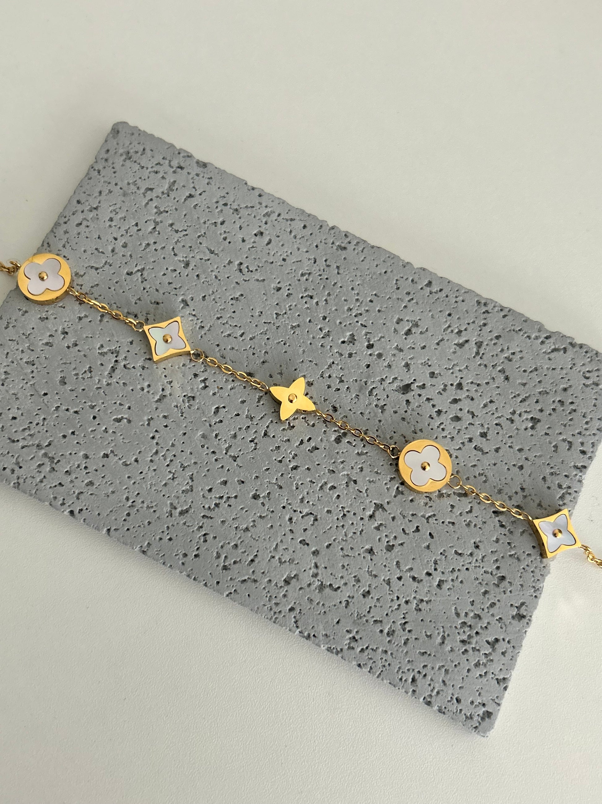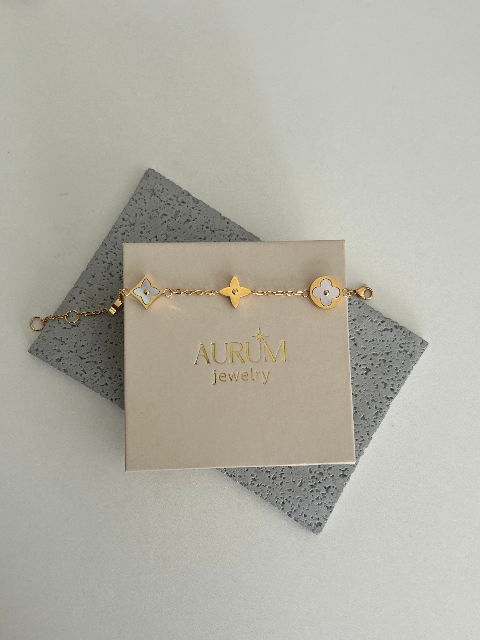 Embrace the beauty of nature with Aneera bracelet, featuring a delicate bouquet of mother of pearl flowers set in gold. Never worry about tarnish, and indulge in its timeless elegance.