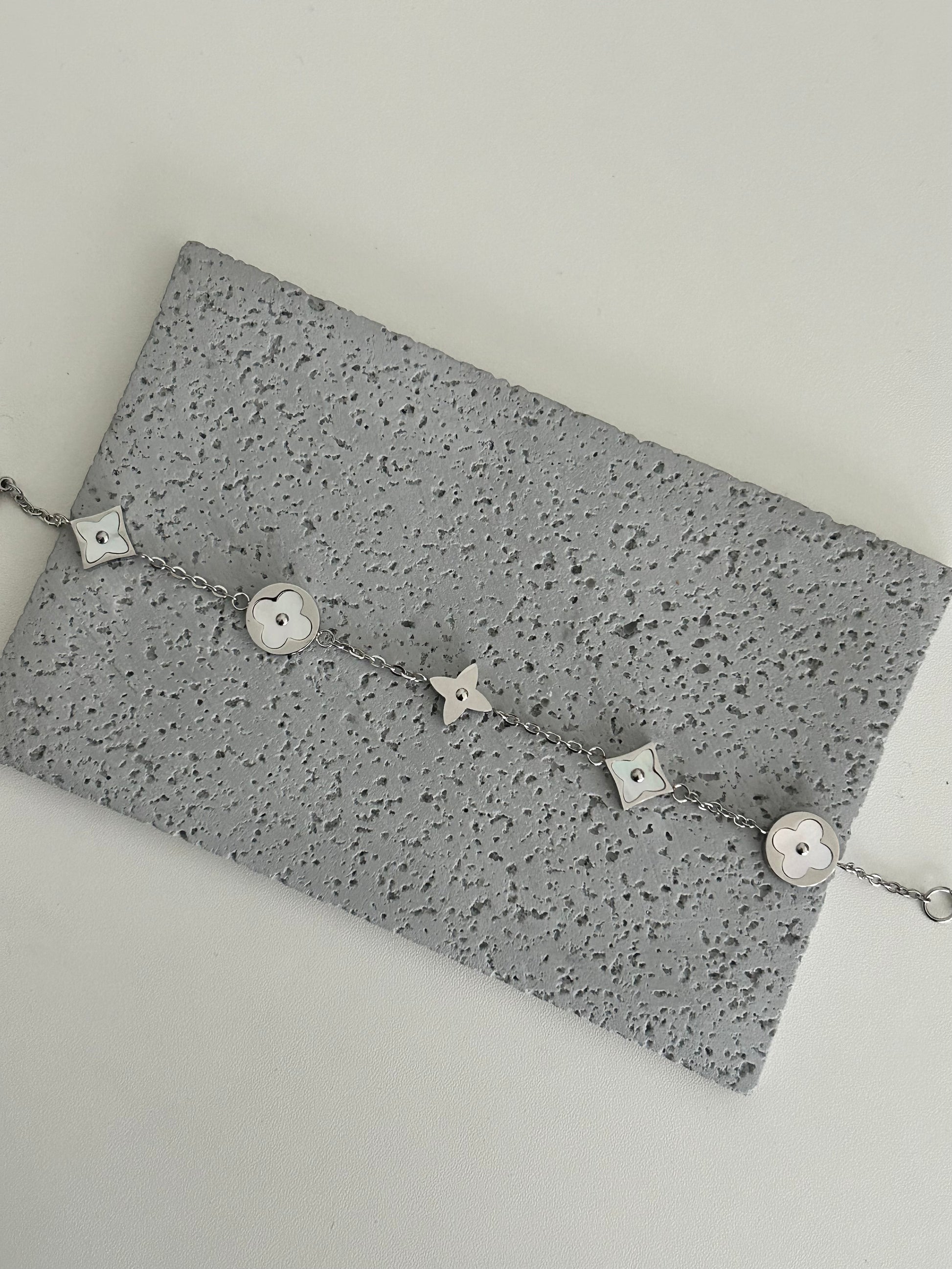 This grey mother of pearl four leaf clover bracelet is beautiful, looks lovely with other bracelets or alone. The grey mother of pearl is very pretty it almost takes on whatever colour you are wearing. As well my order arrived in a lovely packaged with great attention to detail, absolutely beautiful!