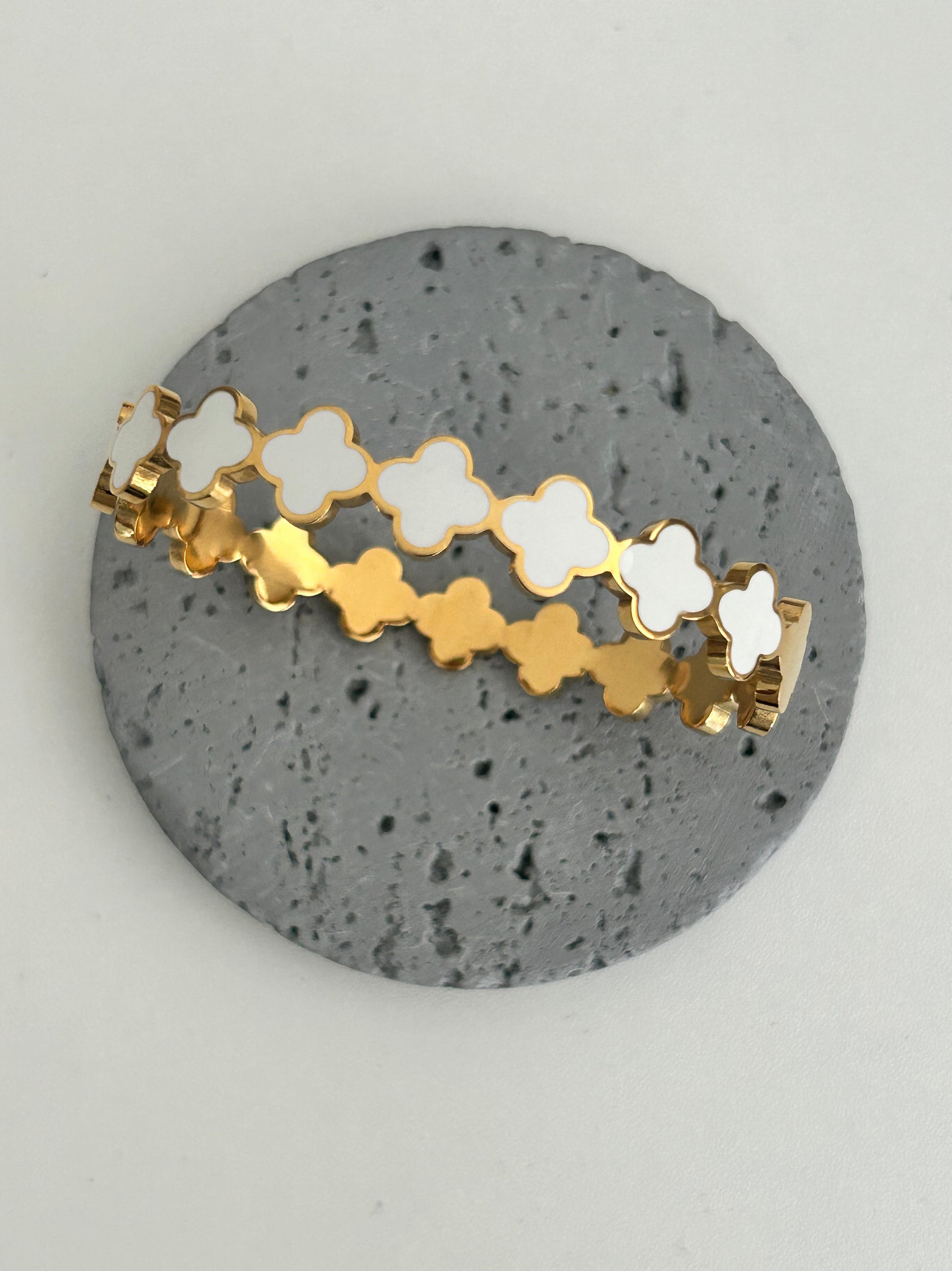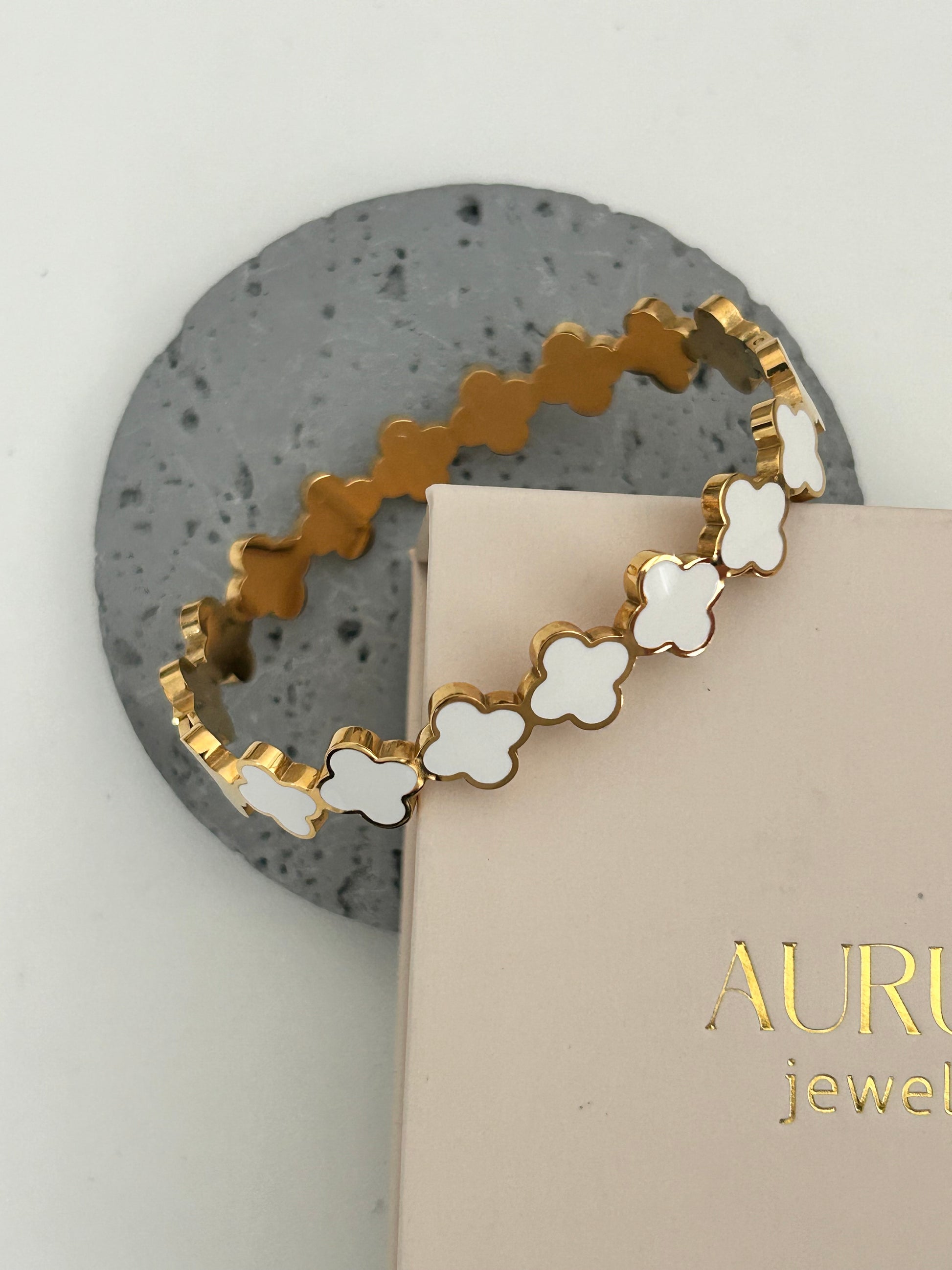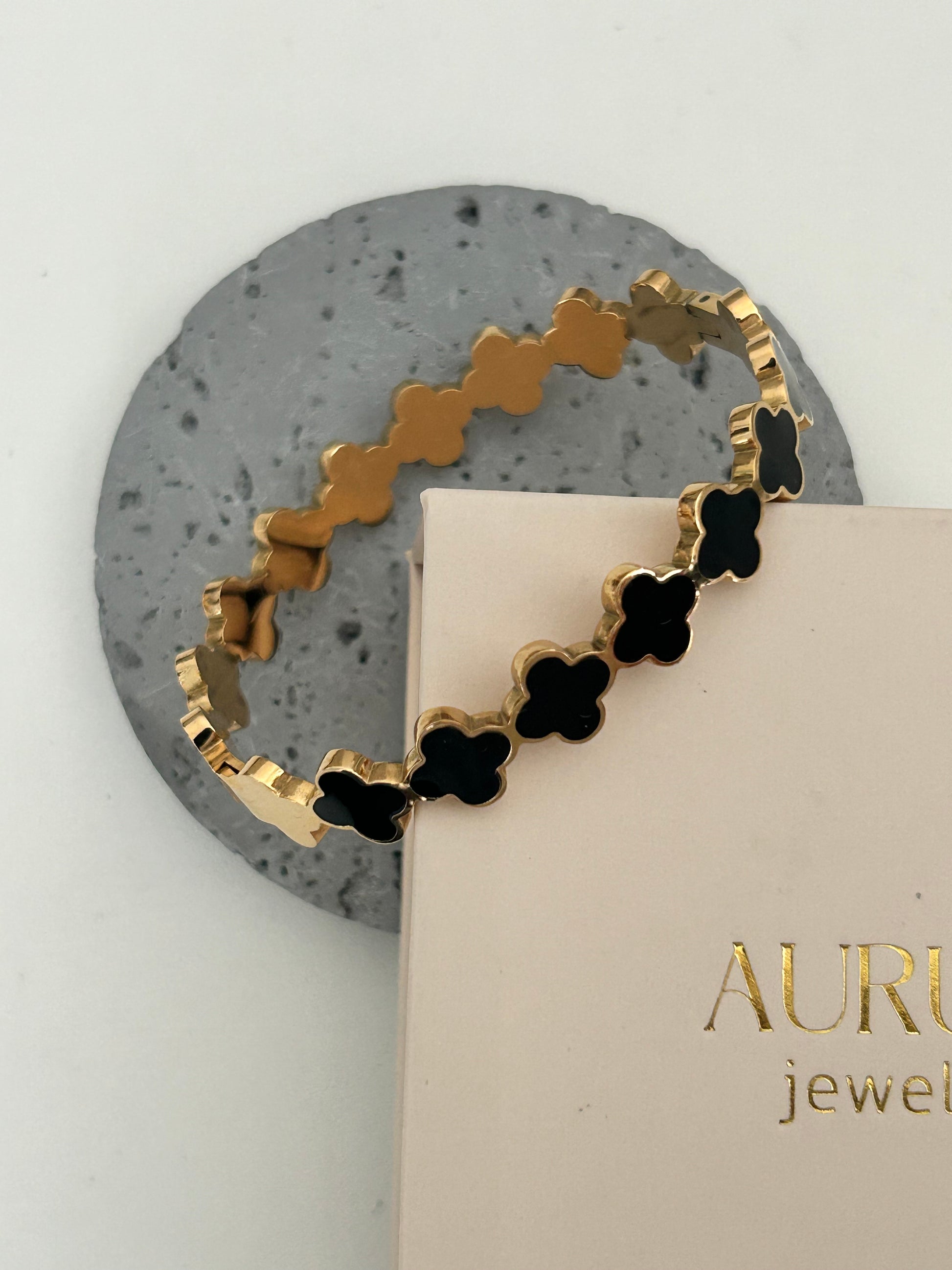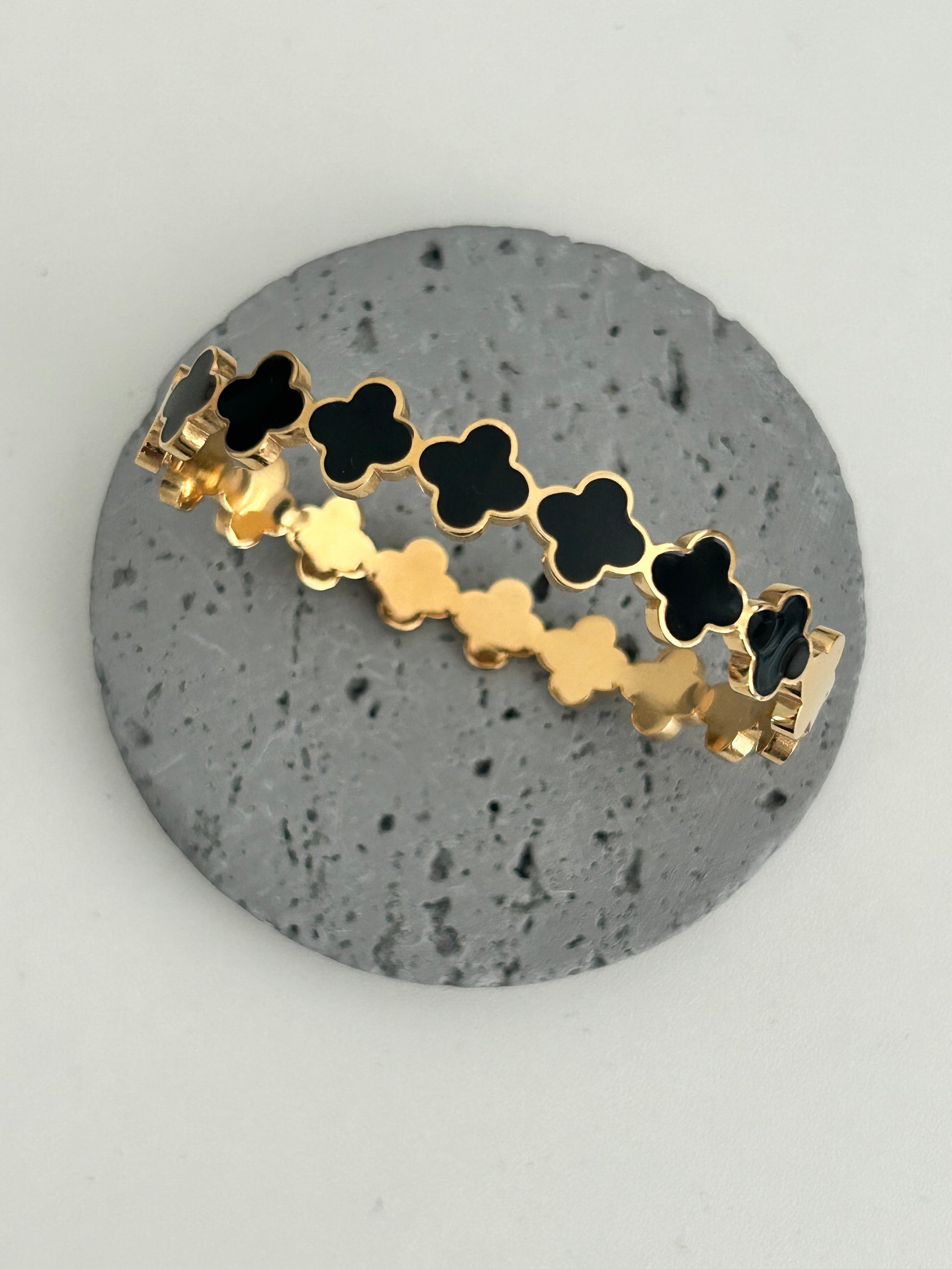 Add an element of luck and glamour to your wardrobe with our Anushka Gold White or Black Clover Bangle. The bold color clover design will catch the eye and make a bold statement. Perfect for those who like to take risks and stand out from the crowd!