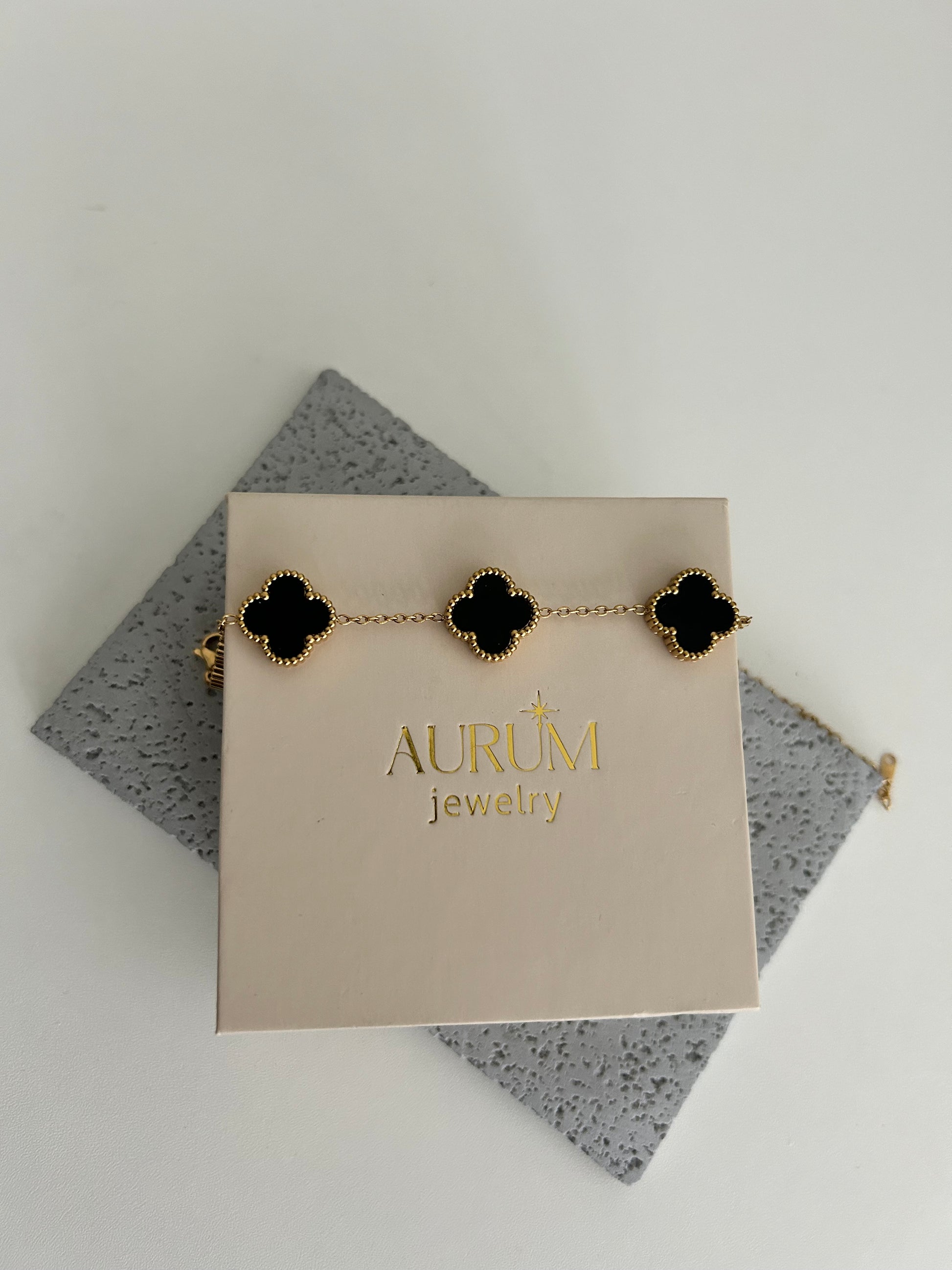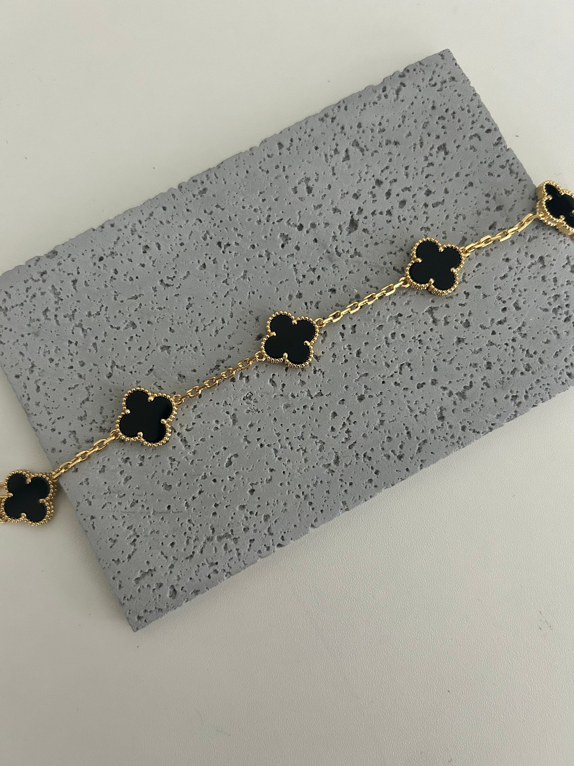 Introducing "Anya black clover”, our elegant Gold Four-Leaf Clover bracelet – a symbol of luck and style. Each clover is adorned with luxurious 18K gold plating over a durable stainless steel bracelet. This double-sided masterpiece is not only a fashion statement but also a token of good fortune.