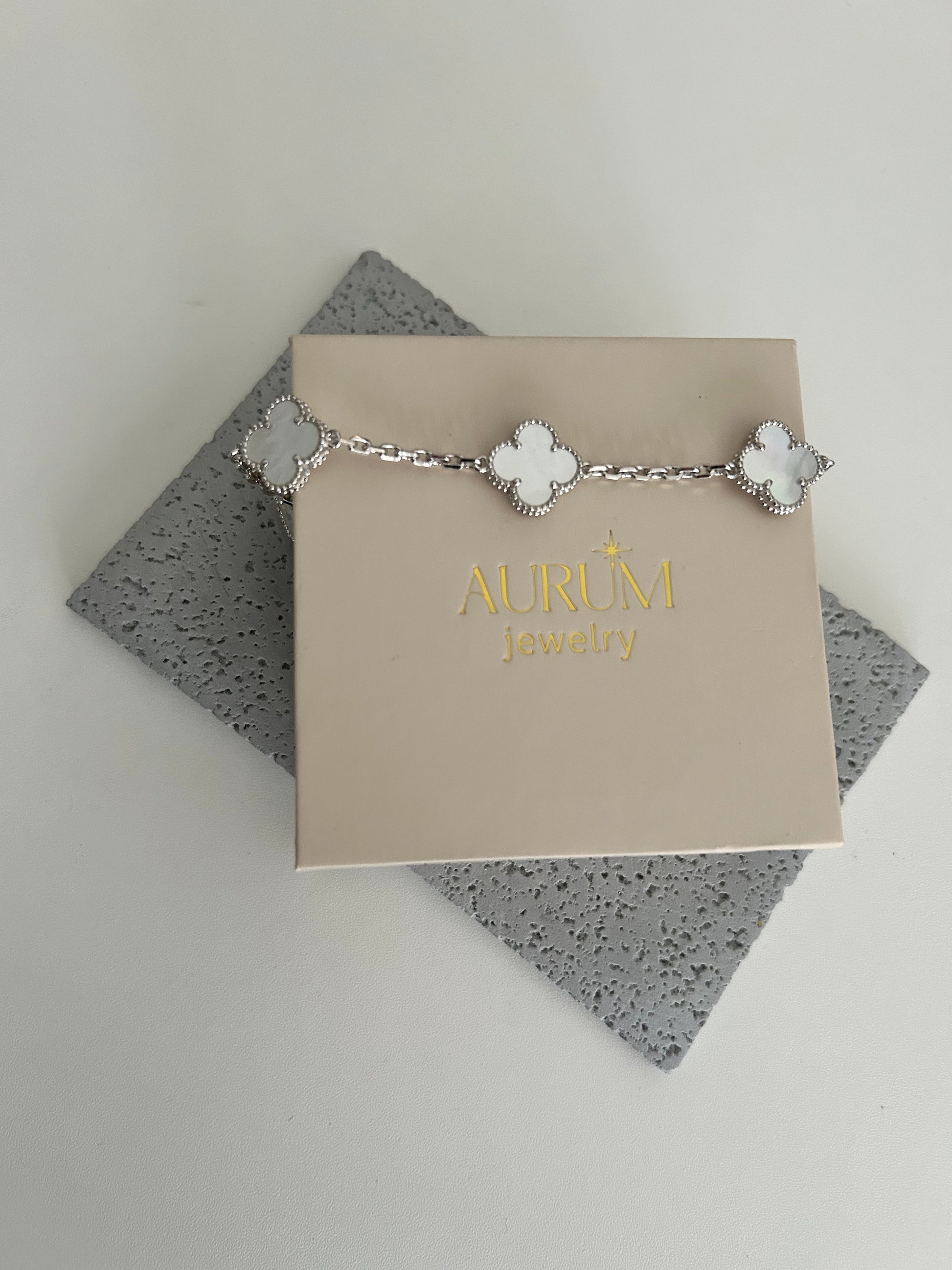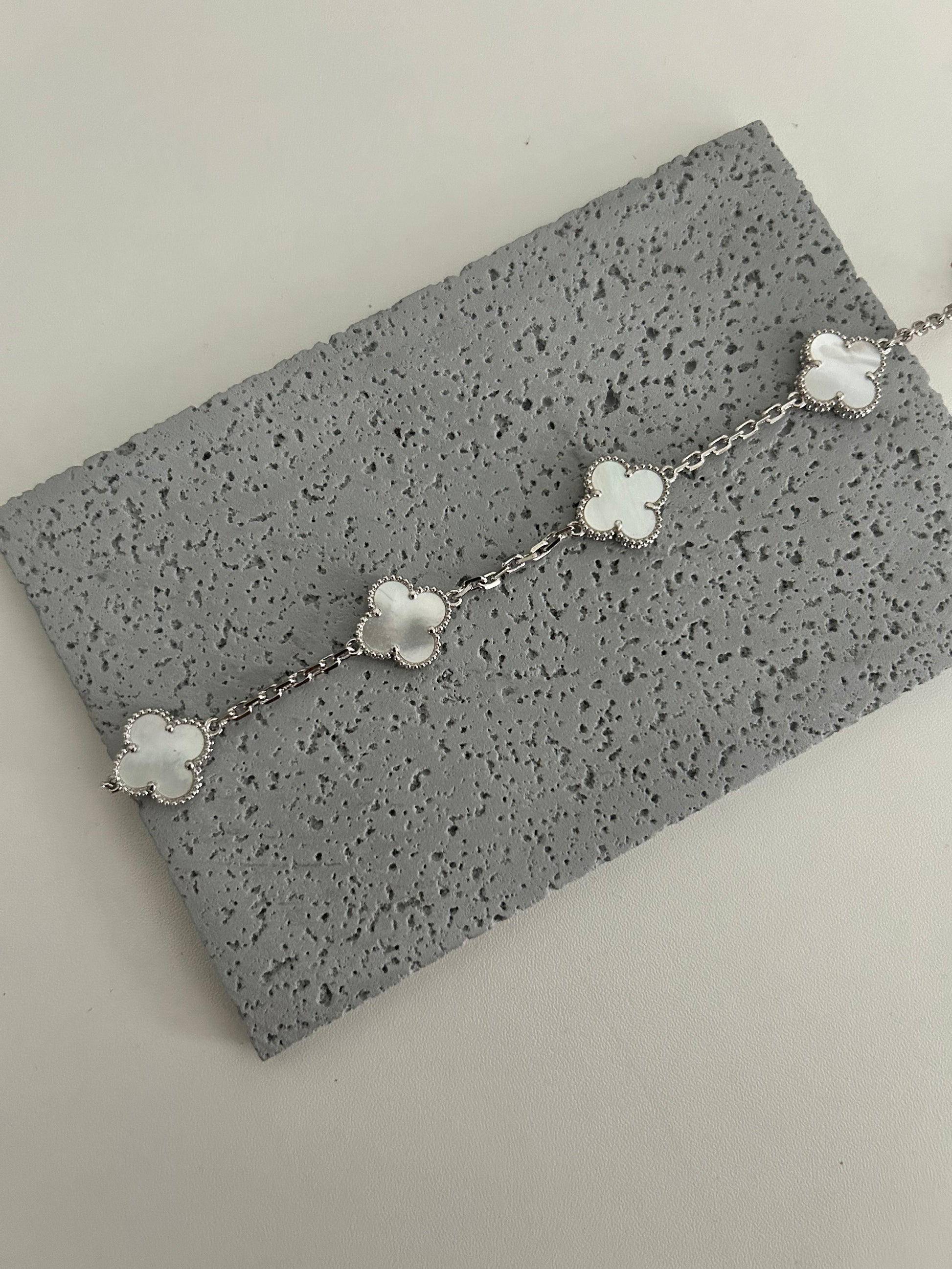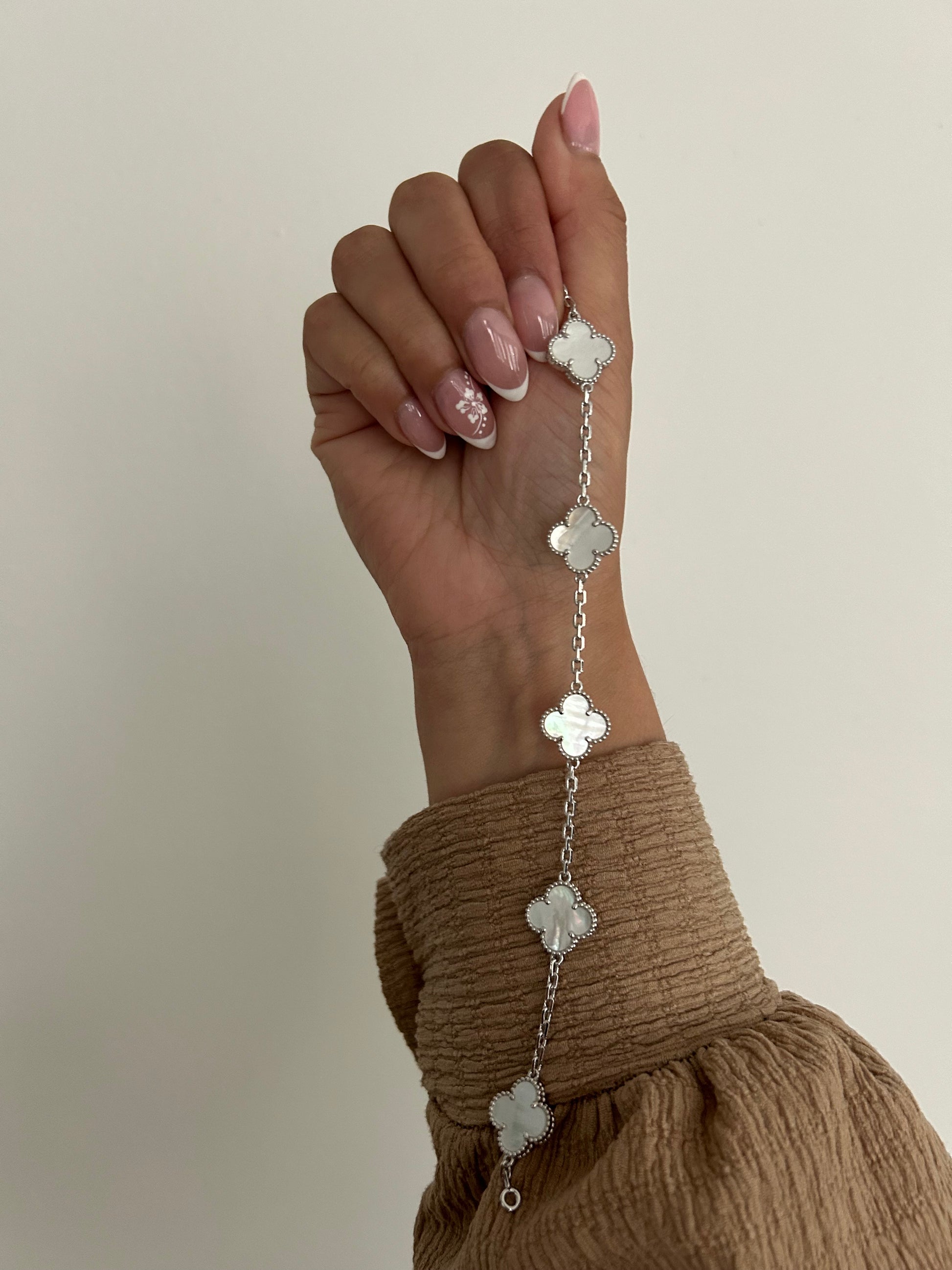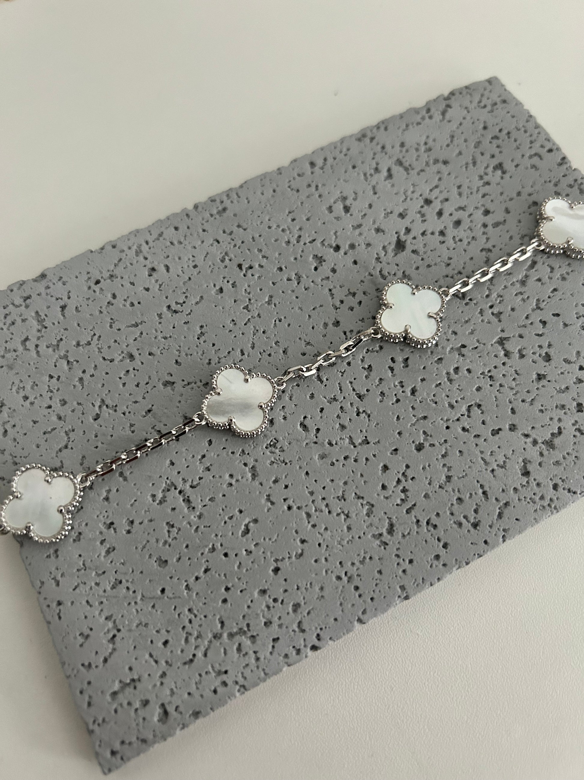 Introducing "Anya silver White clover”, our elegant Gold Four-Leaf Clover bracelet – a symbol of luck and style. Each clover is adorned with luxurious 18K gold plating over a durable stainless steel bracelet. This double-sided masterpiece is not only a fashion statement but also a token of good fortune.