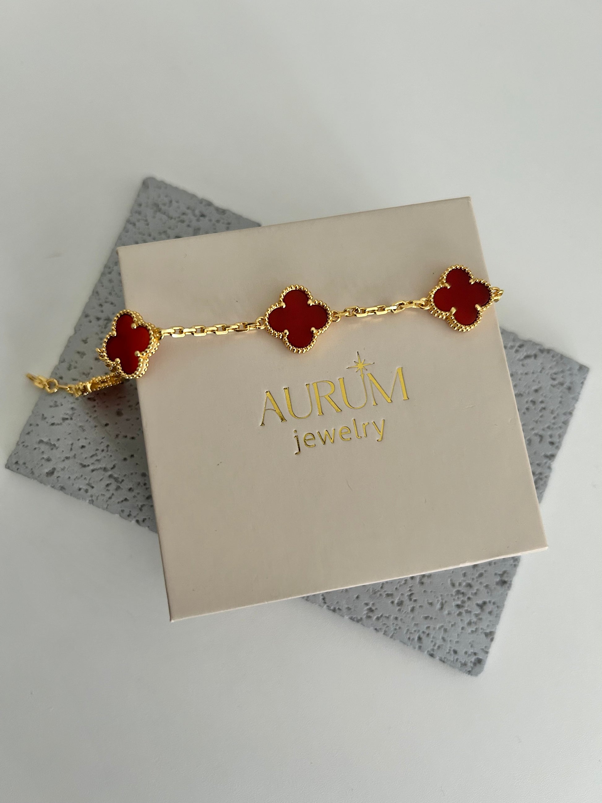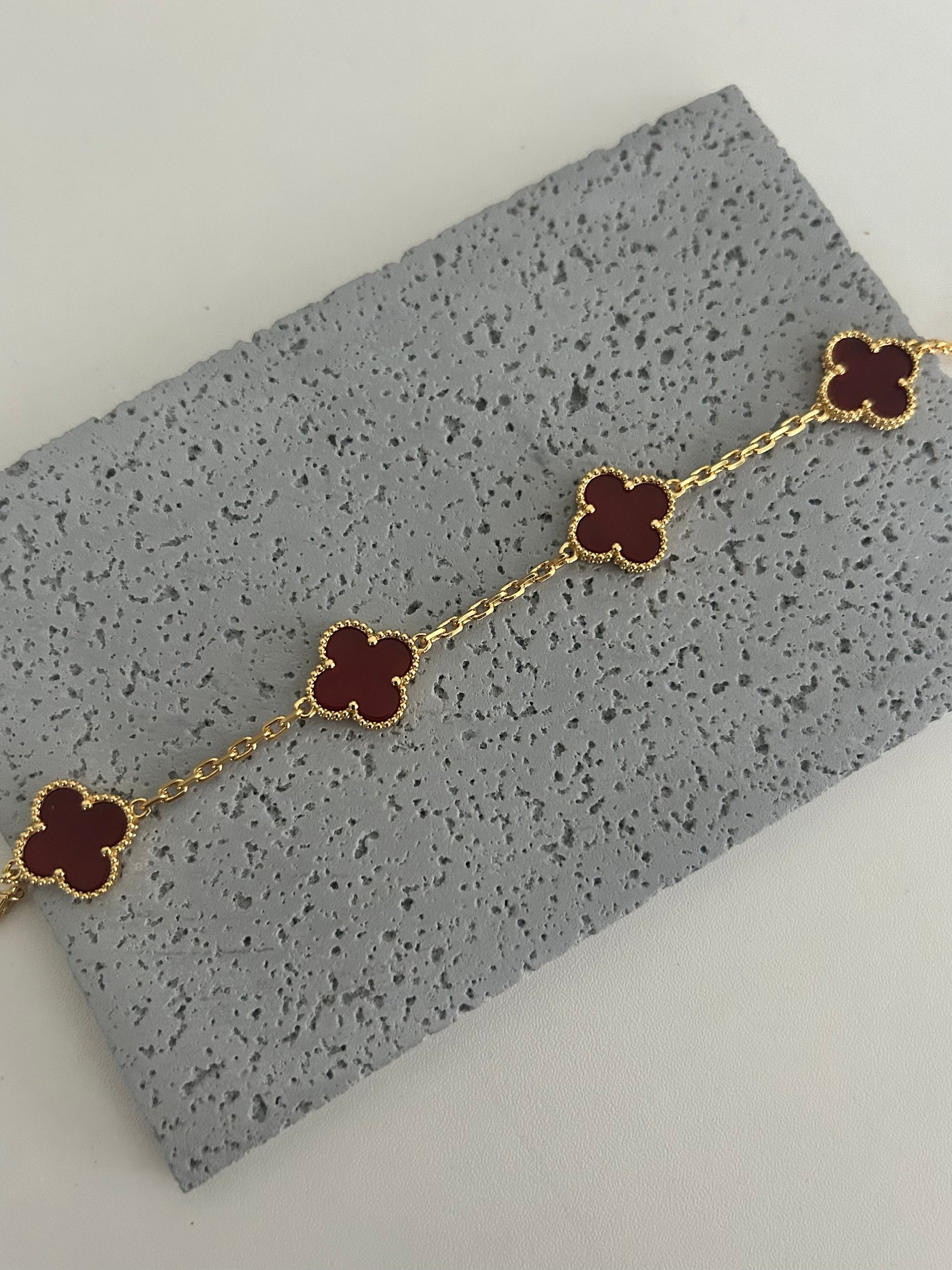 Introducing "Anya", our elegant Gold Four-Leaf Clover bracelet – a symbol of luck and style. Each clover is adorned with luxurious 18K gold plating over a durable stainless steel bracelet. This double-sided masterpiece is not only a fashion statement but also a token of good fortune.