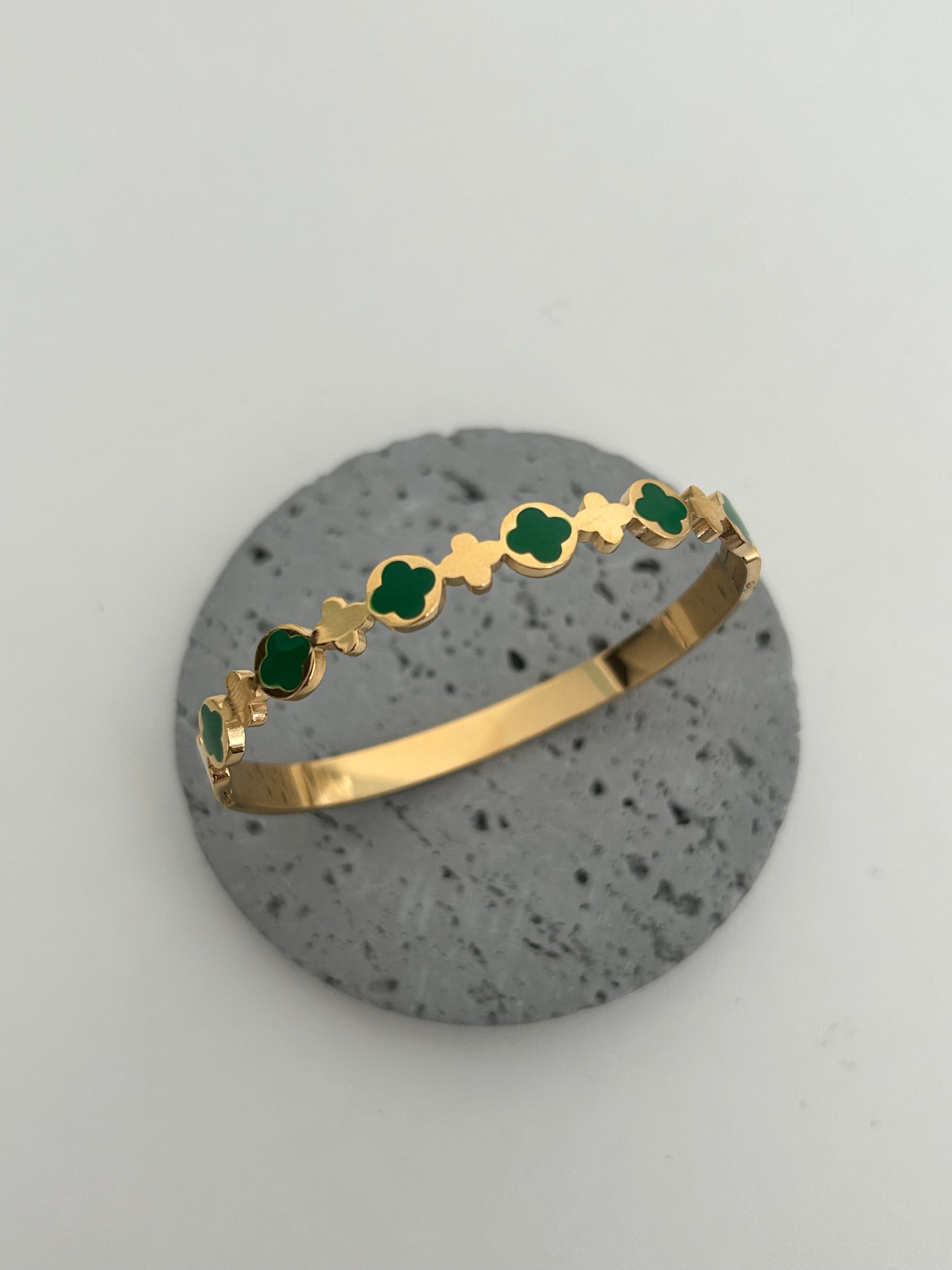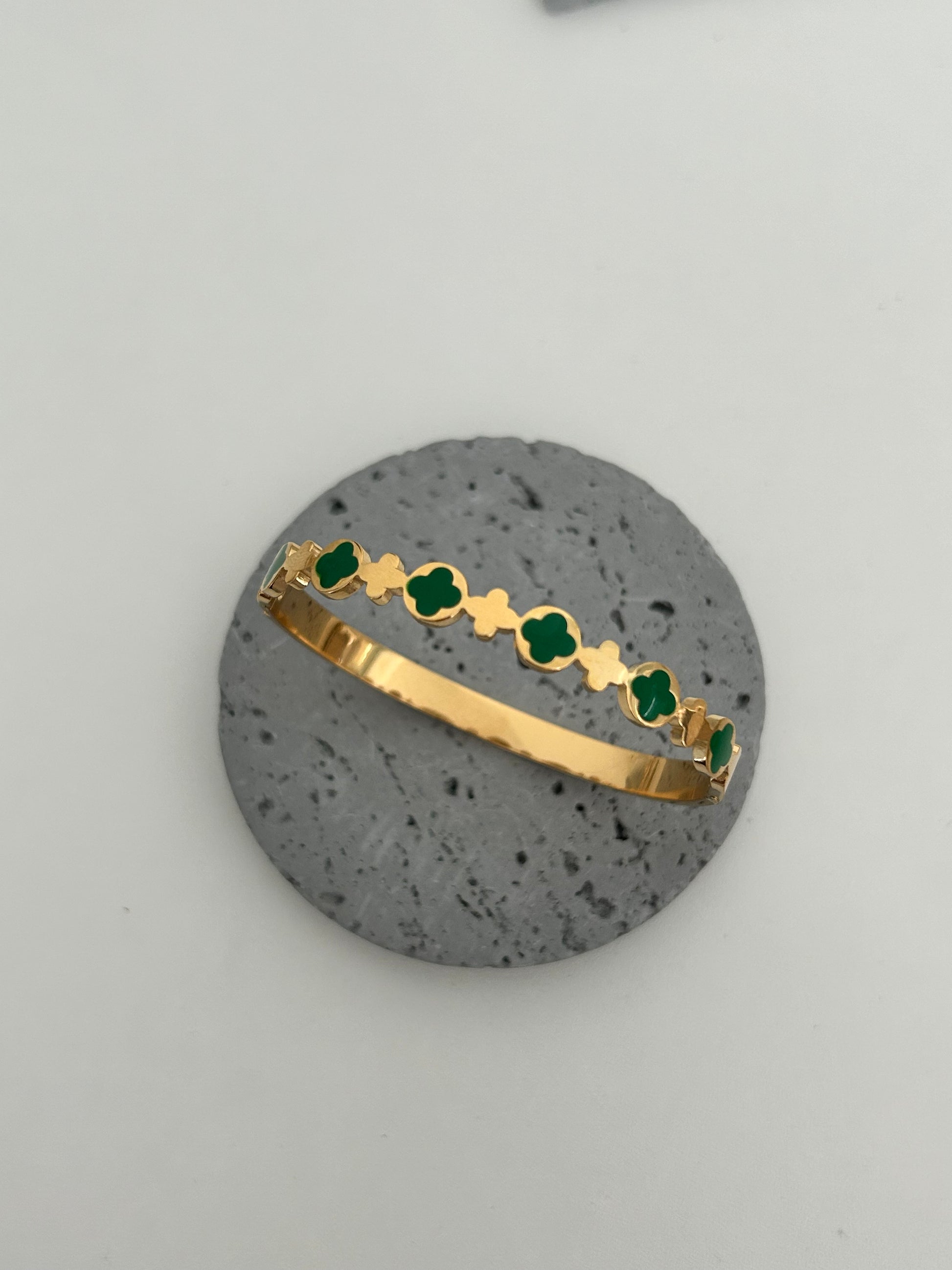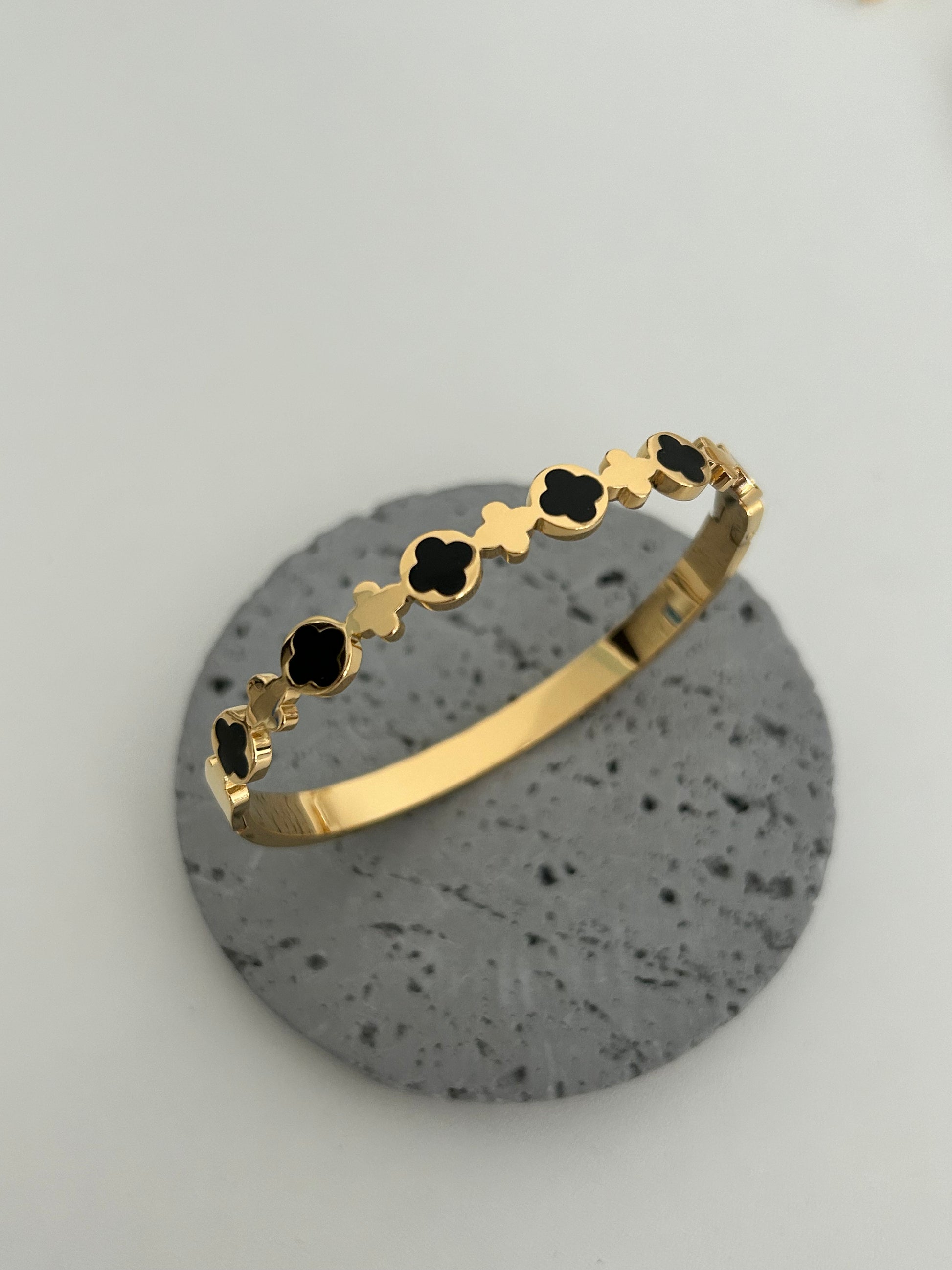 Add an element of luck and glamour to your wardrobe with our Anushka Gold White or Black Clover Bangle. The bold color clover design will catch the eye and make a bold statement. Perfect for those who like to take risks and stand out from the crowd!