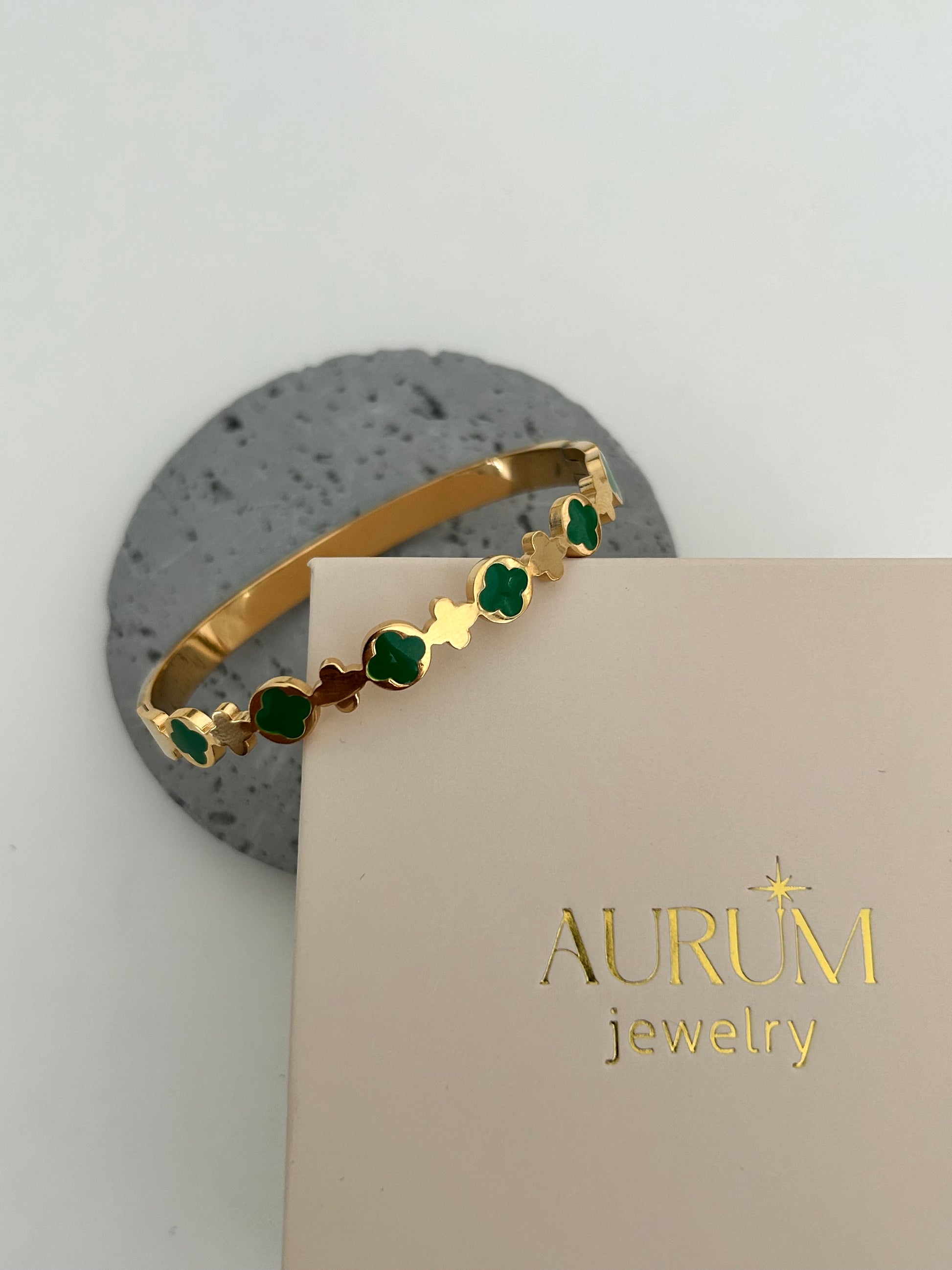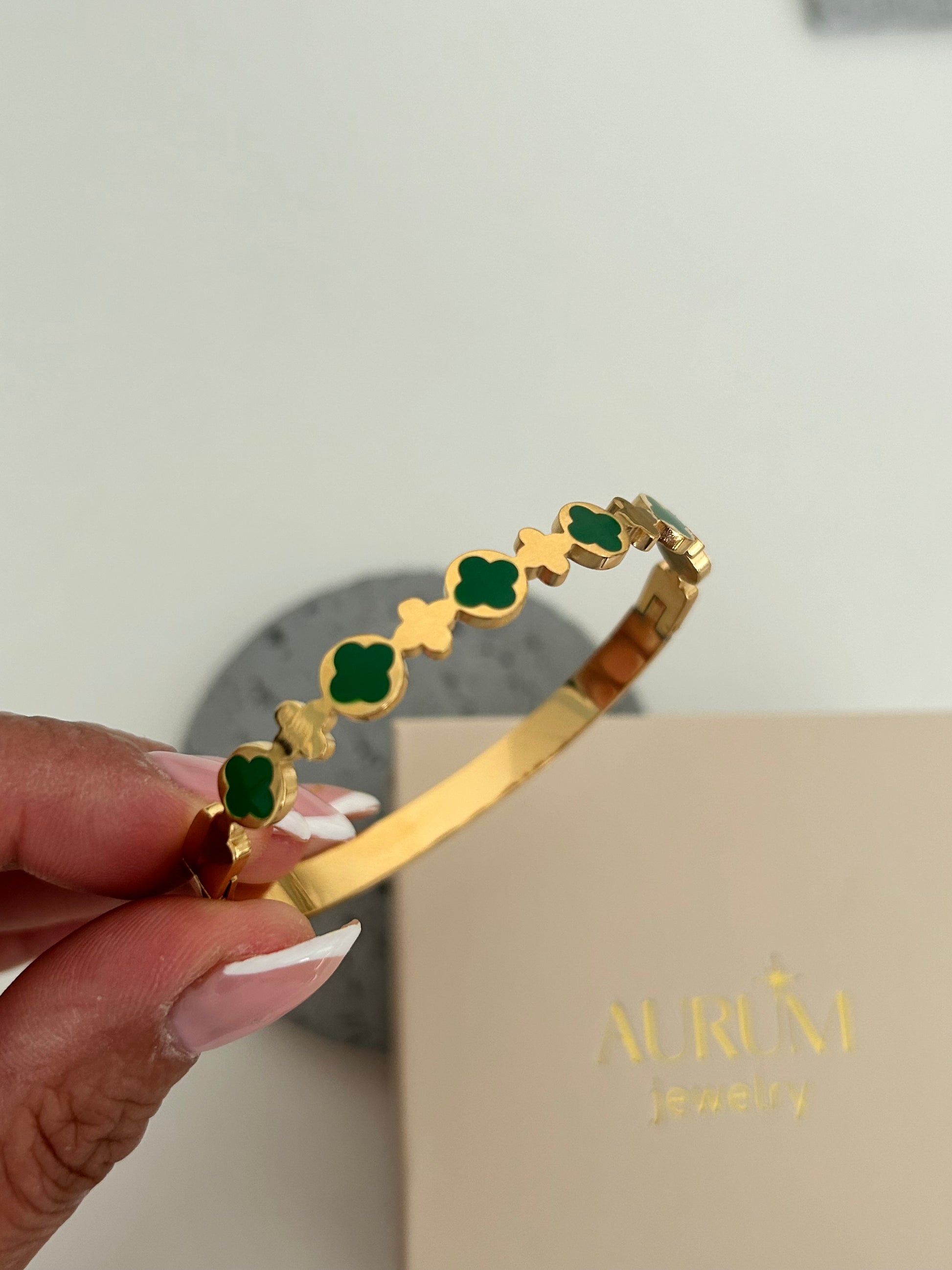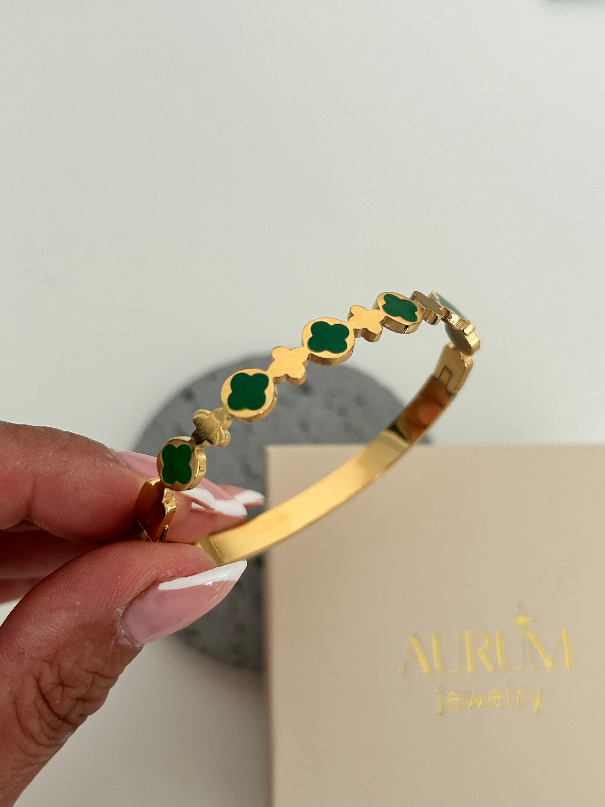Add an element of luck and glamour to your wardrobe with our Anushka Gold White or Black Clover Bangle. The bold color clover design will catch the eye and make a bold statement. Perfect for those who like to take risks and stand out from the crowd!