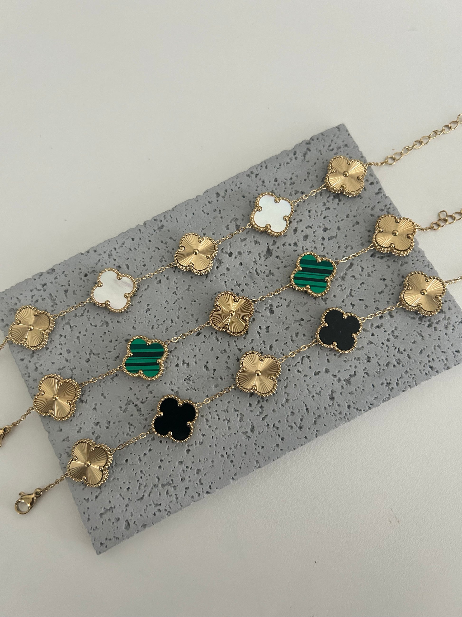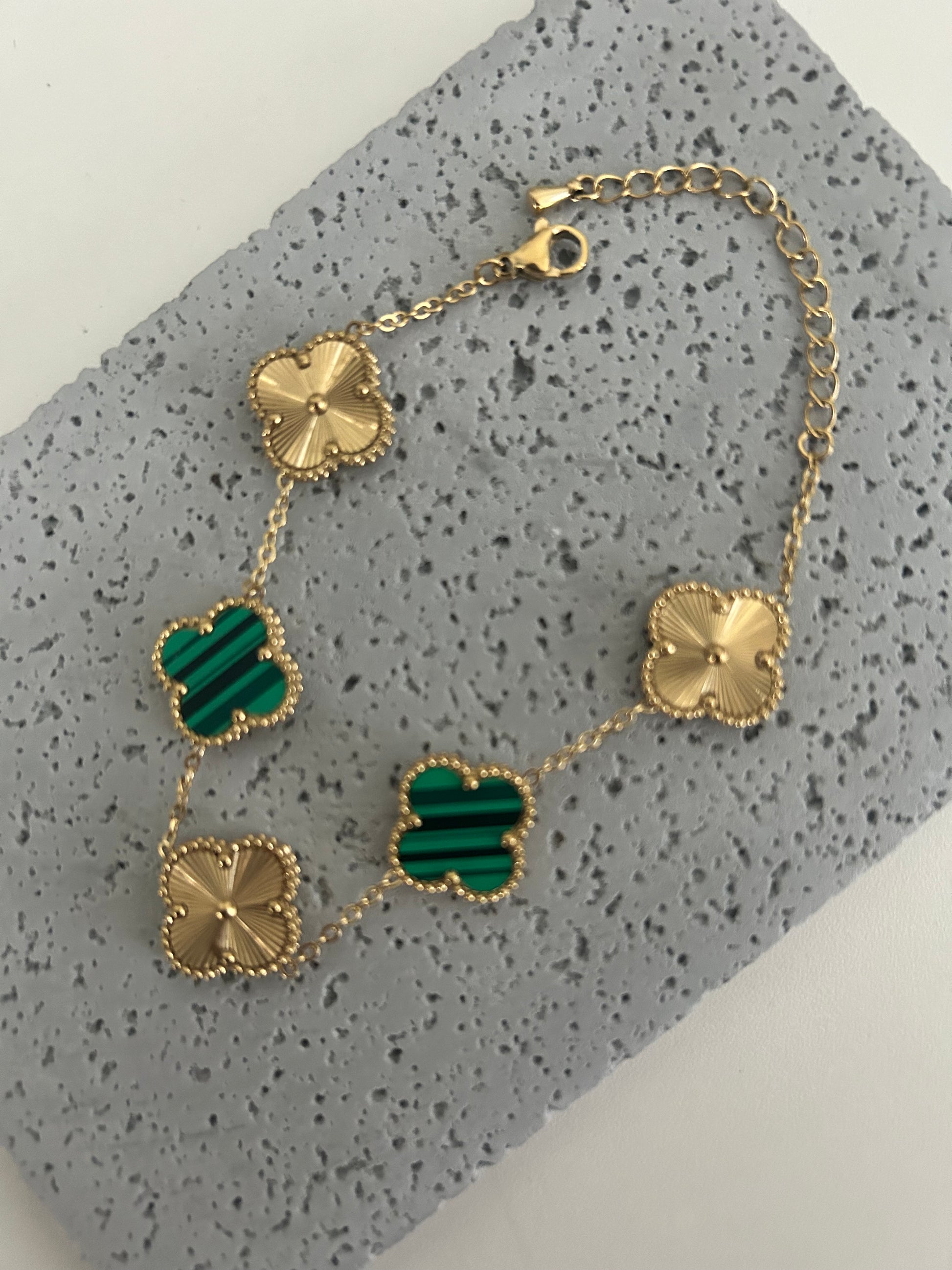Introducing "Alayna", our elegant Gold Four-Leaf Clover bracelet – a symbol of luck and style. Each clover is adorned with luxurious 18K gold plating over a durable stainless steel bracelet. This double-sided masterpiece is not only a fashion statement but also a token of good fortune.