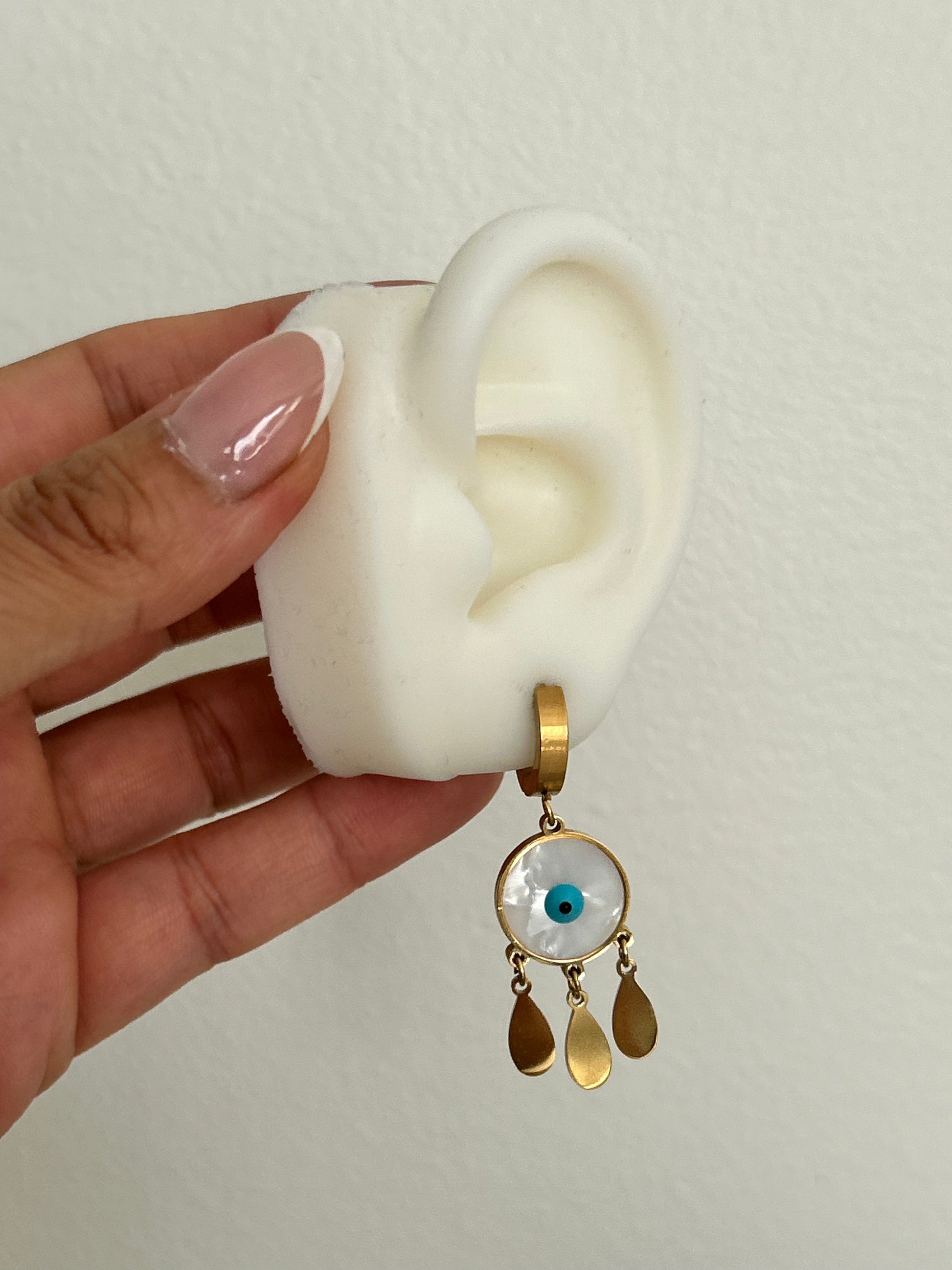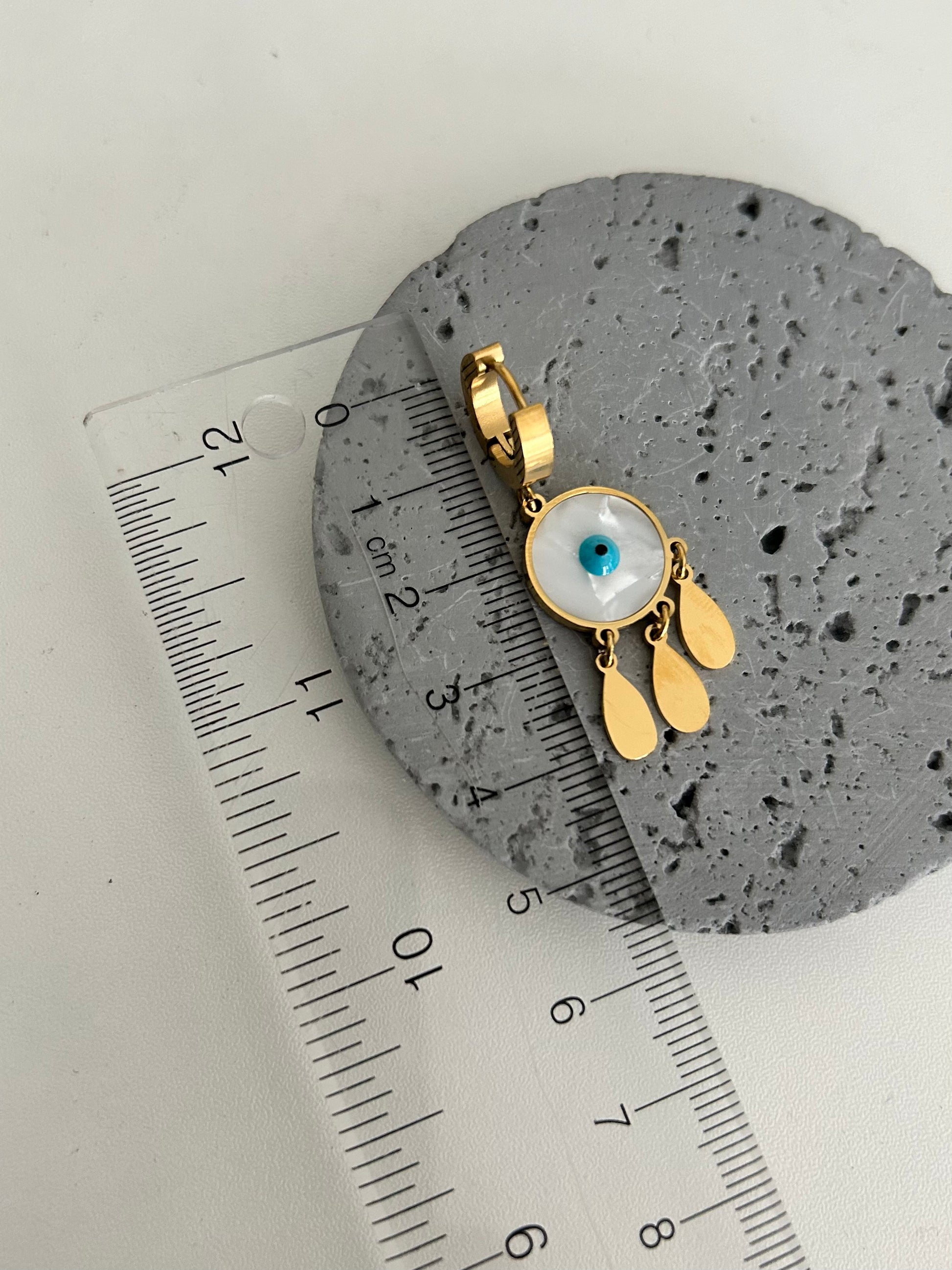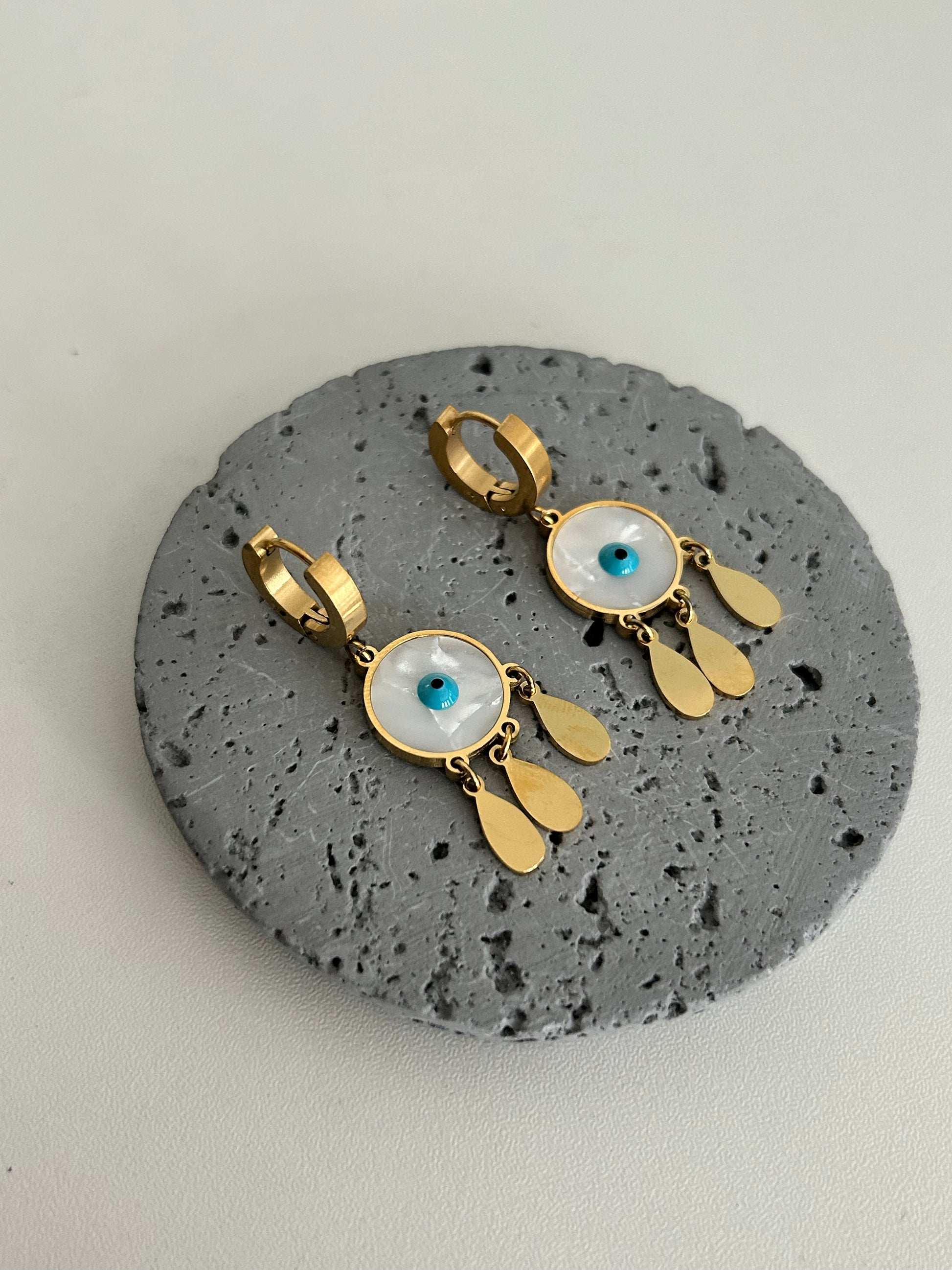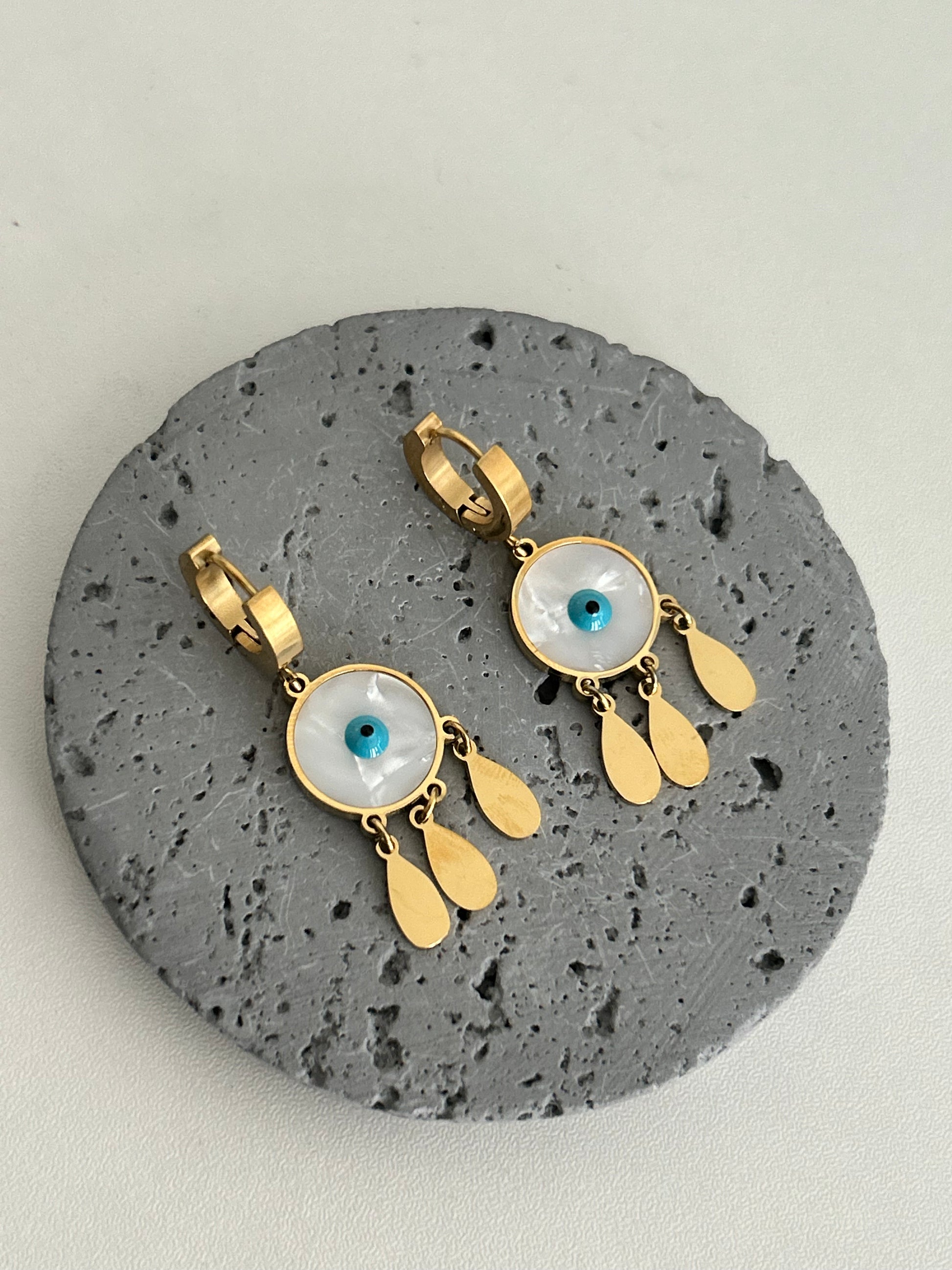Check out “Hafsa” these trendy 18K gold plated over stainless steel Evil Eye drop hoop earrings! They're not just super stylish, but also packed with awesome features. First off, they're waterproof, so you don't have to worry about taking them off when you're caught in the rain or hitting the beach. Plus, they're non-tarnish, so they'll keep their shiny, new look for ages. And the best part? They're hypoallergenic, making them perfect for those with sensitive ears. These earrings are all about casual vibes and friendly style, giving your outfit that extra pop of awesomeness. Get ready to rock these beauties and turn some heads!
