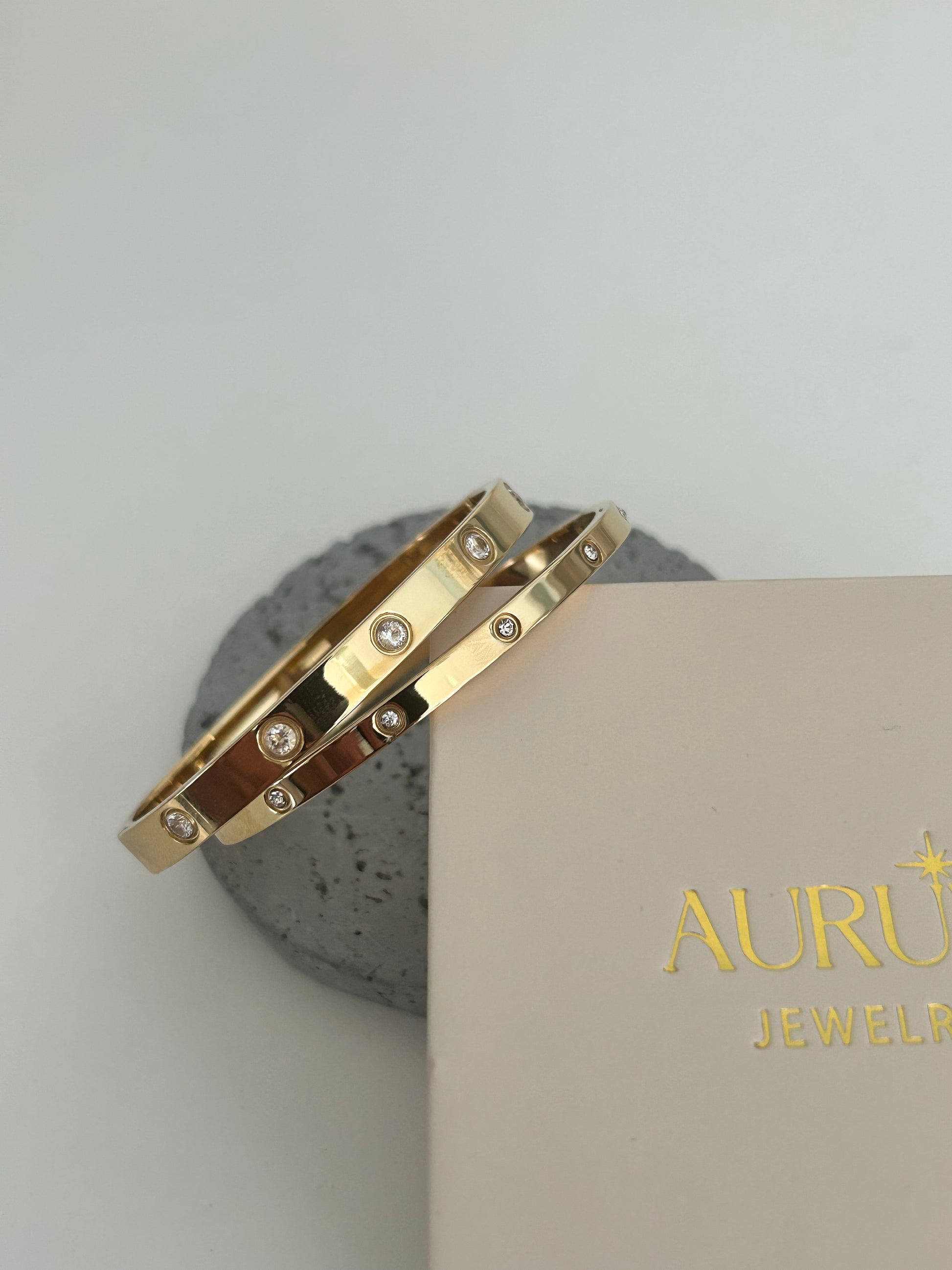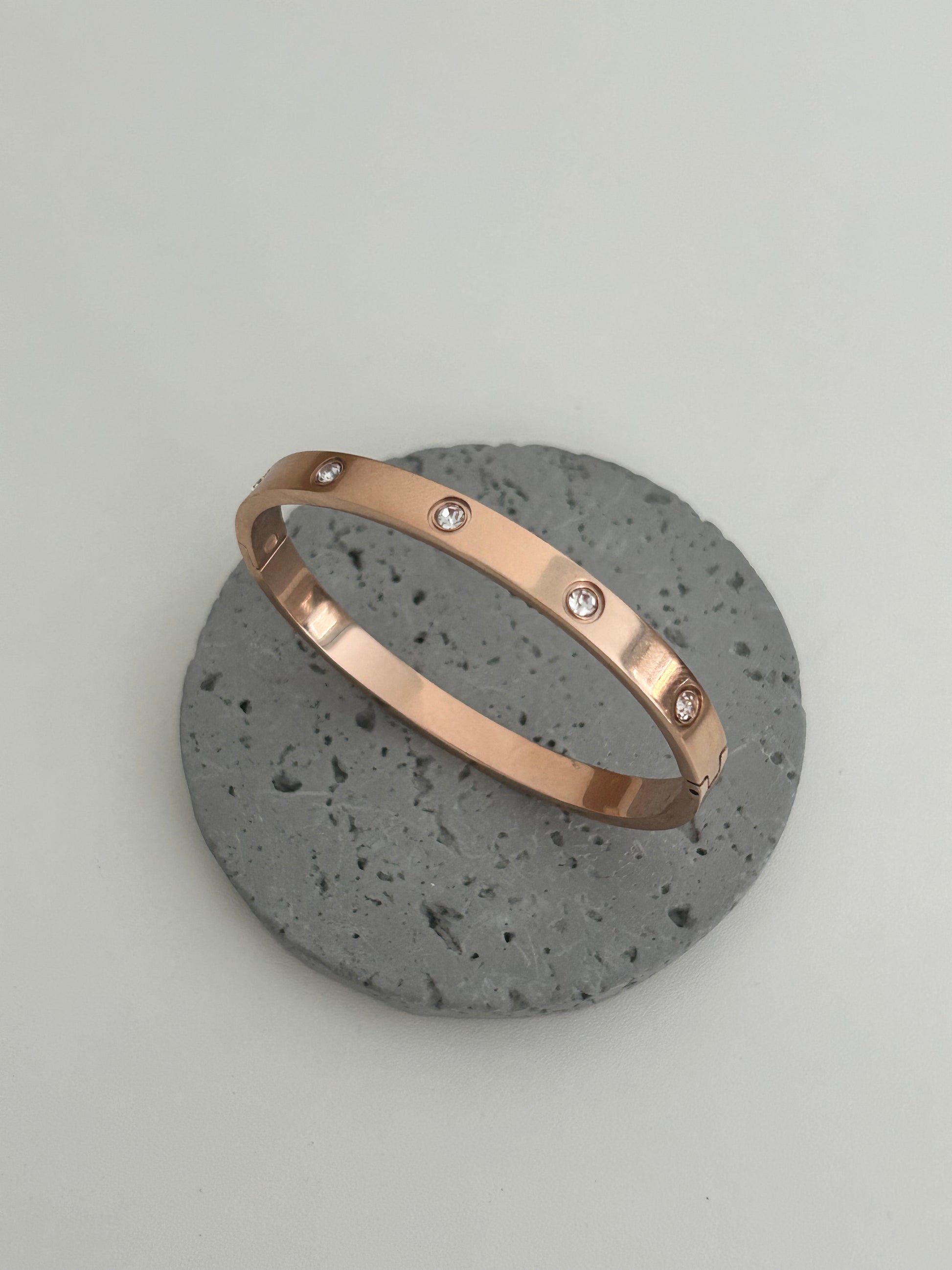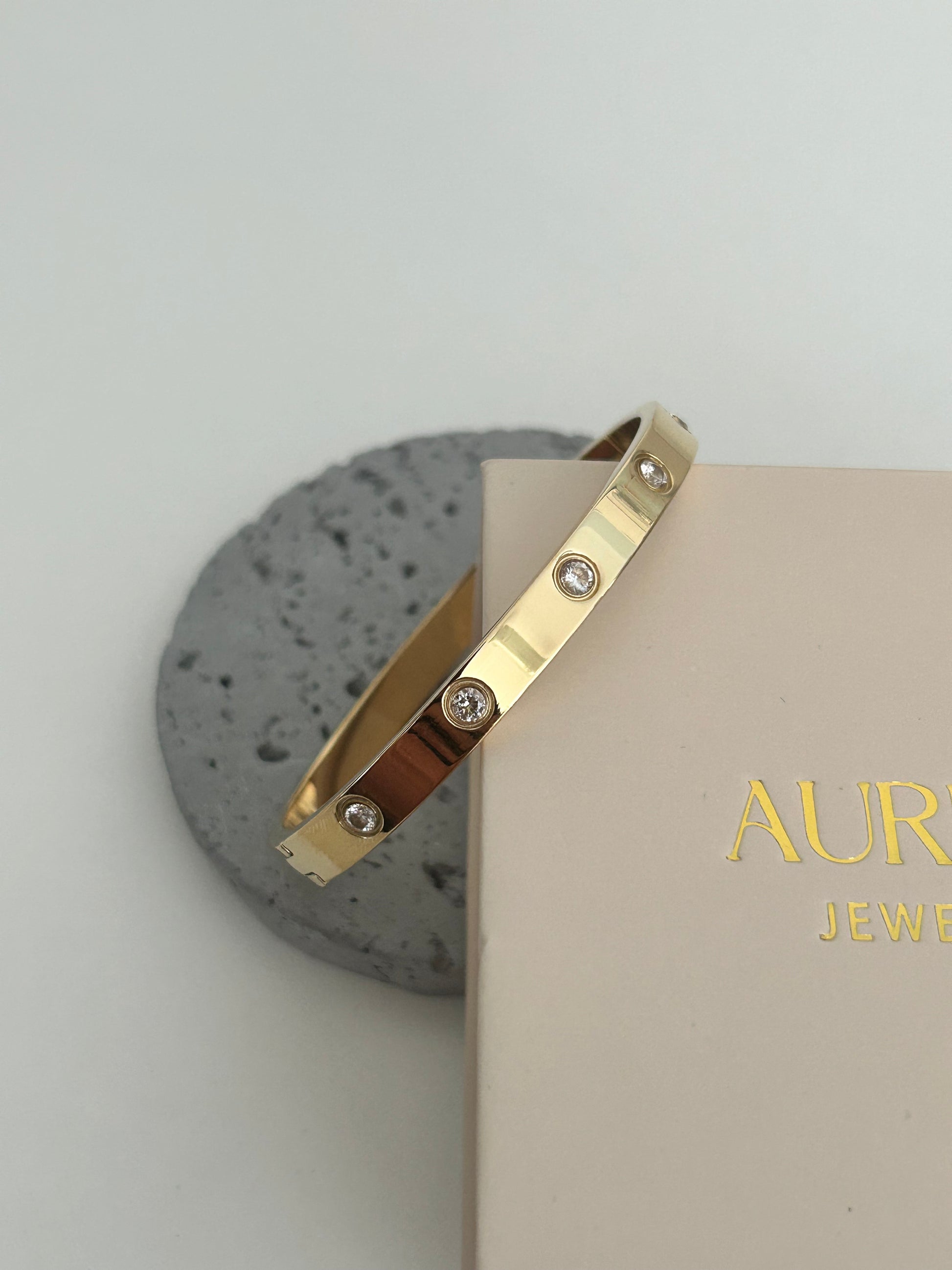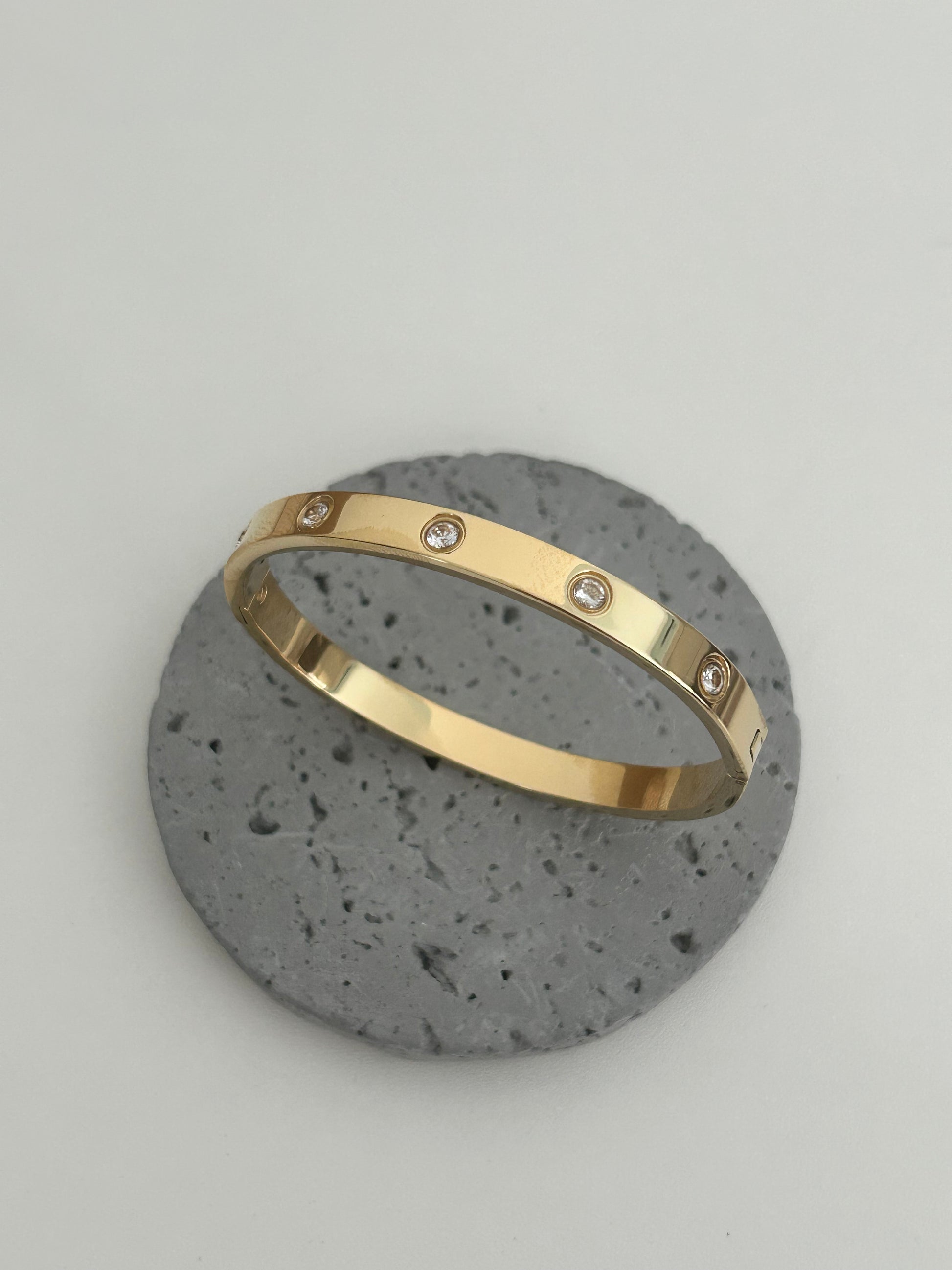 Meet "Amelia", our Love bracelet with cz stones – a timeless piece designed with care. This bangle is 18K gold plated over stainless steel. With a 6 cm diameter, it's a one-size-fits-all bangle.