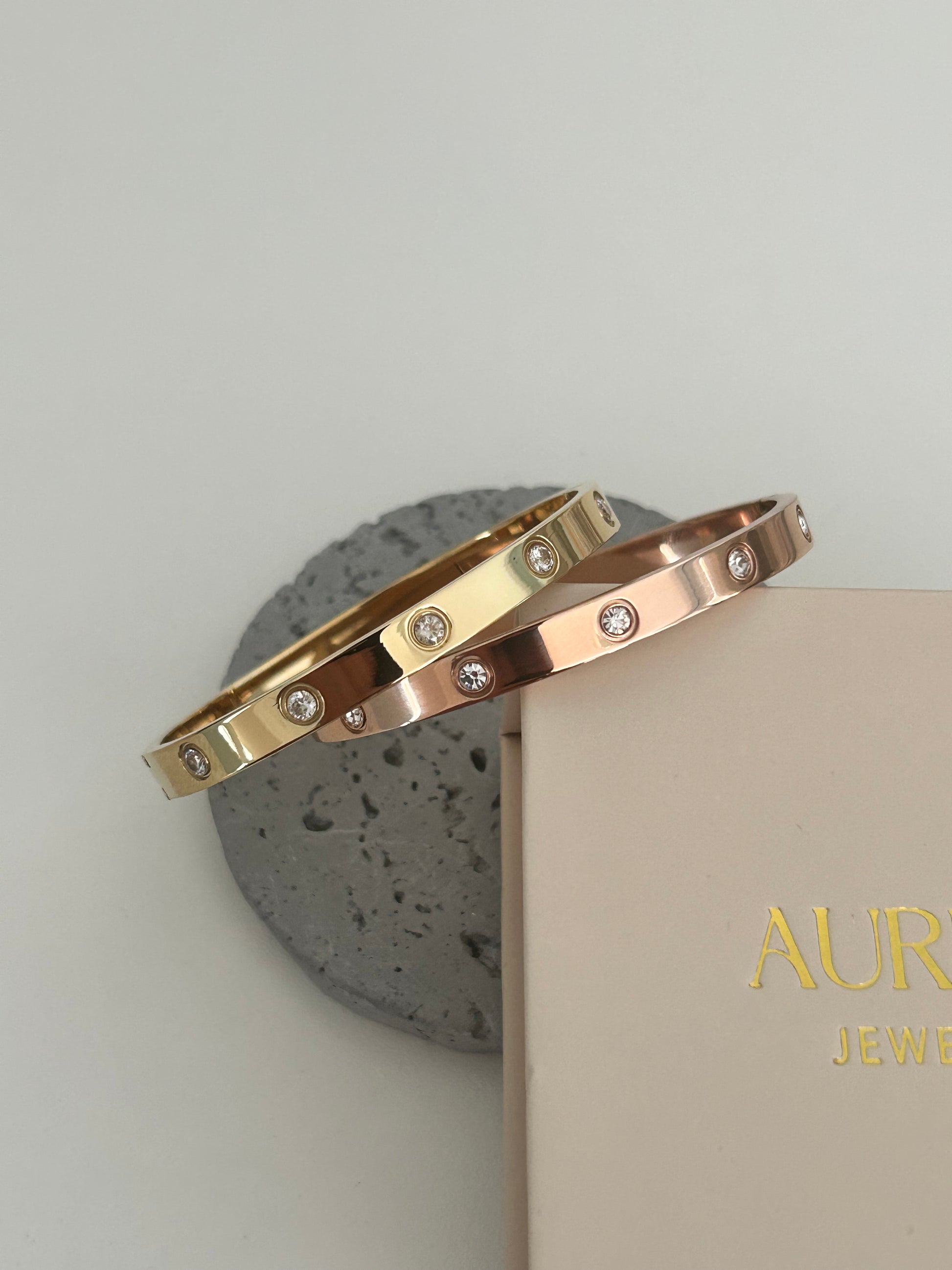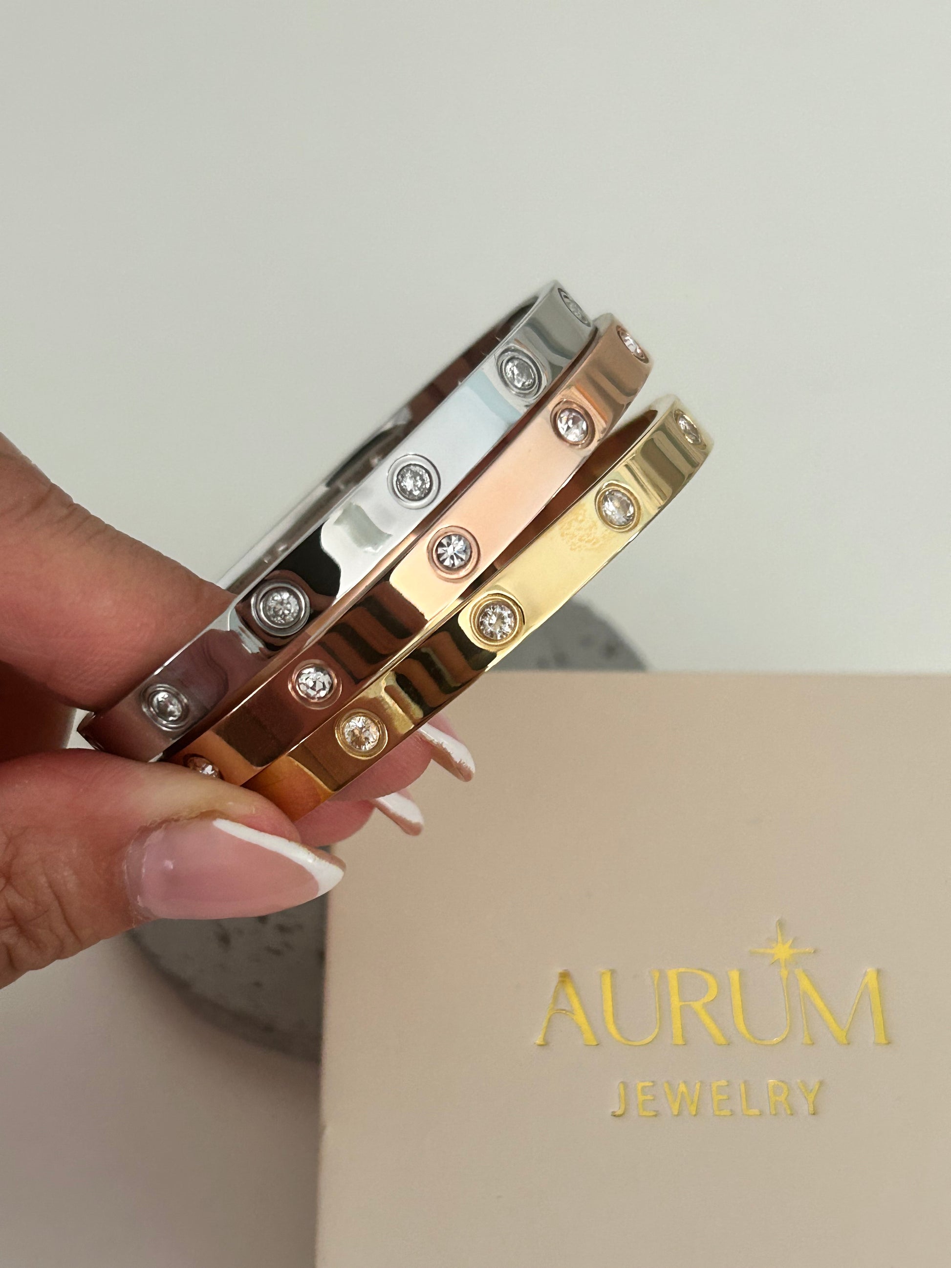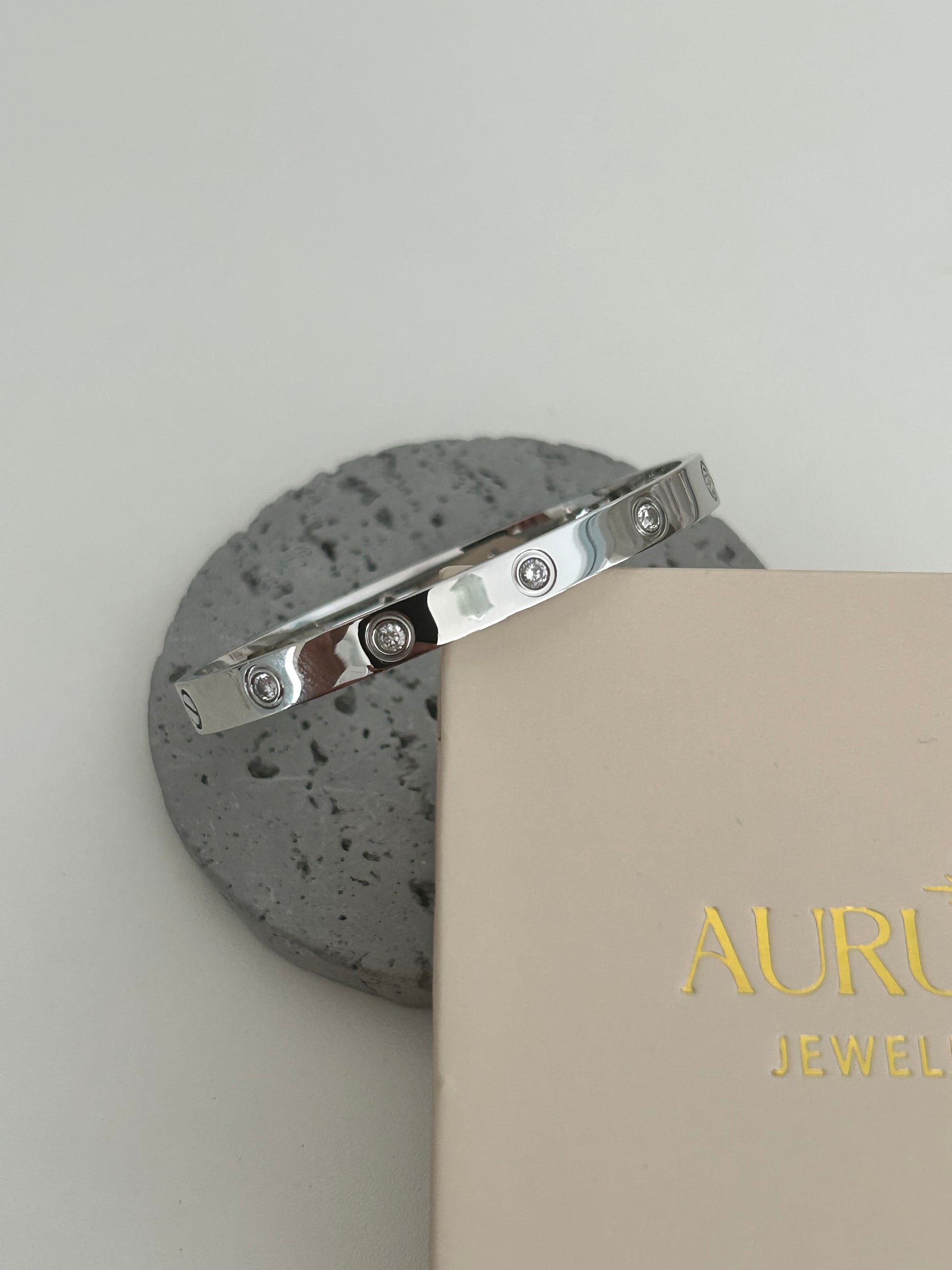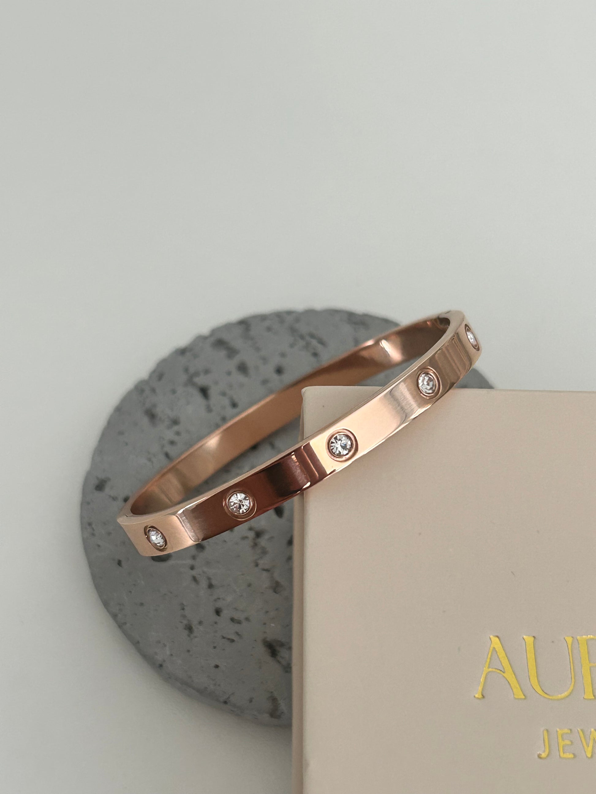 Meet "Amelia", our Love bracelet with cz stones – a timeless piece designed with care. This bangle is 18K gold plated over stainless steel. With a 6 cm diameter, it's a one-size-fits-all bangle.