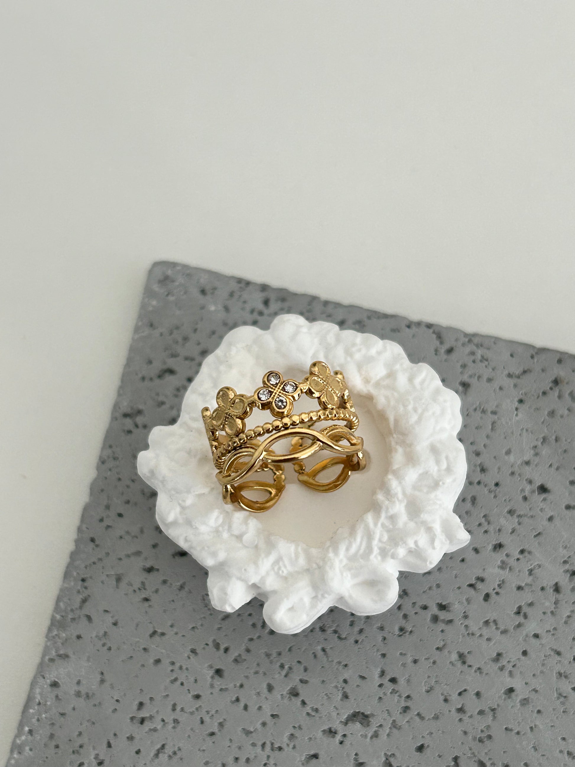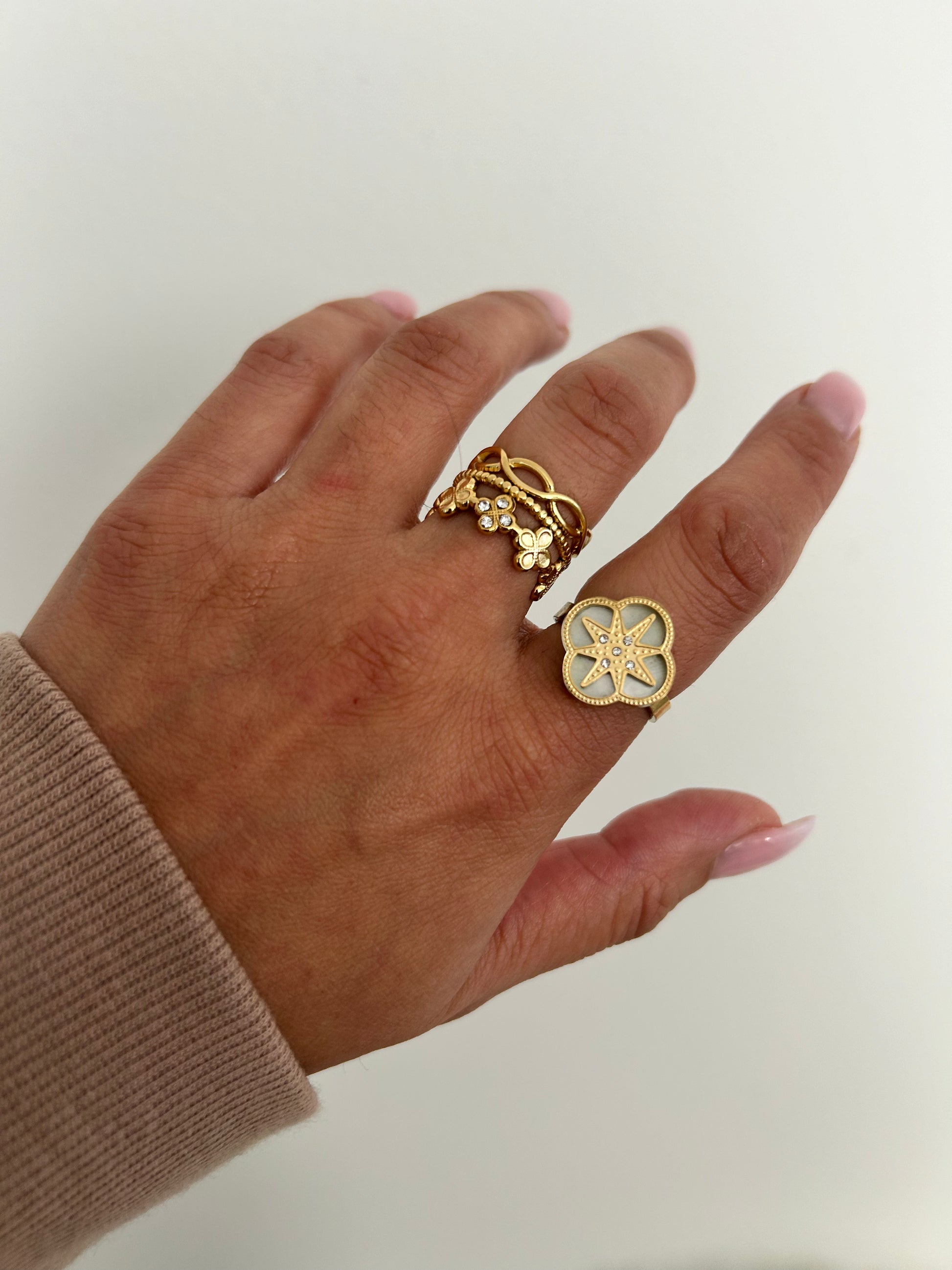 Introducing the Iram ring, an Adjustable Gold sparkle Clover Ring and a versatile addition to your jewelry collection. Crafted with adjustable gold, this ring offers a perfect fit for every finger. With its elegant sparkling stone clover design and versatility, this ring is perfect for any occasion. Elevate your style with the Iram ring.