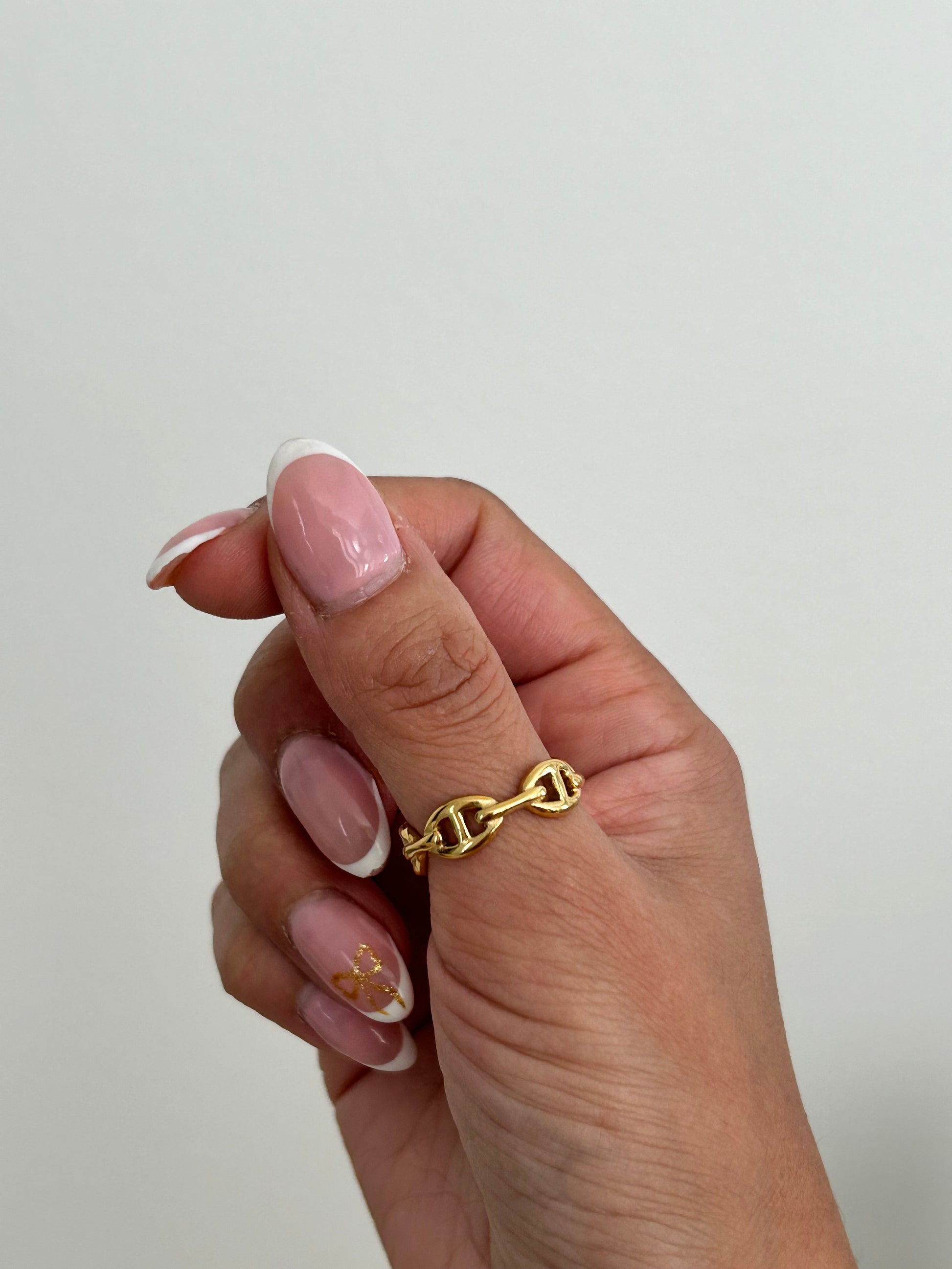 Bold yet refined, the Auréa Link ring brings modern elegance to a timeless design. Featuring an open chain-link motif, it’s crafted from durable stainless steel and finished with a luminous 18K gold plating for a rich, lasting shine.