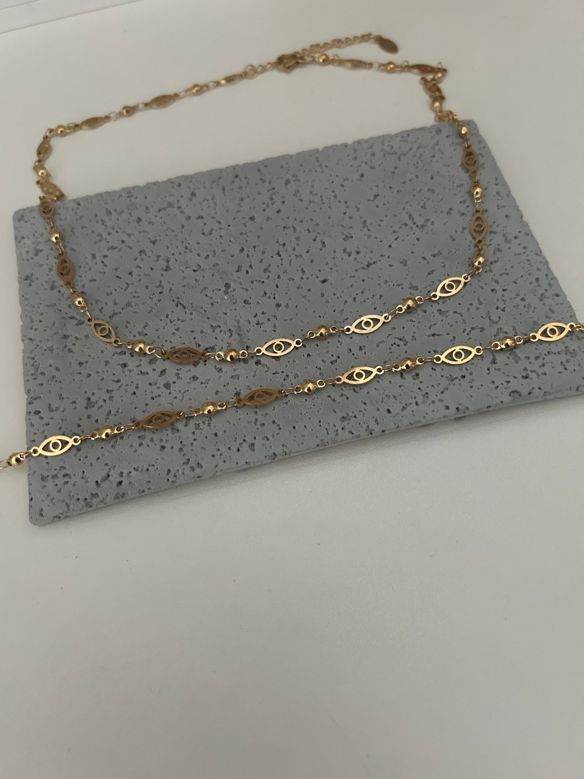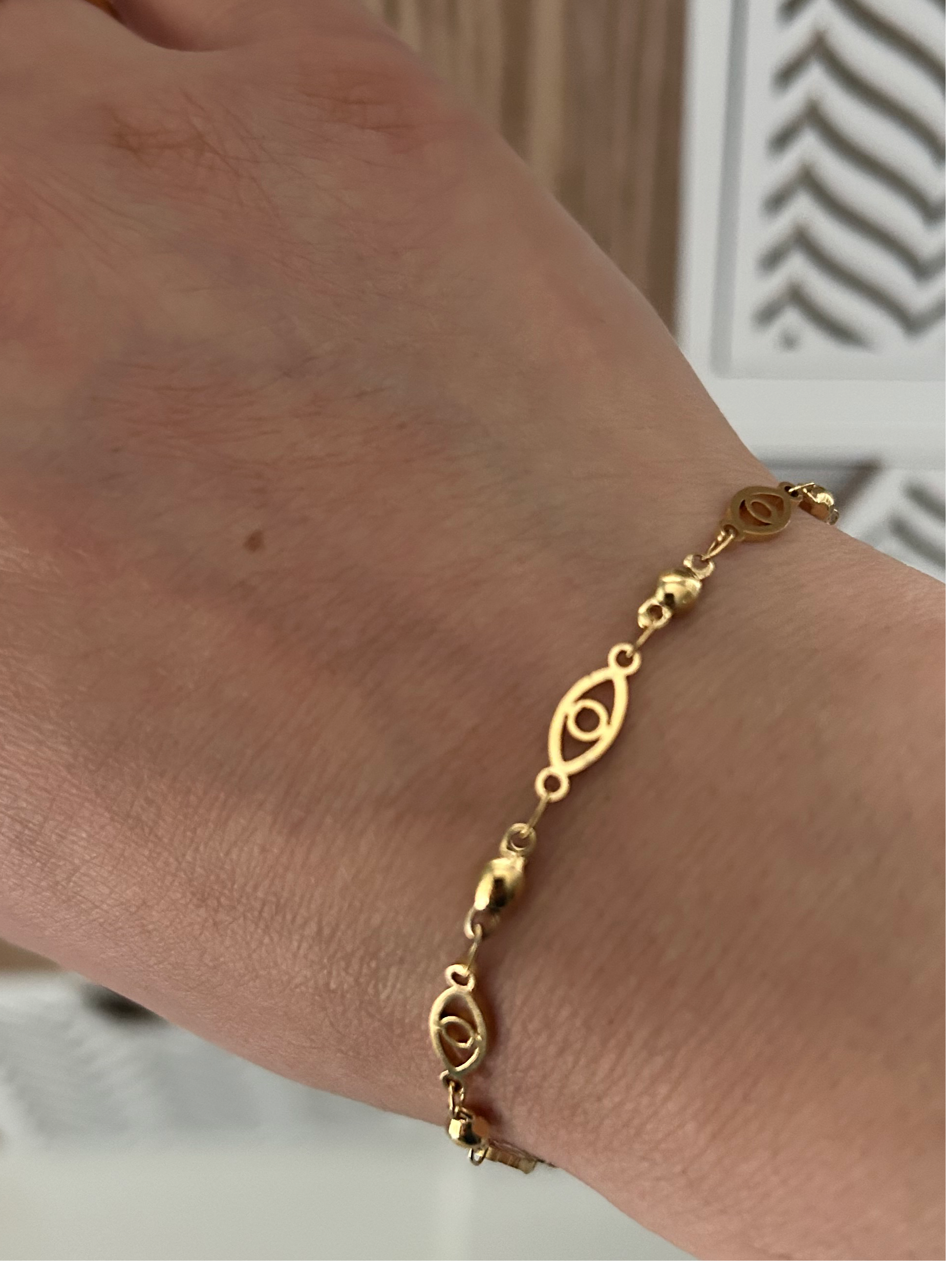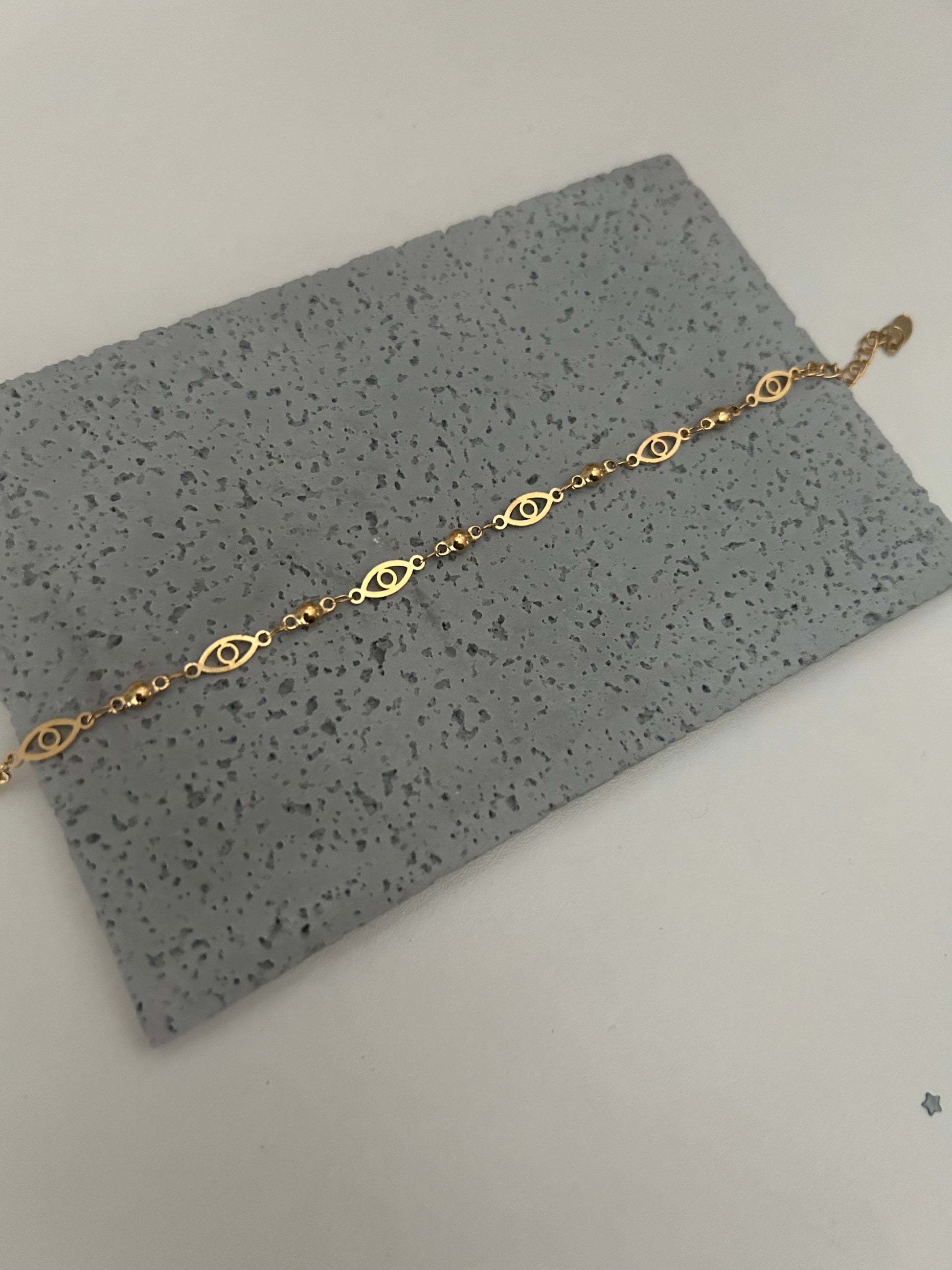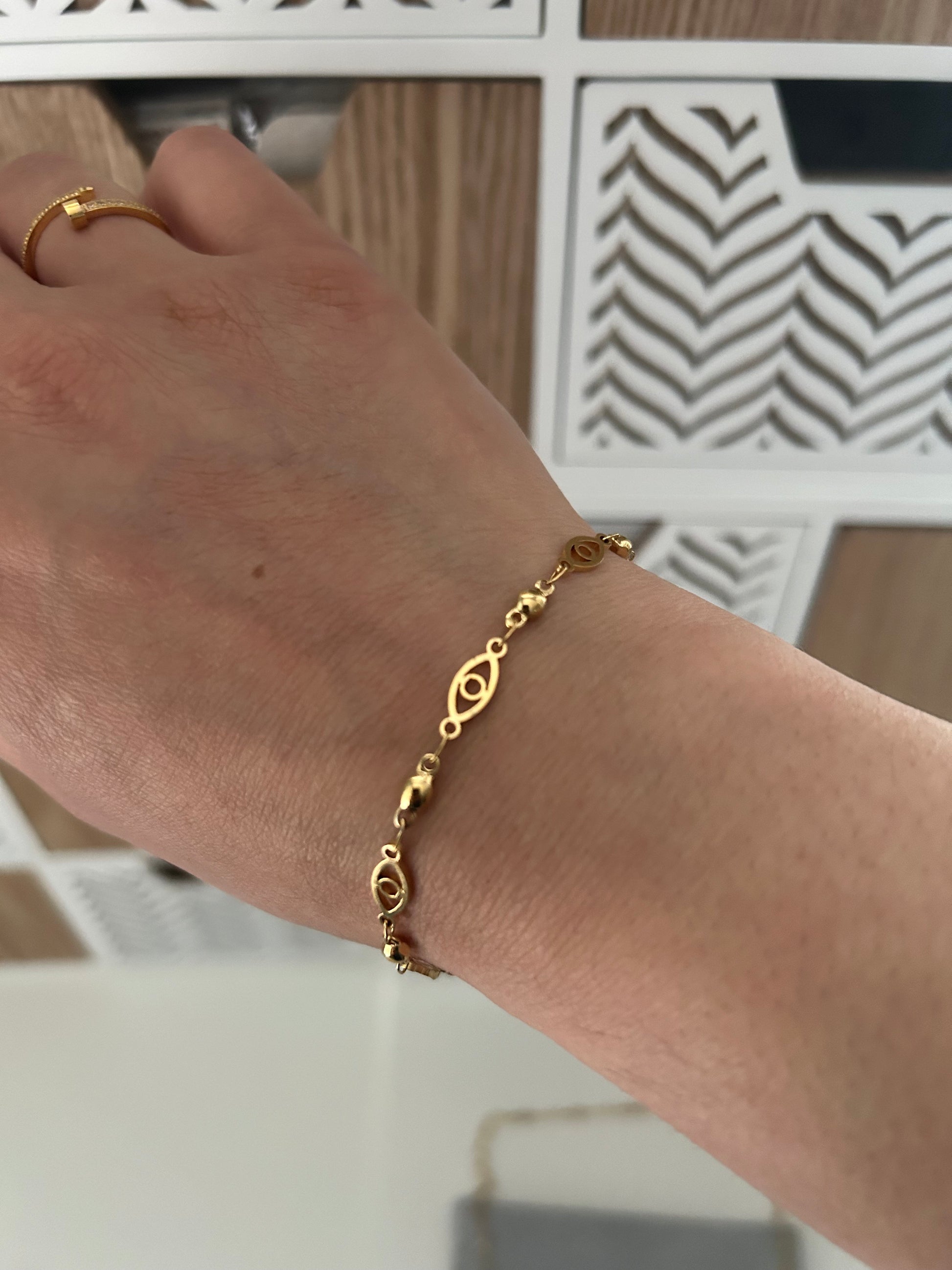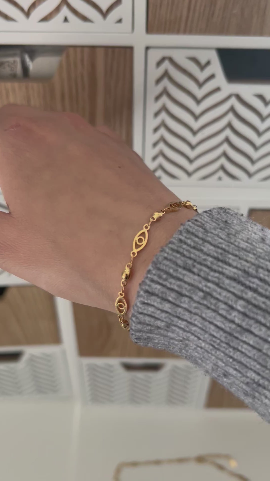 Meet the Keane Gold Evil eye Chain Bracelet! It's your new go-to for adding a touch of timeless charm to any outfit. Crafted from 18K gold plated stainless steel, it's simple yet stunning.