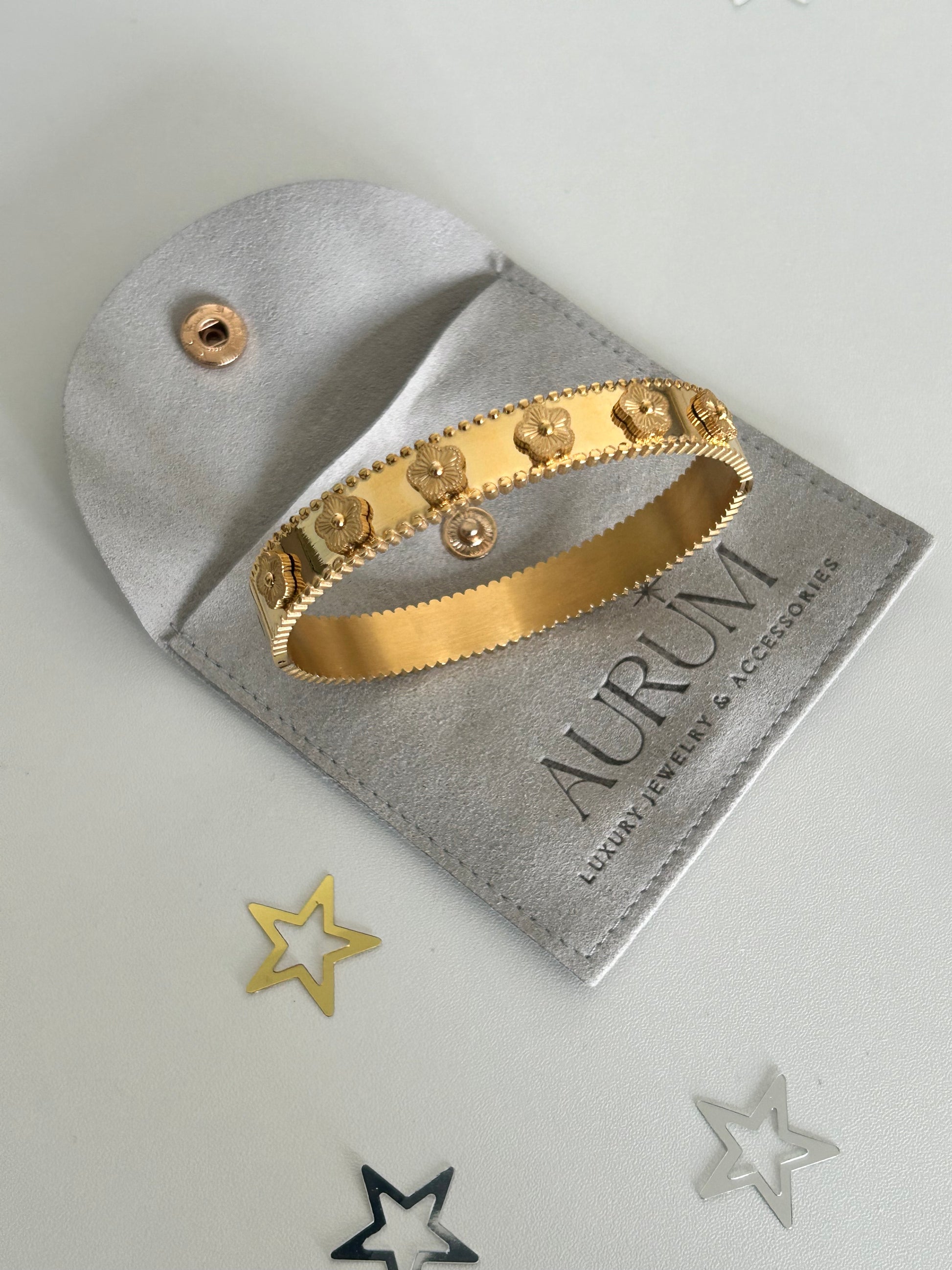 Add an element of luck and glamour to your wardrobe with our Lolita Gold Flower Bangle. The gold flower design will catch the eye and make a bold statement. Perfect for those who like to take risks and stand out from the crowd!