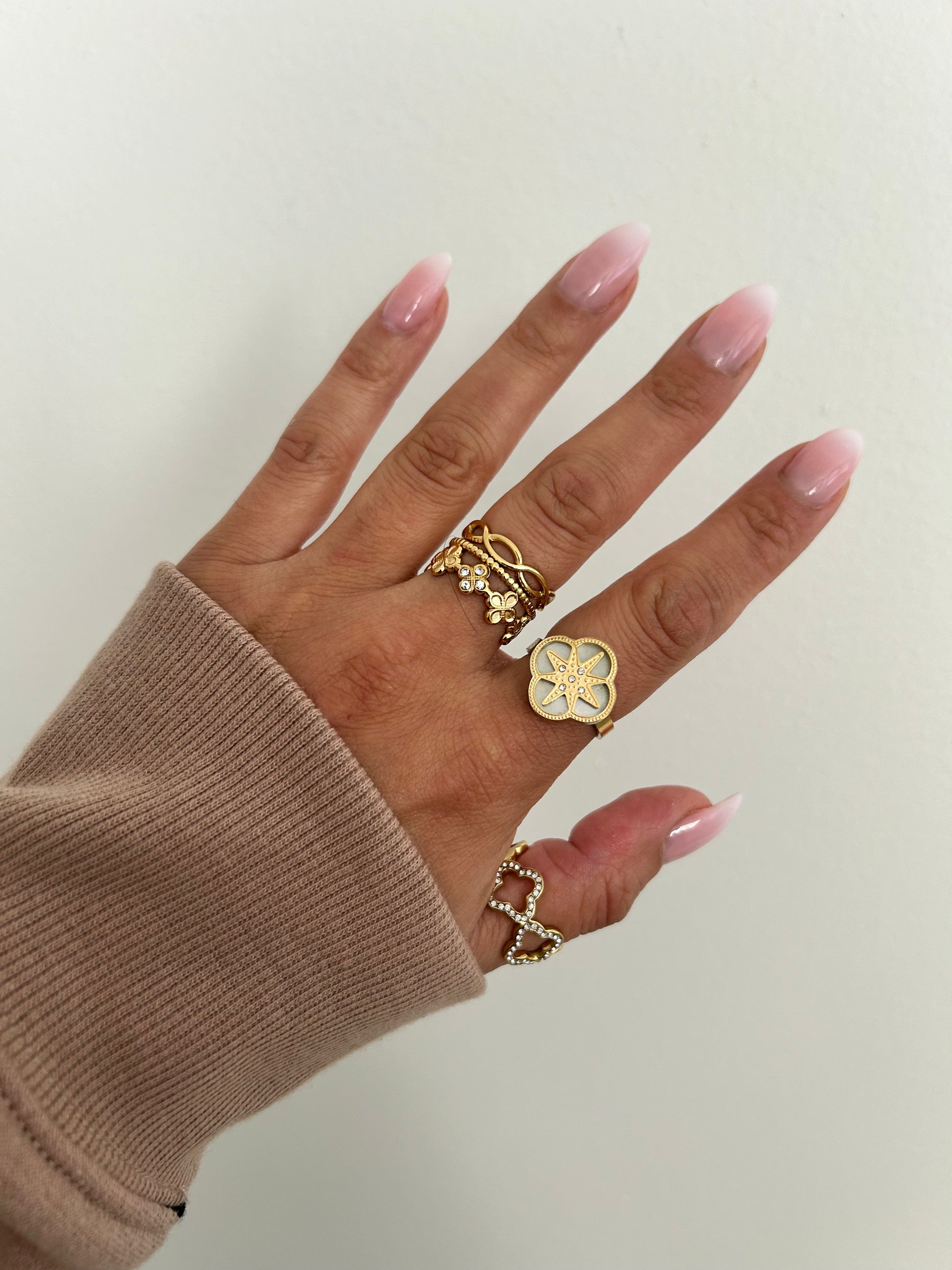 Introducing the Maha ring, an Adjustable Gold sparkle Clover Ring and a versatile addition to your jewelry collection. Crafted with adjustable gold, this ring offers a perfect fit for every finger. With its elegant sparkling stone clover design and versatility, this ring is perfect for any occasion. Elevate your style with the Maha ring.