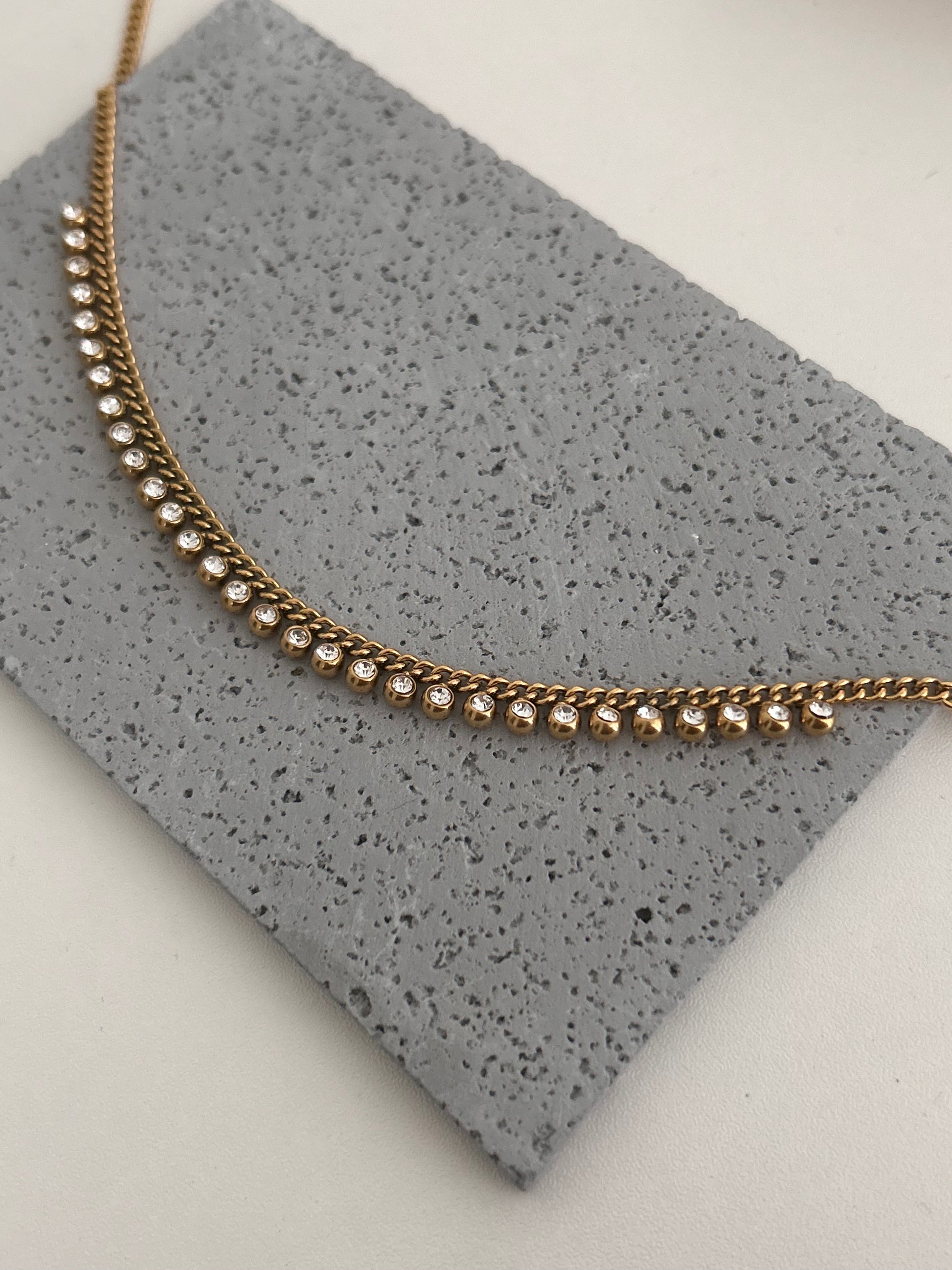 Indulge in timeless elegance with the Mala Necklace, our gold crystal charm necklace. This exquisite fusion of gold and cz rhinestones exudes sophistication and allure, elevating any ensemble. Be the center of attention with this radiant piece.