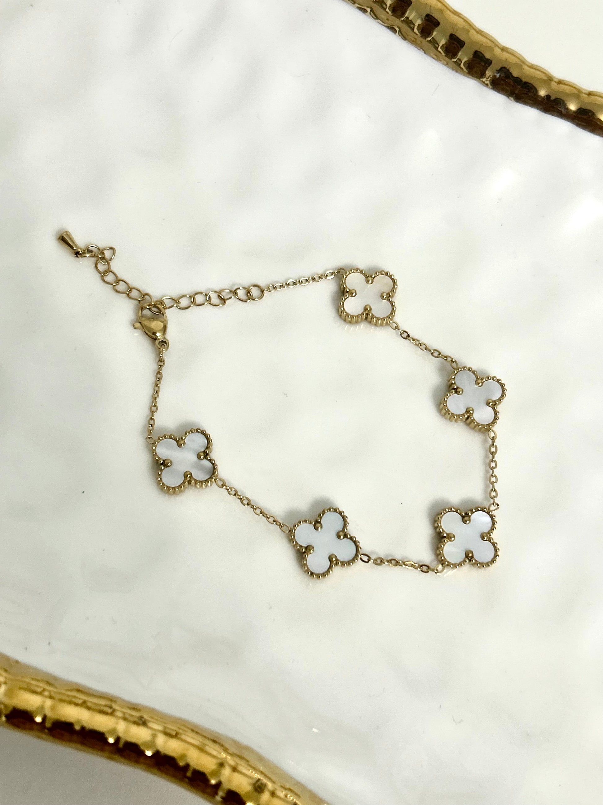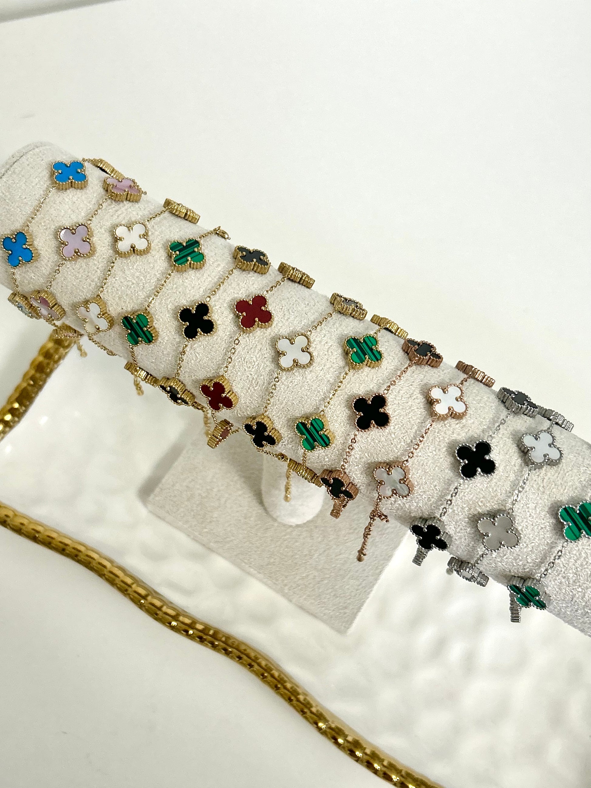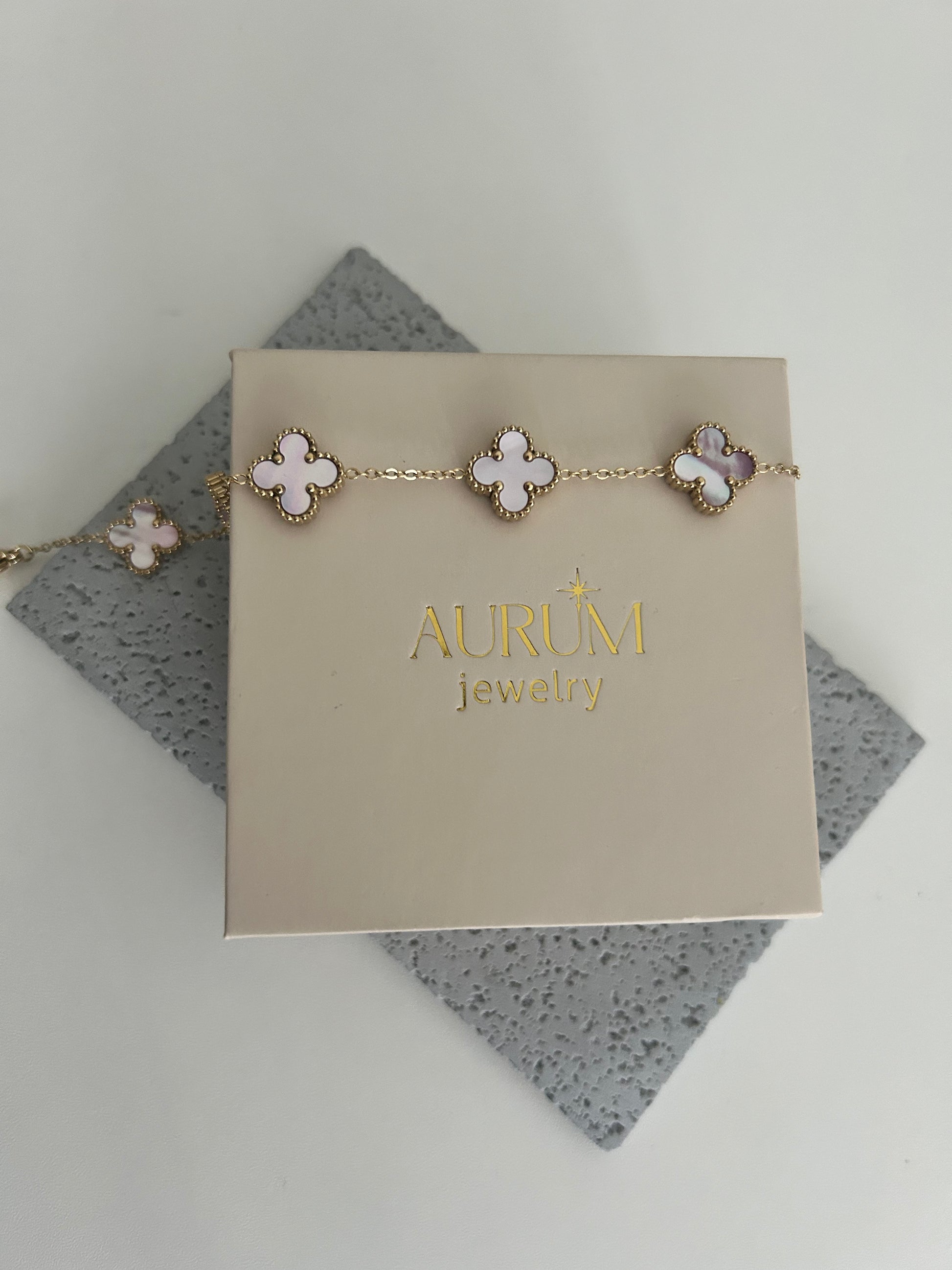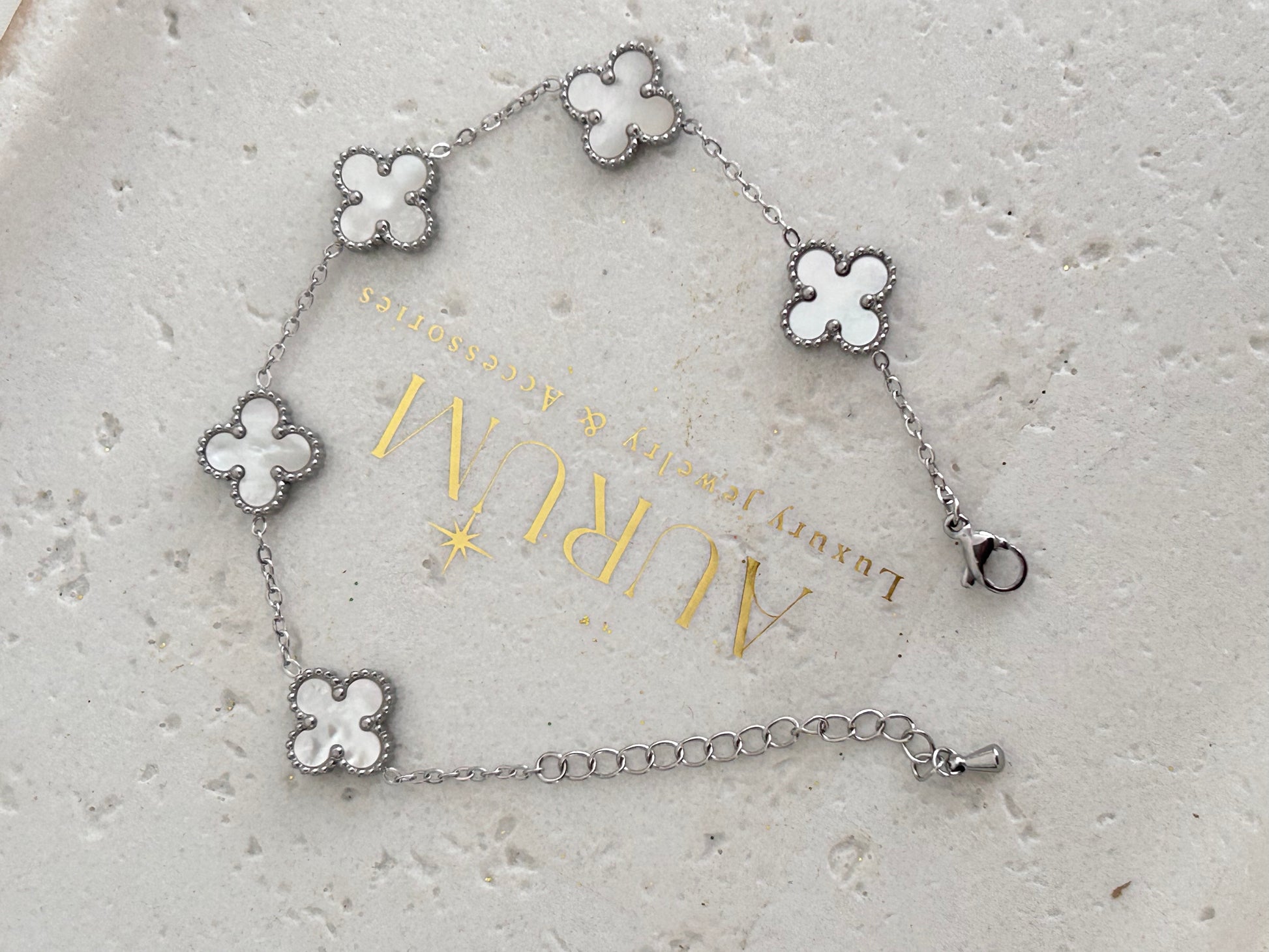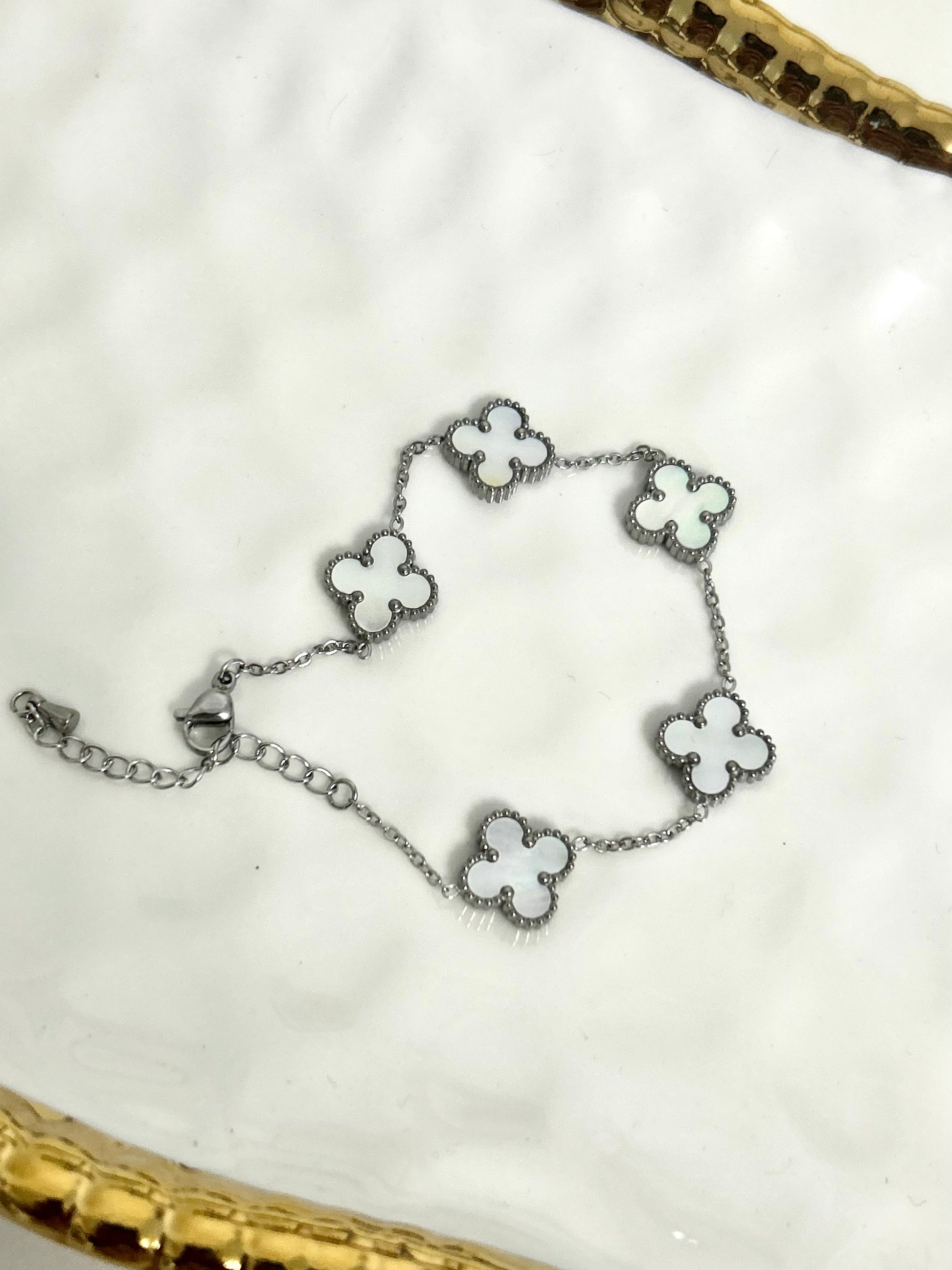 This grey mother of pearl four leaf clover bracelet is beautiful, looks lovely with other bracelets or alone. The grey mother of pearl is very pretty it almost takes on whatever colour you are wearing. As well my order arrived in a lovely packaged with great attention to detail, absolutely beautiful!