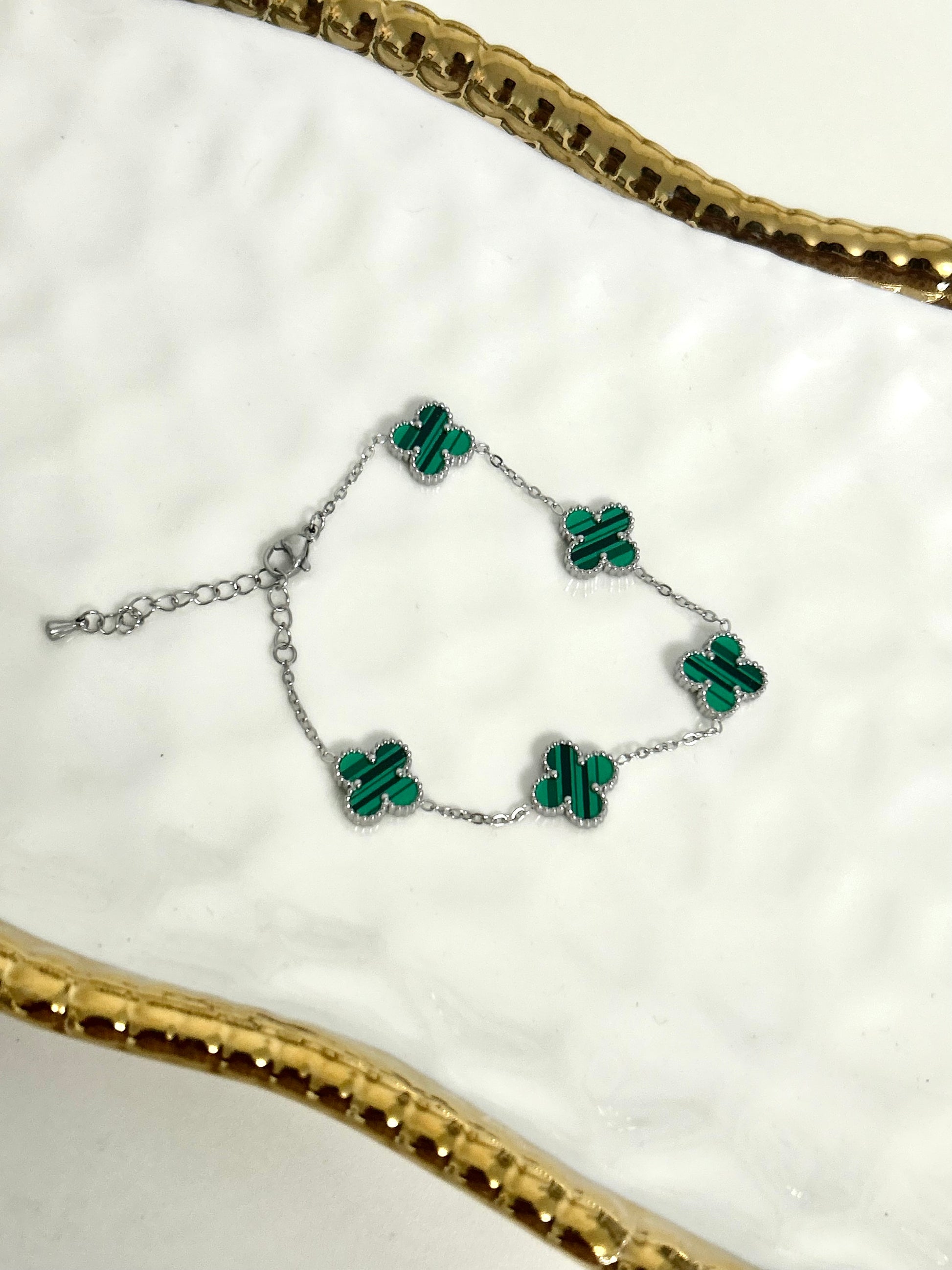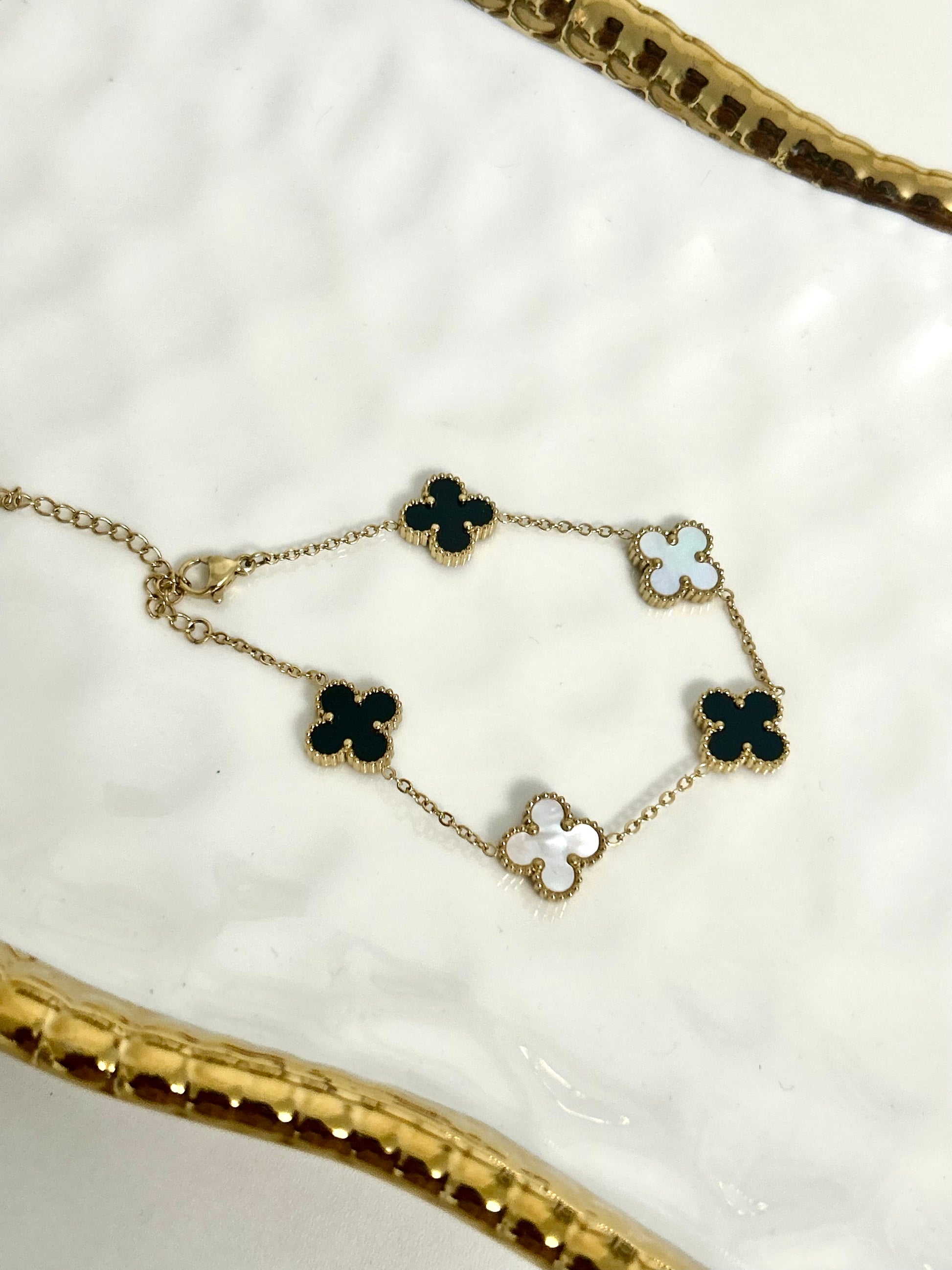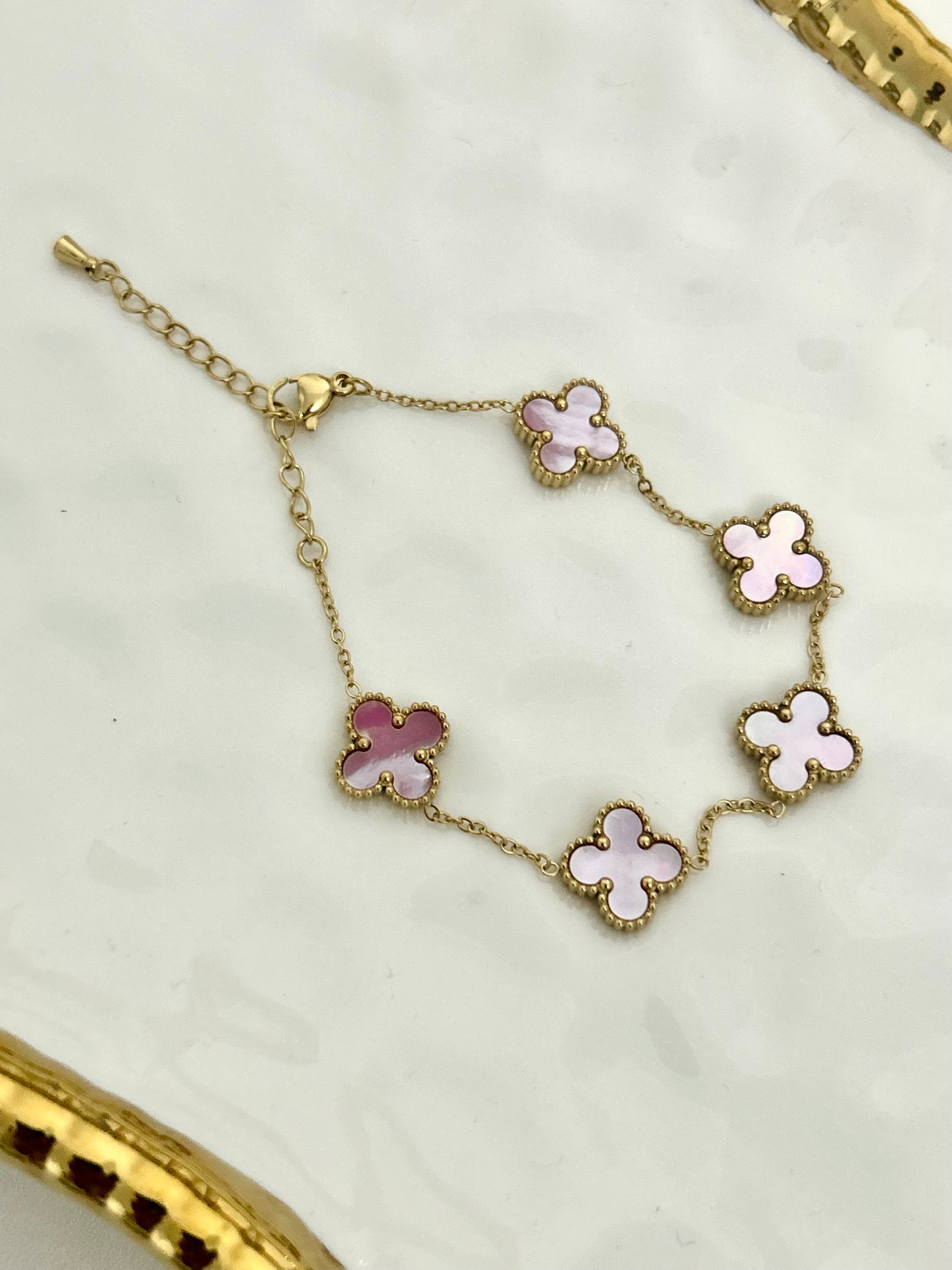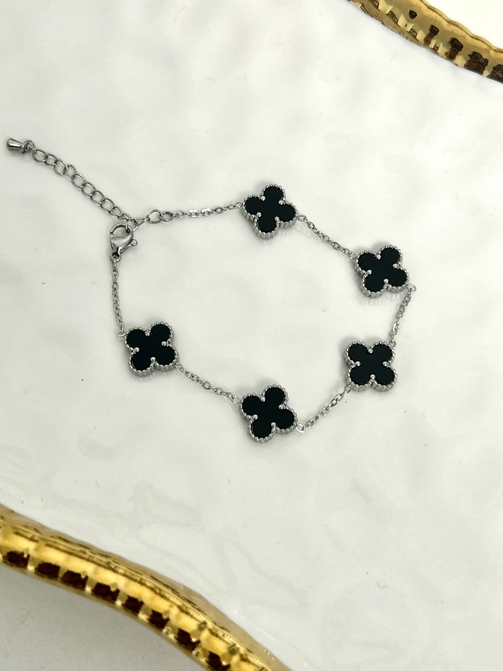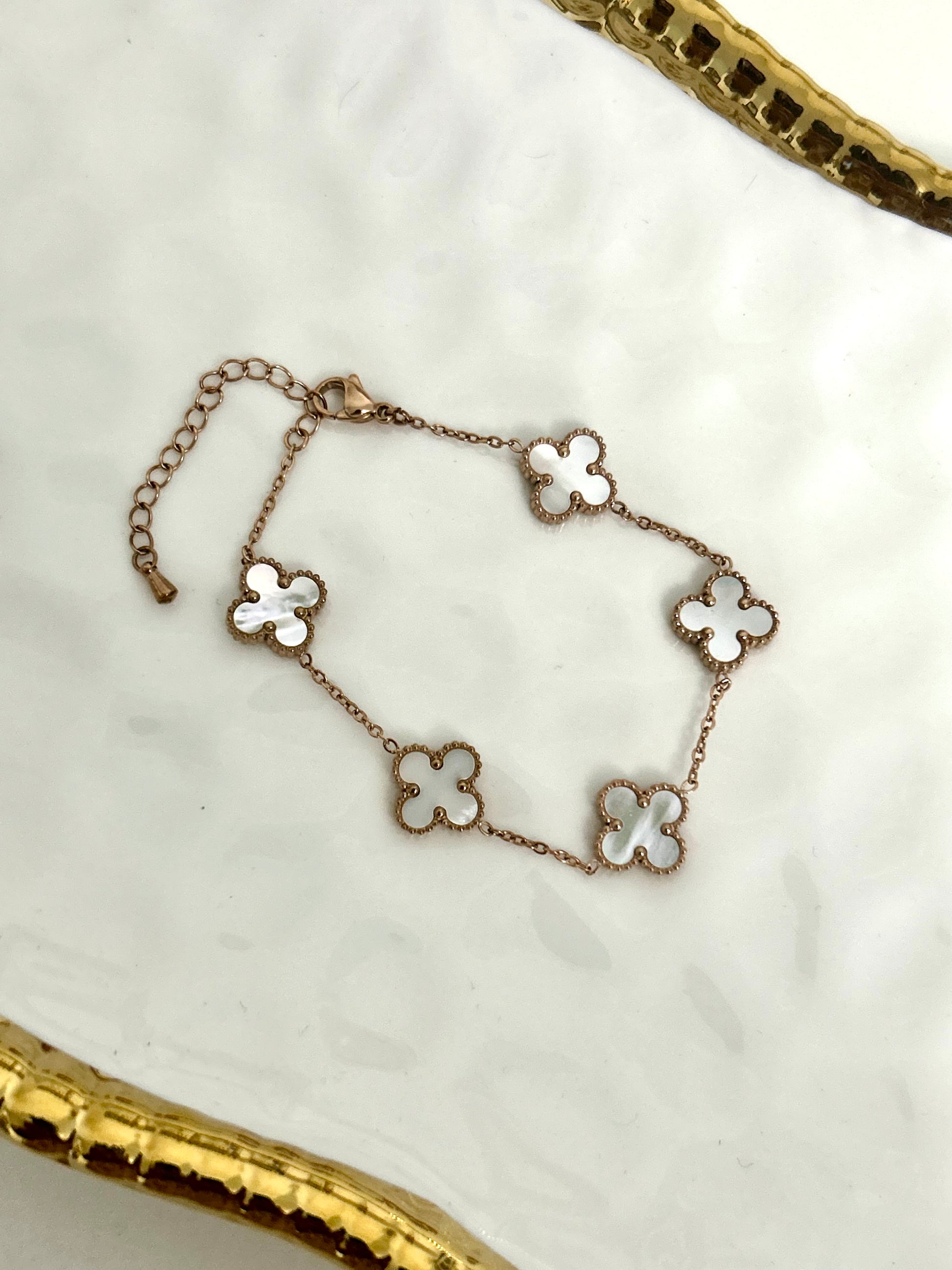 This grey mother of pearl four leaf clover bracelet is beautiful, looks lovely with other bracelets or alone. The grey mother of pearl is very pretty it almost takes on whatever colour you are wearing. As well my order arrived in a lovely packaged with great attention to detail, absolutely beautiful!