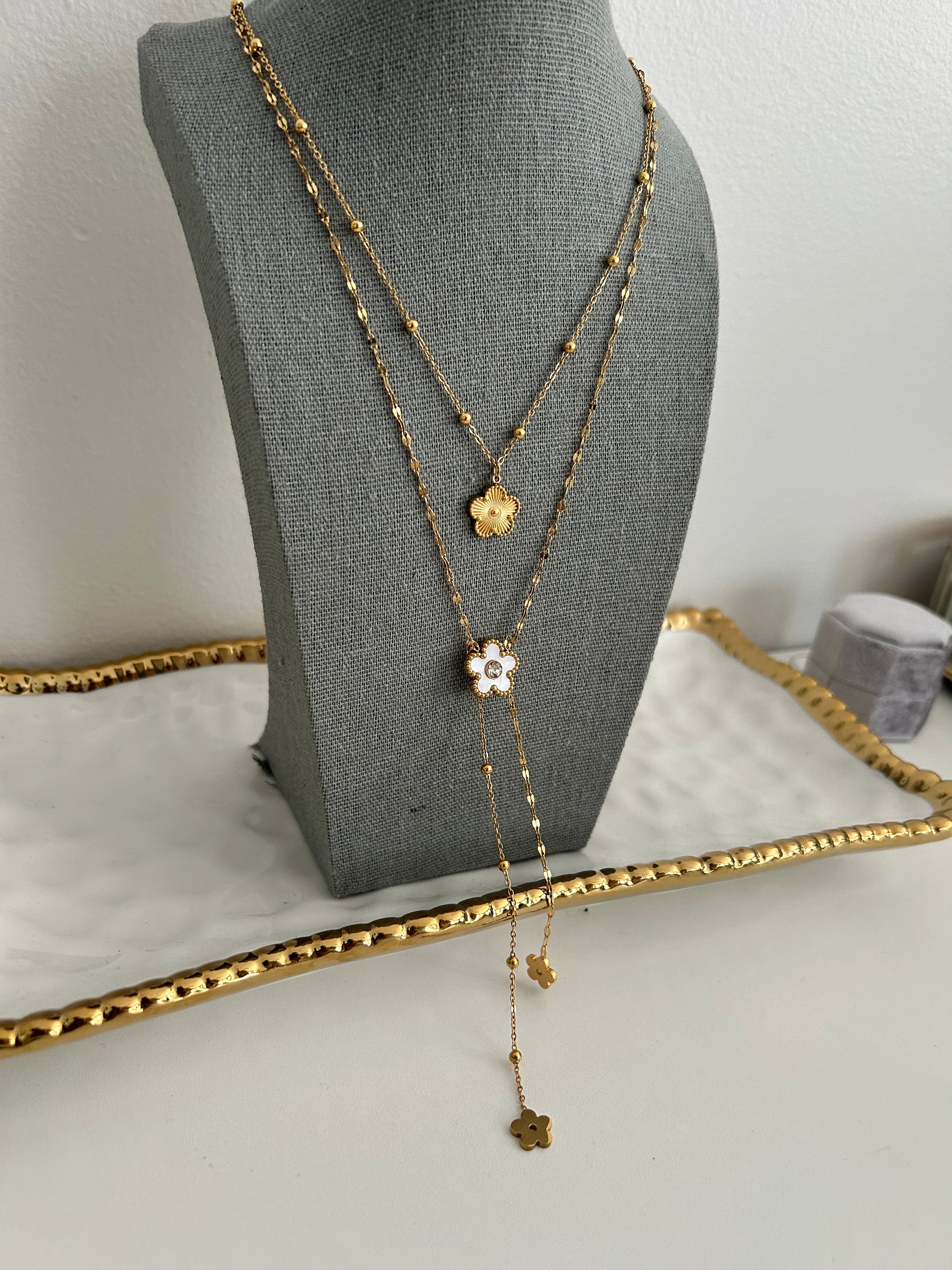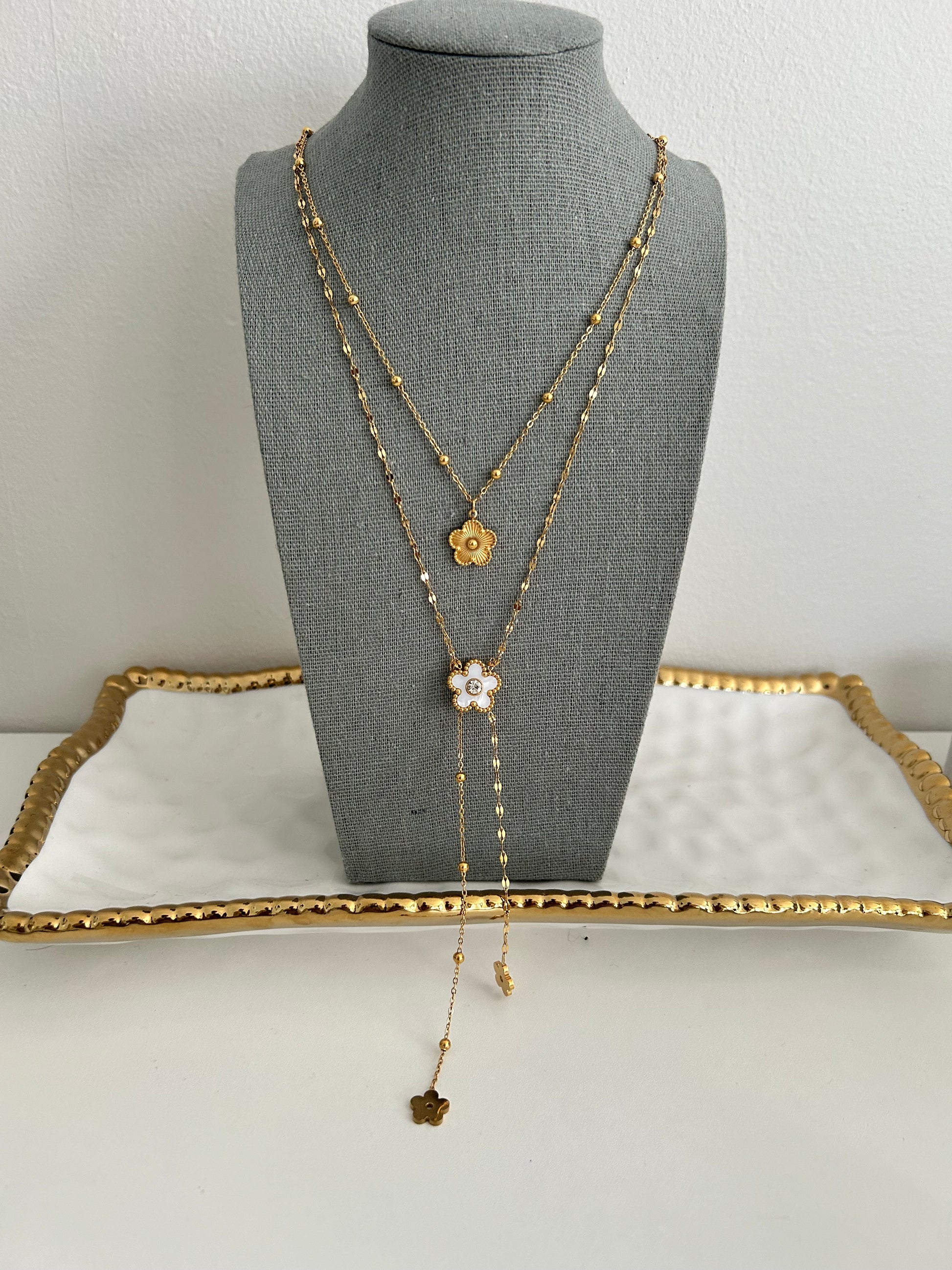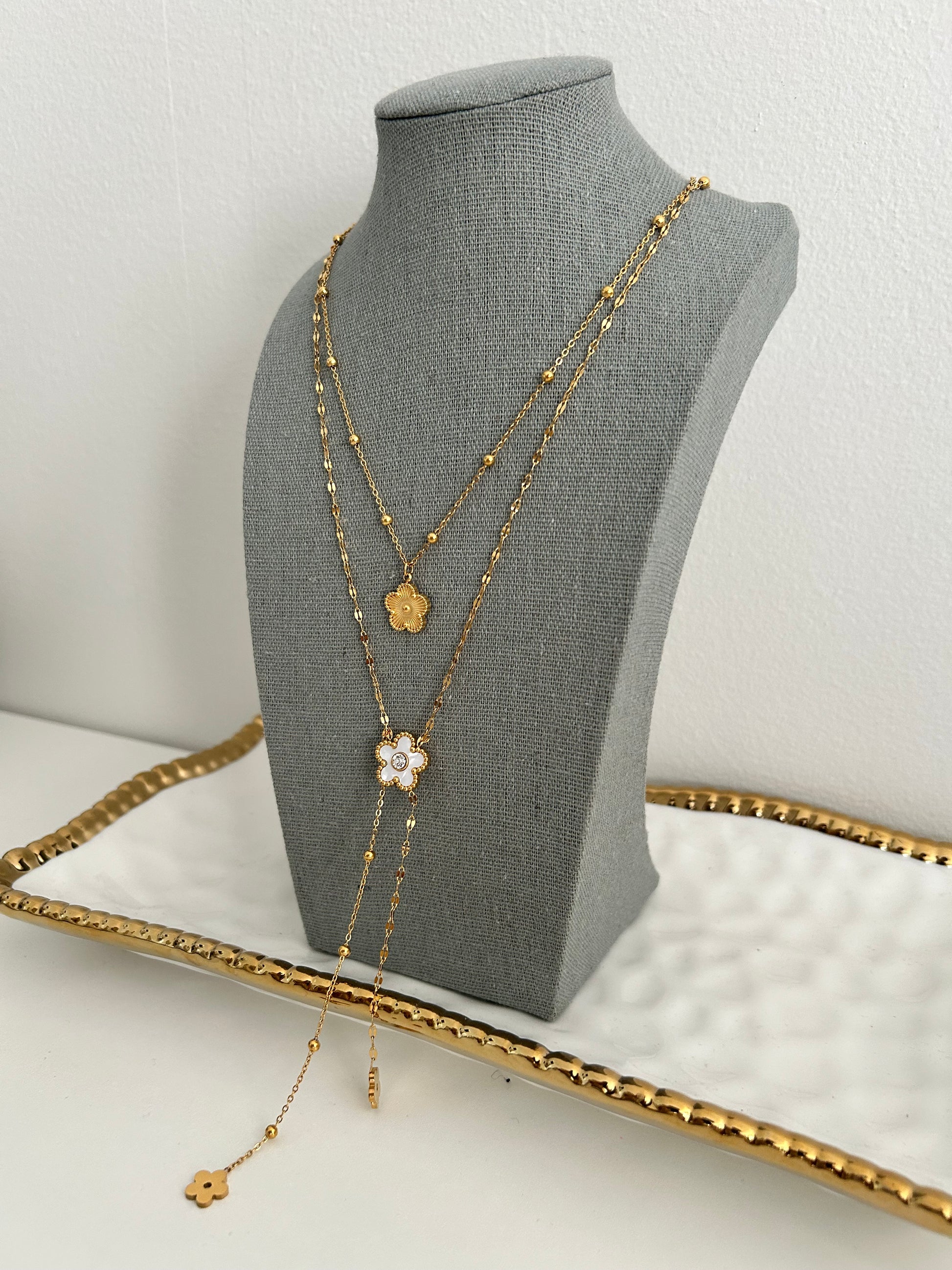 Unleash your inner goddess with the stunning Munira necklace. Featuring a delicate double layered design adorned with mother a striking white flower, this lariat necklace is a true statement piece. Elevate any outfit and radiate confidence. Perfect for any occasion!