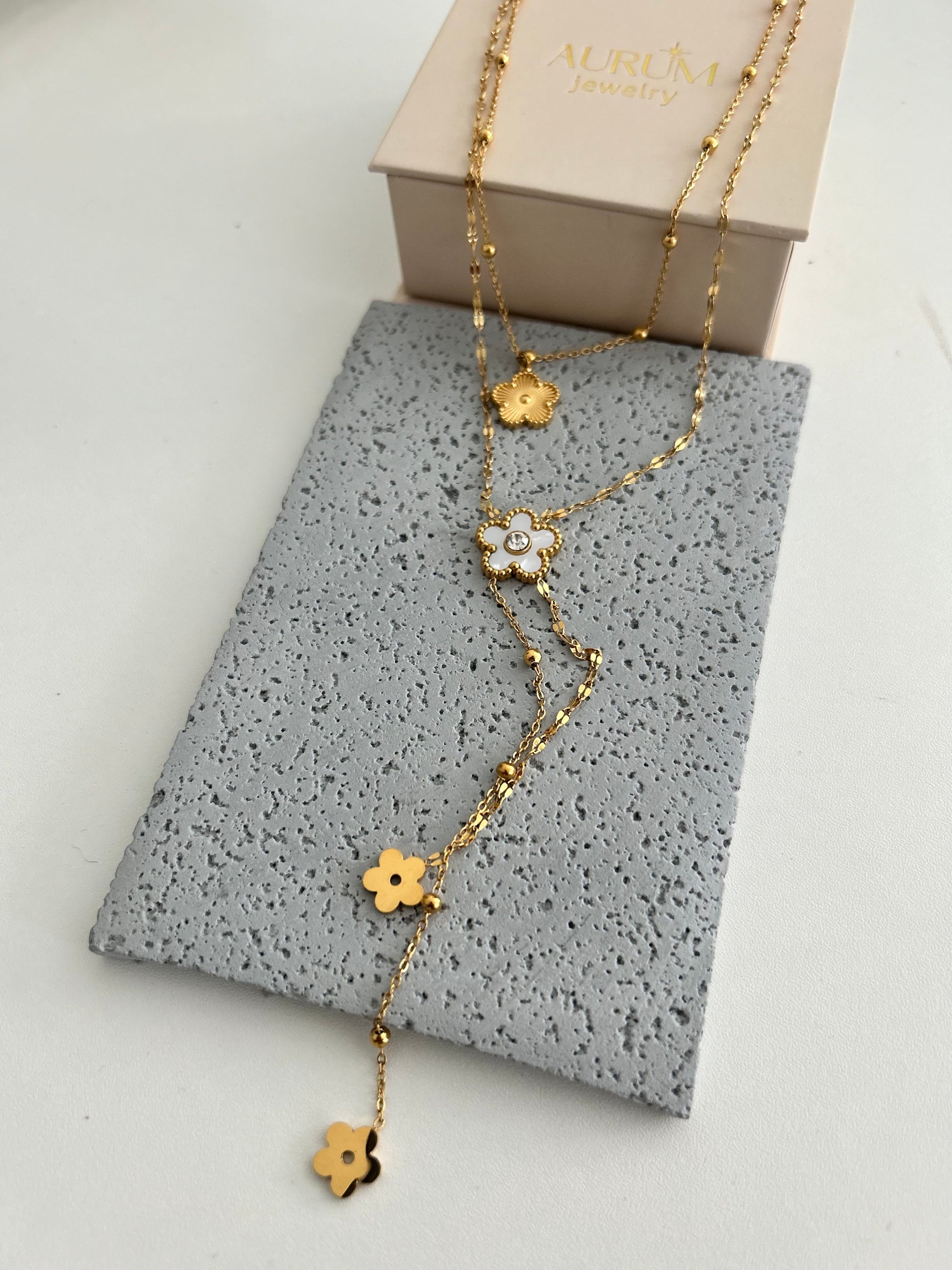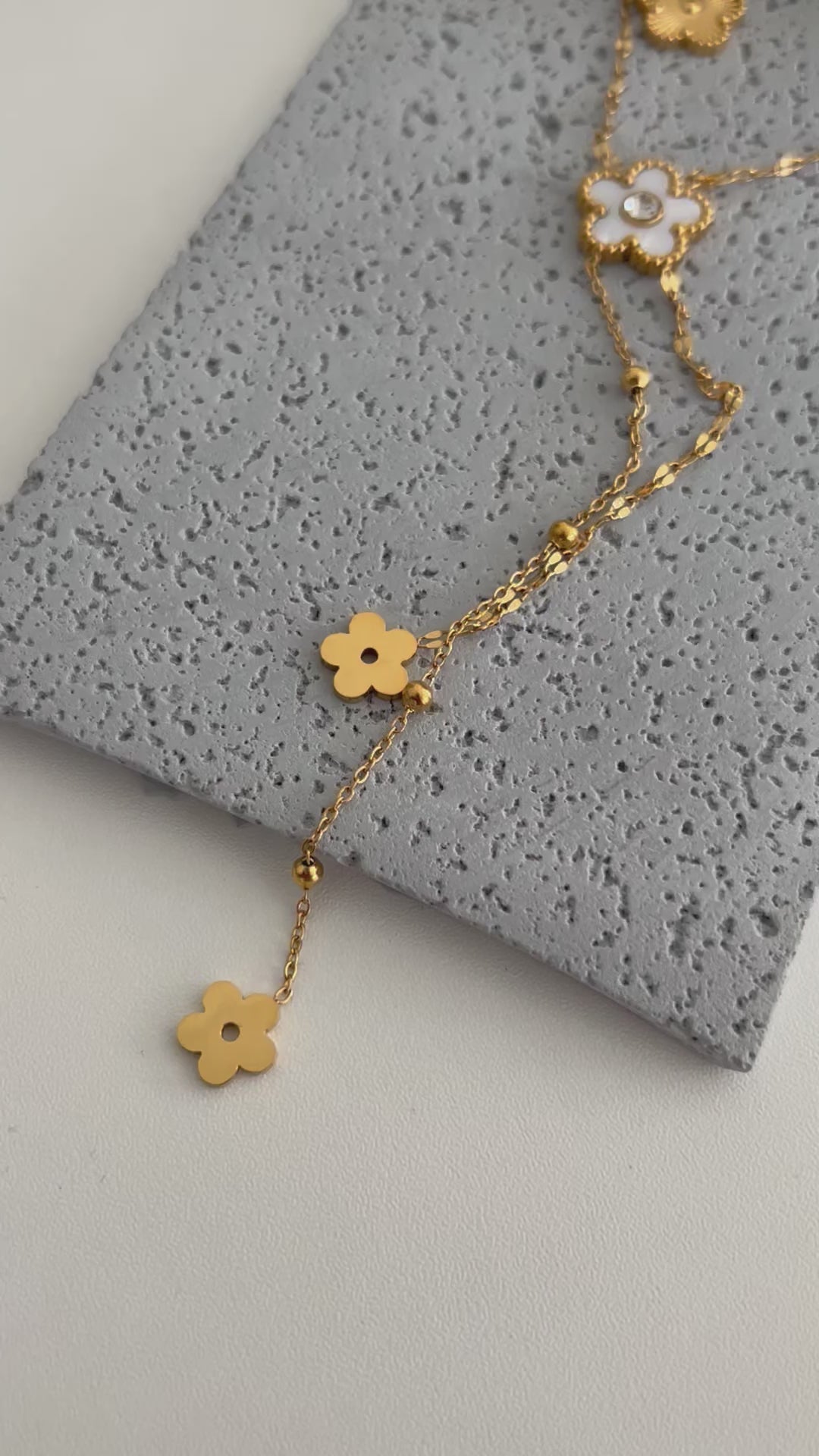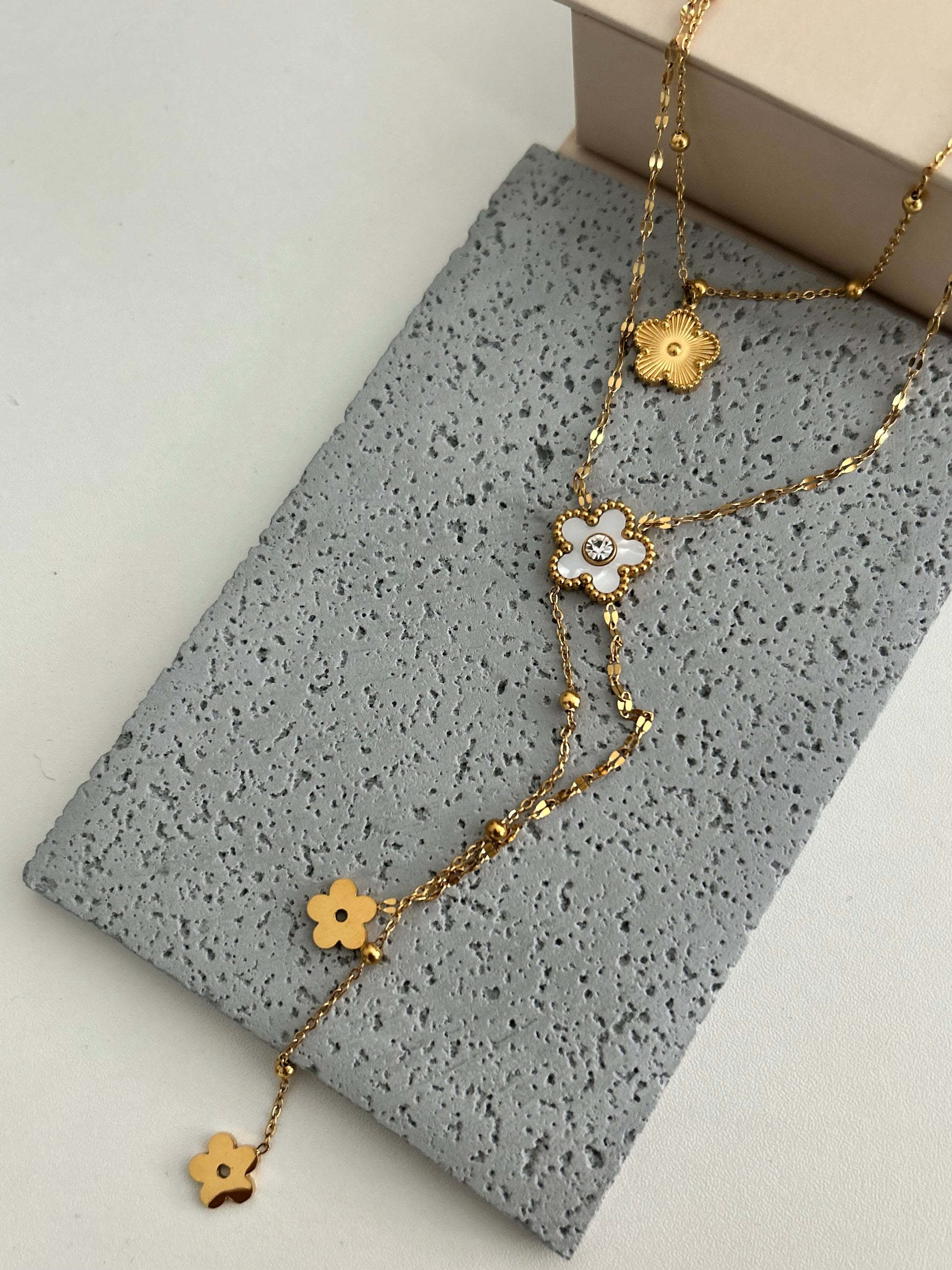 Unleash your inner goddess with the stunning Munira necklace. Featuring a delicate double layered design adorned with mother a striking white flower, this lariat necklace is a true statement piece. Elevate any outfit and radiate confidence. Perfect for any occasion!